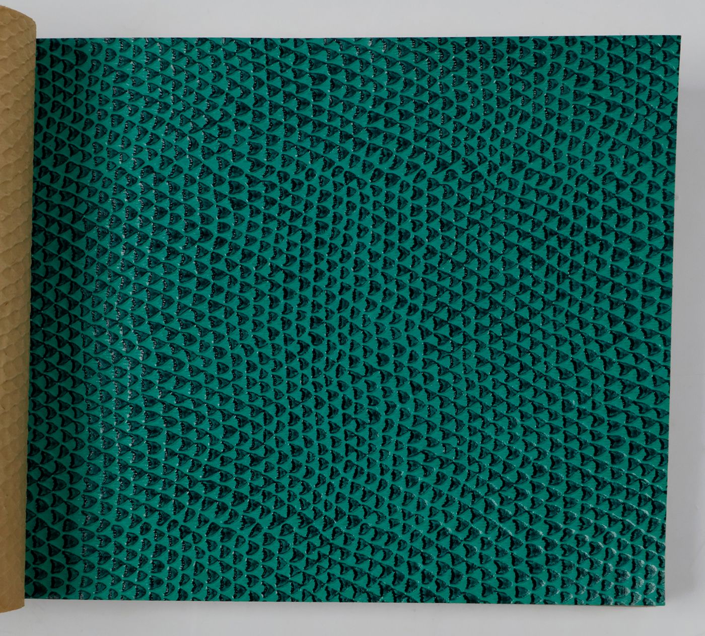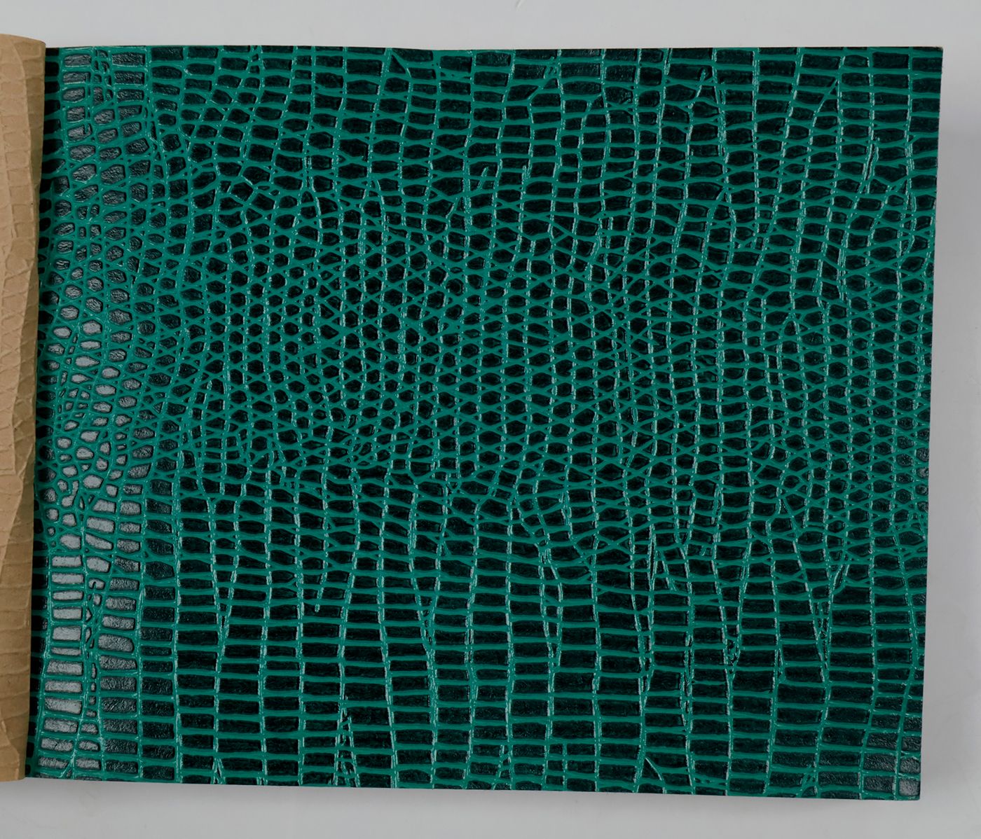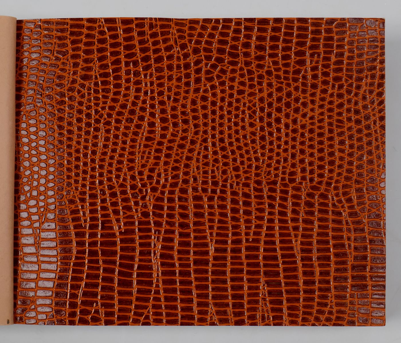 An unusual catalogue, of "Exclusive Designs", containing glossy paper samples (designs for wallpaper, book covers, etc.) chiefly showing reptile-skin patterns, brick-wall and pebbled patterns, and several other embossed patterns, in a variety of colours. The firm, Bénard, produced Gaufres, Indiennes, Micaces, Brocarts, Ors, en Rames ou en Bobines. Suédine, Velours, Cellodermes" [waffle fabrics, Indian prints, mica fabrics, brocades, gold fabrics, in rolls or spools. Suede, velvet, celloderm], this catalogue showing celloderm paper. Individual samples are printed in colour, monochrome, or gold. It is interesting to see the effect of different colours on the same graphic design. The samples are individually numbered (stamps on versos; numbers in a rather random order). Included: a cyclostat price list on yellow paper, recording size, minimal number of copies, etc., with some additions by hand. A very good, unmarked copy.