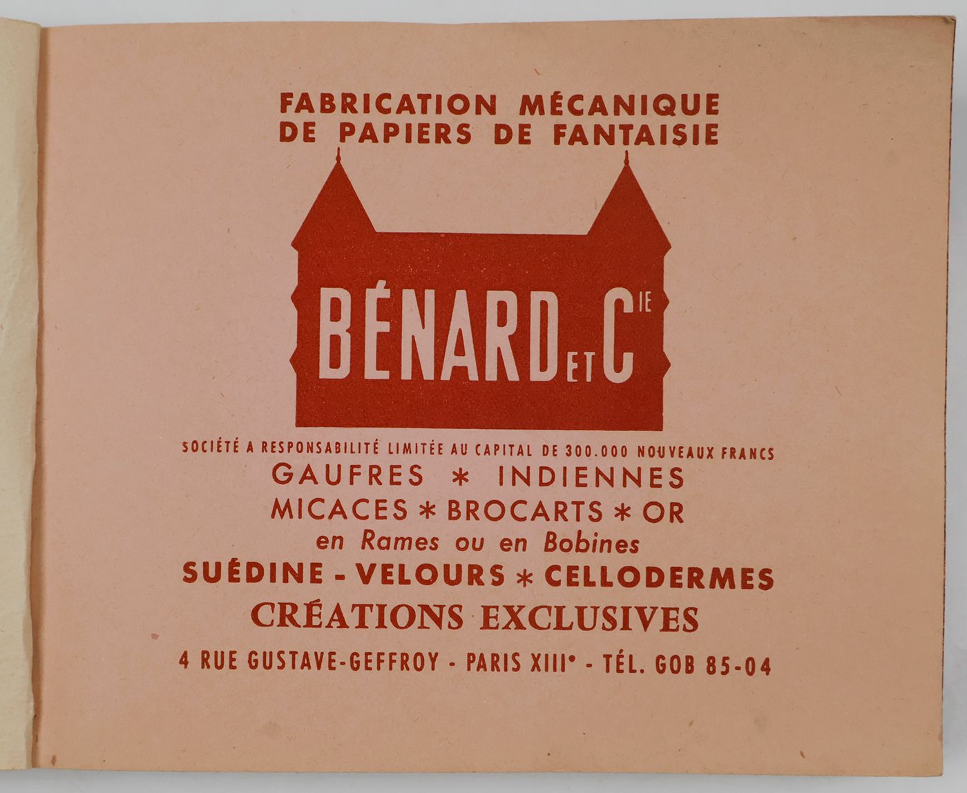 Paris, Bénard et Cie, [ca. 1968]. Oblong folio (11.3 x 16.3 cm). Title page, 102 paper samples. Stiff, patterned wrappers. Front wrapper with red and gilt label (with Bénard logo), mounted.