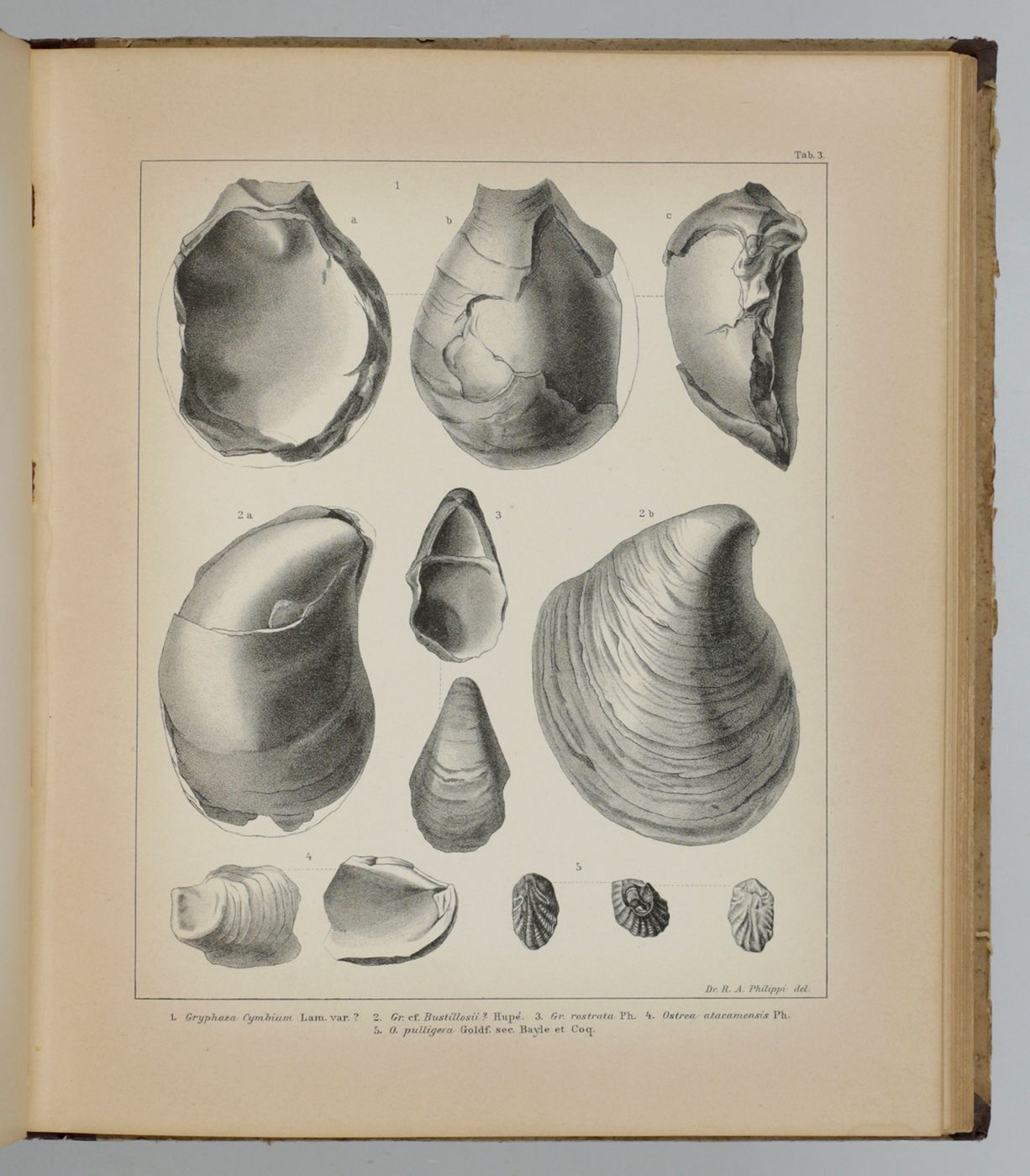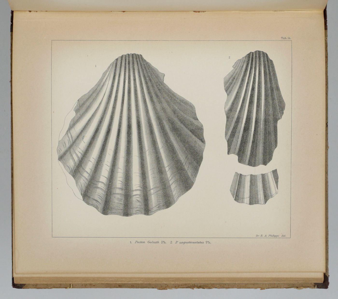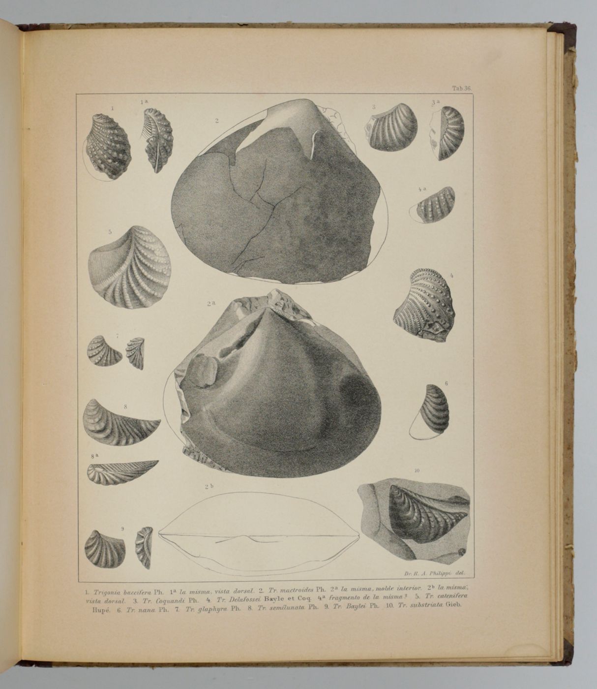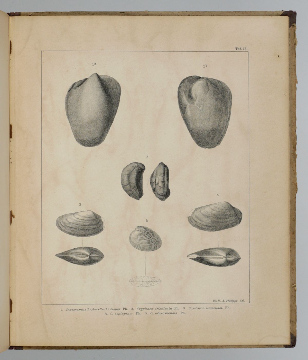 Rare first, Spanish publication of the Mesozoic fossils of Chile. Nearly all plates show molluscs, in particular bivalves, of which many are described and illustrated here for the first time. Rudolph Amandus "Rudolfo Amando" Philippi (1808-1904) was a prominent German malacologist and ornithologist who emigrated to Chile and continued his zoological researched there. He is the author of many important publications in malacology and conchology. A German edition was published too - it is rare too. Pictorial, palaeo-malacological bookplate of Jeffrey D. Stilwell mounted on the front pastedown. Some wear to spine ends and boards; rear board stained; small, marginal dampstain to the lower edge of the last few plates. Paper a bit toned, as usual. In all a very good, clean copy. Nissen ZBI, 3156.