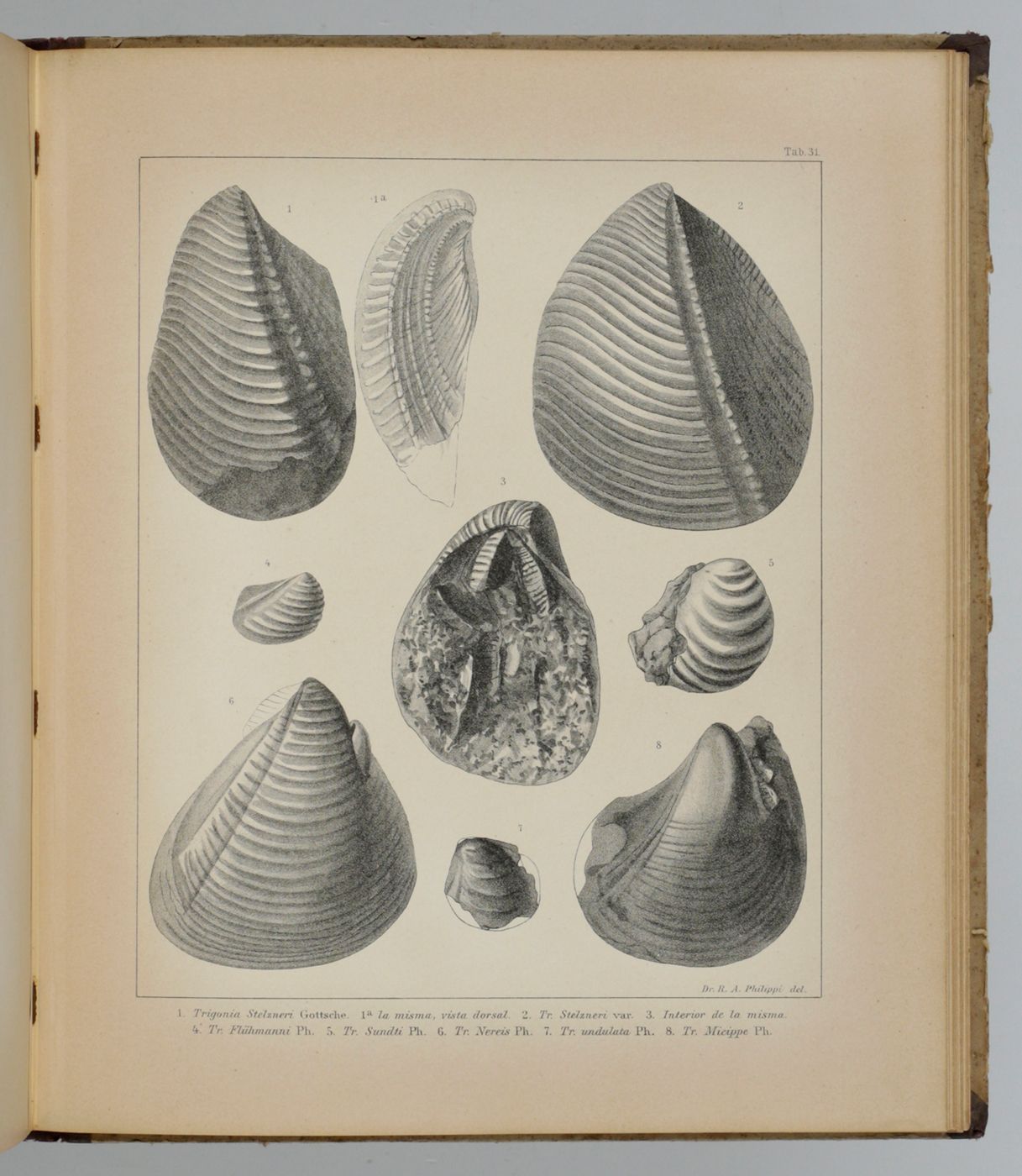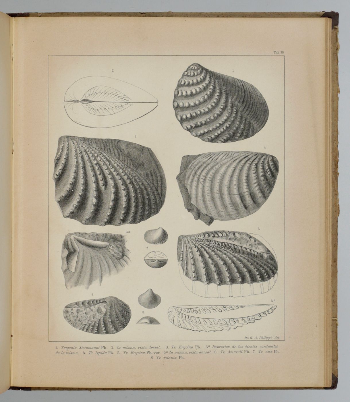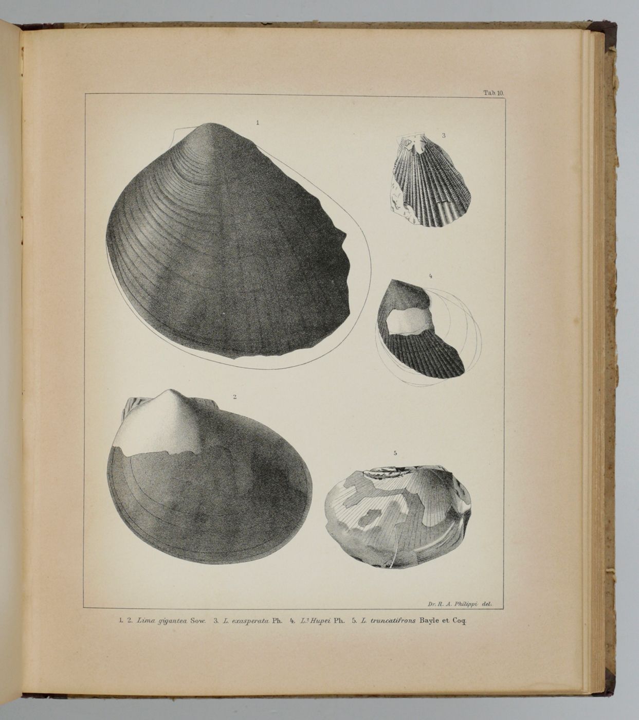Rare first, Spanish publication of the Mesozoic fossils of Chile. Nearly all plates show molluscs, in particular bivalves, of which many are described and illustrated here for the first time. Rudolph Amandus "Rudolfo Amando" Philippi (1808-1904) was a prominent German malacologist and ornithologist who emigrated to Chile and continued his zoological researched there. He is the author of many important publications in malacology and conchology. A German edition was published too - it is rare too. Pictorial, palaeo-malacological bookplate of Jeffrey D. Stilwell mounted on the front pastedown. Some wear to spine ends and boards; rear board stained; small, marginal dampstain to the lower edge of the last few plates. Paper a bit toned, as usual. In all a very good, clean copy. Nissen ZBI, 3156.