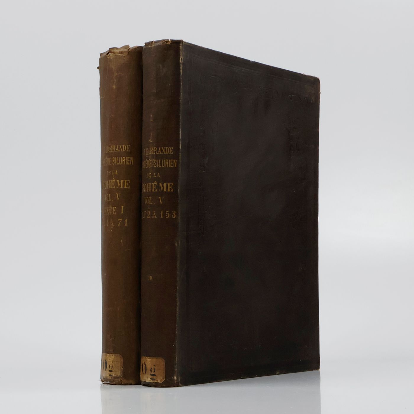 Part of an enormous series on all aspects of Bohemian Silurian and other Palaeozoic fossils. It was privately printed in only 250 copies. See Zittel, and DSB: "From 1840 to his death Barrande collected, described and drew the fossils of the central Bohemian Basin - this area has been called the Barrandian ever since. The strata of this basin are Proterozoic - early Paleozoic in age. At that time 'Silurian' might be applied to strata that today are in the Cambrian, Ordovician, Silurian or Devonian system. The results formed the outstanding monograph 'Système silurien du centre de la Bohème', which appeared in eight parts forming 28 quarto volumes. Because this work is so comprehensive, its drawings so accurate and its descriptions so fine, it is still used as a reference book by palaeontologists". This is the Brachiopoda-section (V of the series), and includes many new species. Present are the complete text and plates. Provenance: Both parts inscribed and signed by the author on the title page, to the "Séminaire de St. Sulpice", and with his "compliments" stamp. Binding worn, top rear hinge of the first volume with a tear; some light toning to the text, otherwise clean. In all a very good, complete copy of this rare work. DSB vol. 1, pp. 468-469; Nissen ZBI, 235; Zittel, pp. 445-456.