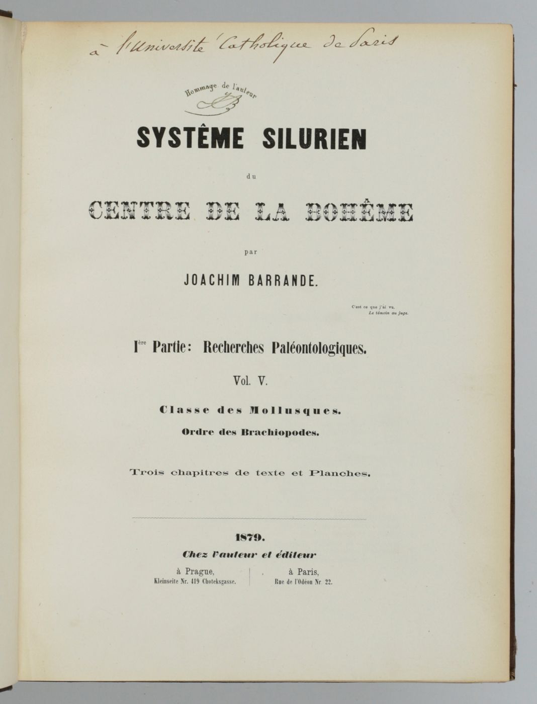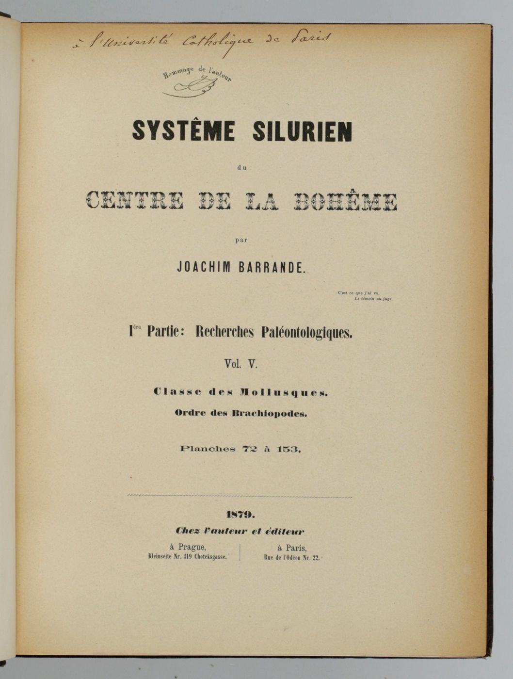 Systême Silurien du Centre de la Bohême. Première partie: recherches paléontologiques. Continuation éditée par le Musée Bohême. Vol. V. Classe des mollusques, ordre des brachiopodes. Trois chapitres de texte et planches.