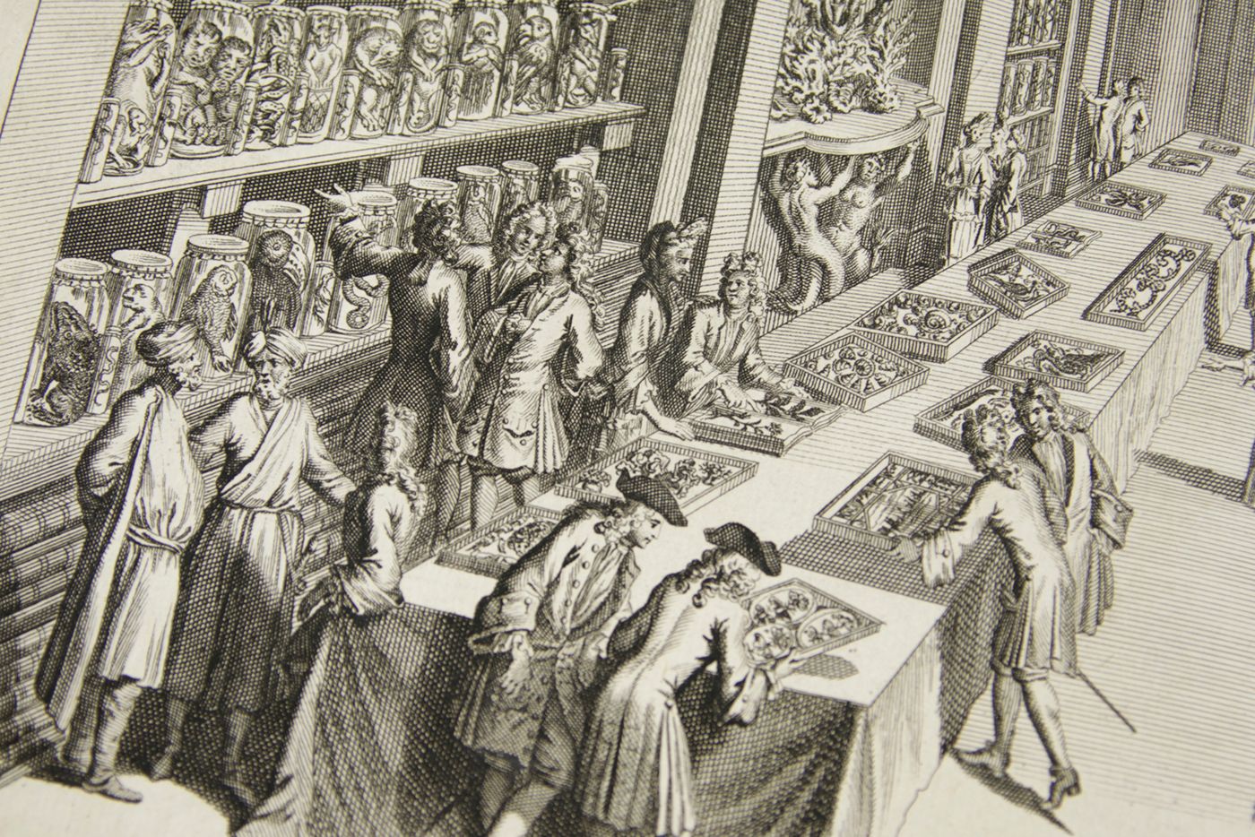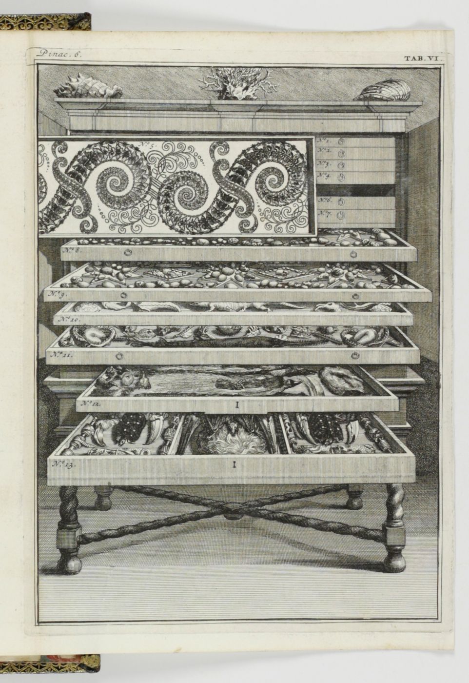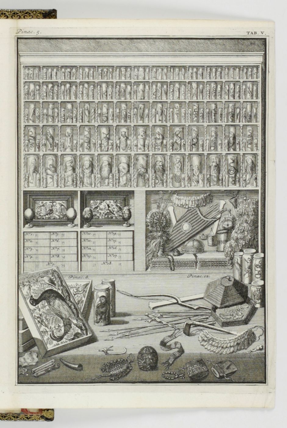 An extraordinary copy of this rarely-seen work by Levinus Vincent (1658-1727) in a spectacular contemporary binding. He "...was a rich Dutch designer and merchant of luxurious textiles, such as damask, silk and brocade. He was of the Anabaptist faith. He collected natural history objects (shells, insects, corals, birds, lizard and small mammals as wet preparations) artefacts (ethnographical items), paintings and drawings of flowers. The titles translate as: Miracle Show of Nature, opened in a brief description of the principal parts of the special rarities included therein; arranged and preserved by Levinus Vincent. [AND] The second part or continuation of Nature's Miracle Show, or a short description of bloodless, swimming, flying, crawling, and four-legged clawed egg-laying animals, and of shells, corals, sea shrubs, metallic and stone-turned things , etc. in very large numbers present in the cabinets of Levinus Vincent. Vincent and his wife, Joanna van Breda, took a lot of effort to present their collectables in a pleasurable and instructive spectacle. They ordered their shells and insects in elegant designs that resembled magnificent pieces of embroidery" (Wikipedia). He "considered it his task to create an order in the collection. He classified and catalogued insects, butterflies and shells, among other things. His collection could be visited. The entry price was two guilders in 1726: a substantial sum. Vincent saw nature as a reflection of God's omnipotence and, according to his own words, his collection had people turned to God because they were impressed by His ability" (website Stadsarchief Gemeente Amsterdam). Vincent "...aimed at the non-Latin-speaking public, printing the catalogue of his collection in both Dutch and French - Wondertooneel der Nature (Wonder Theater of Nature), giving details of all the objects on display. This catalogue sold for three guilder plus a tip or entrance fee of two guilder. He had fixed hours for its visitors. His visitor book (from 1705 to 1737) includes at least 3,500 entries, including Peter the Great. ... After the death of his second wife in 1715, he remarried a woman who did not like his collection or hobby. Vincent moved to the Hague, hoping to find a buyer for his cabinet among the town's many diplomats. He corresponded with such friends as James Petiver and Hans Sloane in England." (Wikipedia). Page numbering is somewhat confusing due to the presence of two unnumbered pages between the (also unnumbered) pages 8 (errata) and 9 of the second part. Binding and contents, except for an occasional small spot and a small chip in the lower outer corner of the rear endpaper, in a superb state. Once-in-a-liftetime copy. Nissen ZBI, 4254. Fearrington, Rooms of wonder, 96 (Lat. ed.).