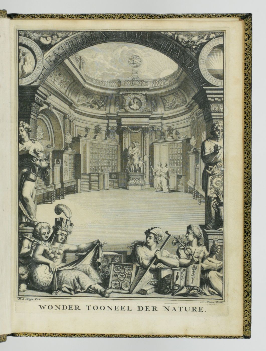 Amsterdam, François Halma [and] the author, 1706-1715. Two parts, bound in one. 4to (23.7 x 17.8 cm). Engraved title, double-pages engraved frontispiece, letterpress title with large copper-engraved allegorical vignette; [5]-30 pp.; second letterpress title with small woodcut vignette; [ii-xvii], [i-ii], [1-8], [i-ii], 9-278 pp.; seven folded, engraved plates. Contemporary full black morocco with extremely rich gilt decorated front and rear boards with floral patterns; spine with five raised gilt-ornamented bands; compartments with rich gilt angular borders, gilt floral vignettes, and gilt title. Gilt edges and inner dentelles. Marbled endpapers. All edges gilt.