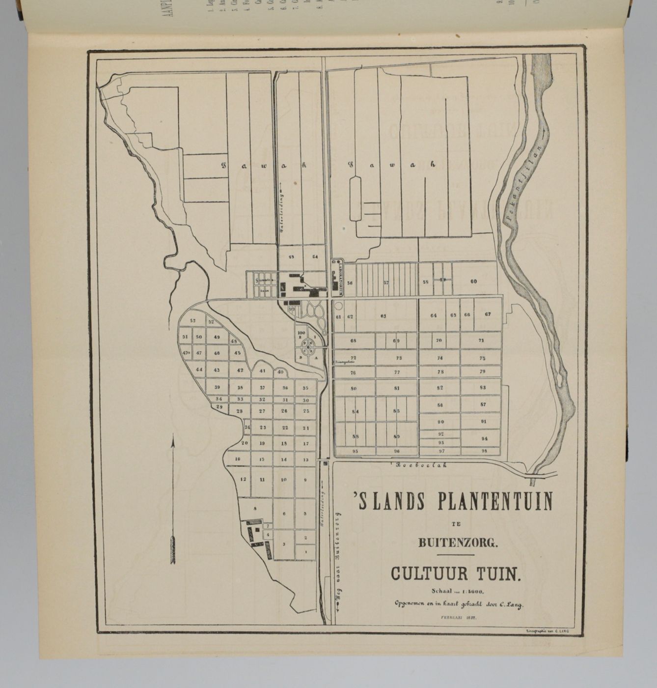 Batavia, Landsdrukkerij, 1892. Large 8vo (25.9 x 17.8 cm). 518 pp.; one map of the botanical gardens at Bogor (Indonesia), five tissue-guarded portraits, two maps. Original half cloth over printed boards. Printed label on the spine.
