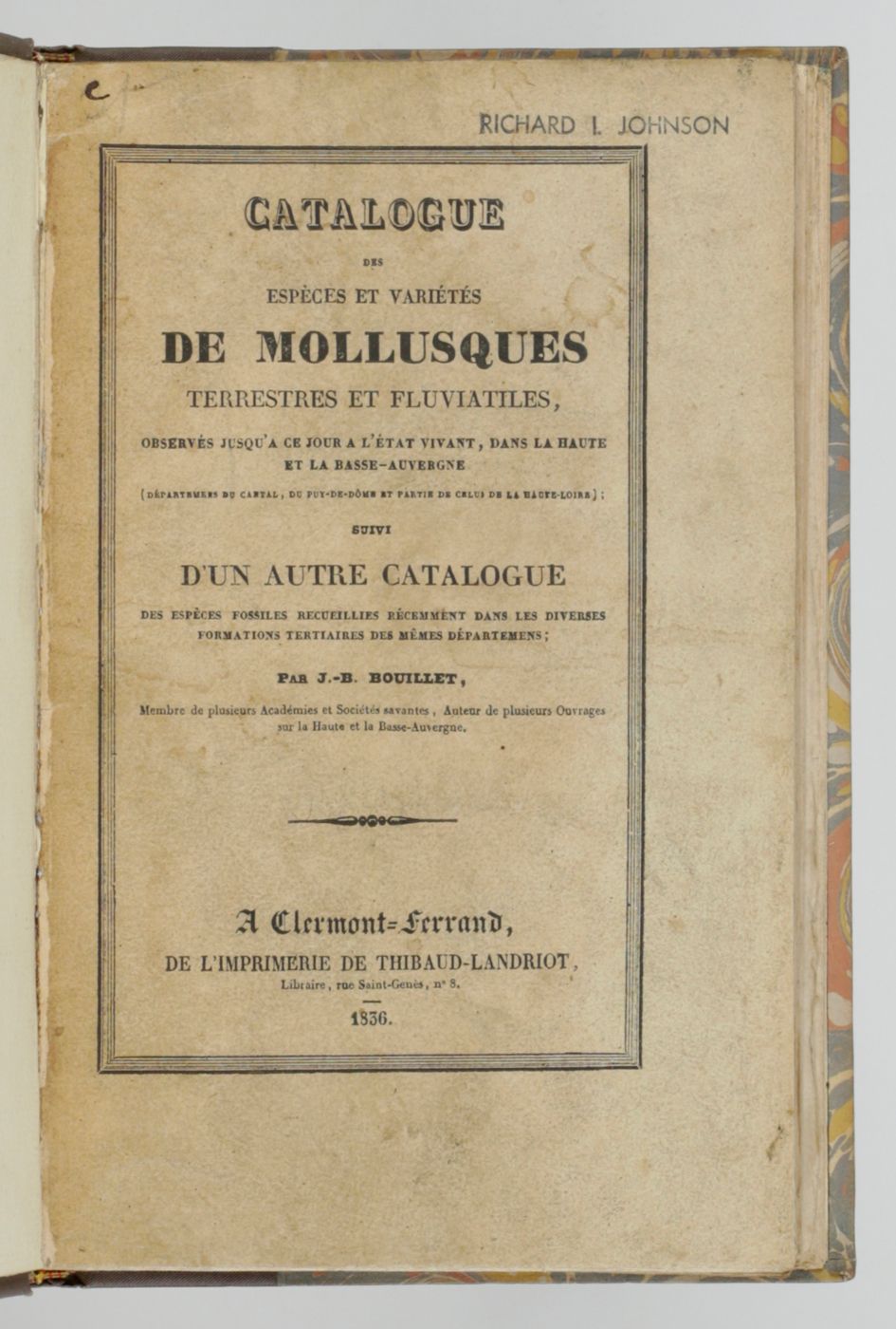 Two seldom-seen malacological publications by the French malacologist and geologist Jean Baptiste Bouillet (1799-1878) on the faunas of a mountainous region in central France. The shorter half-title of the larger paper reads: " Catalogue des coquilles vivantes et fossiles de l'Auvergne". The second paper, published earlier (1834), being an offprint from " La description historique et scientifique de la Haute-Auvergne( Département du Cantal)" with title leaf, drop-head title, pp. [3]-16, and two engraved plates. These are two of several mid-19th to early 20th century French regional catalogues of non-marine molluscs. Almost every département had its own keen malacologist tackling the local malacofauna. Provenance: stamp of the American malacologist Richard Irwin Johnson (1925-2020) in the top margin of the first paper's front wrapper, otherwise clean, very good.