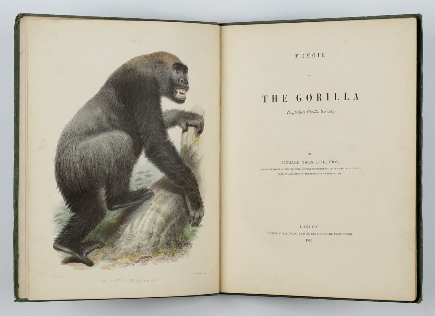 The other letter was directed to Murray himself, dated Oct 29 1861, stating that he forwarded his book on the Gorilla, as well a package with maps and drawings in order to hand these items over to Prof. Owen. Plate 1 acting as frontispiece. Rubbing to edges, the corners a bit abraded, otherwise fine. Cat. BM(NH) p. 1491; Nissen ZBI, 3037; Wood, p. 509. read less