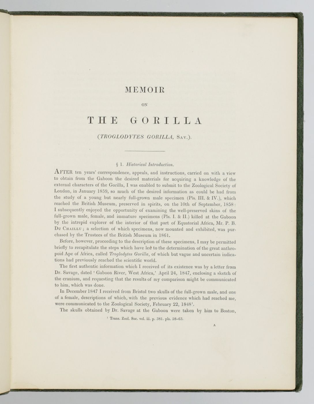 Memoir on the Gorilla ( Troglodytes Gorilla, Savage). [Presentation copy].