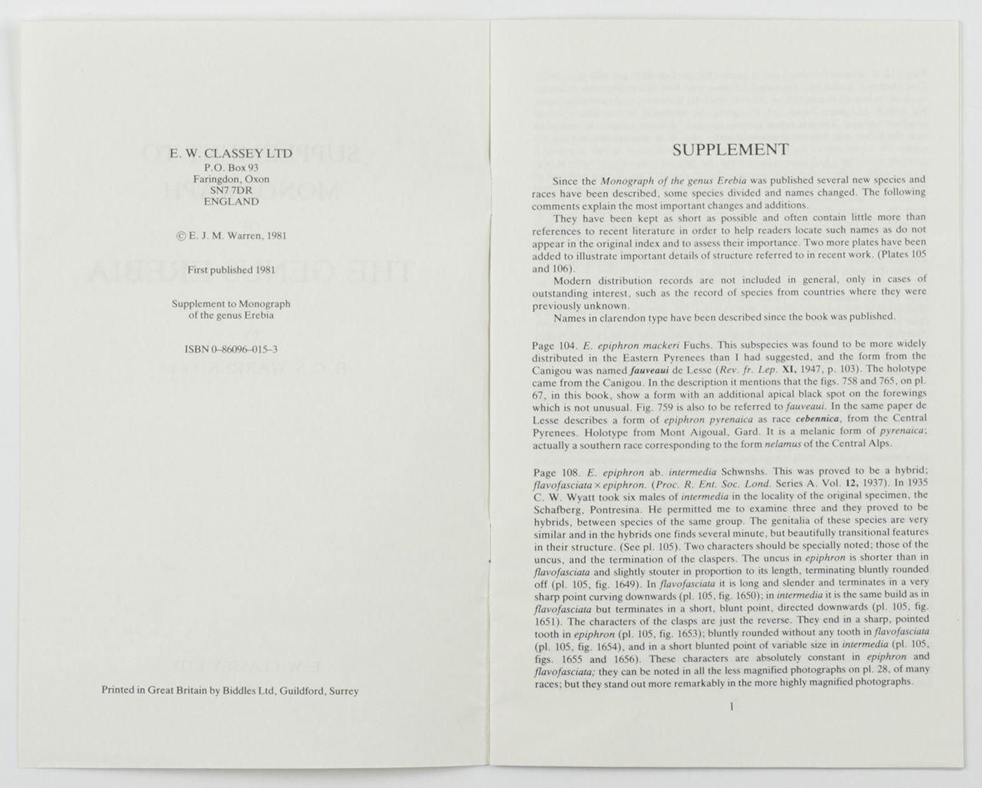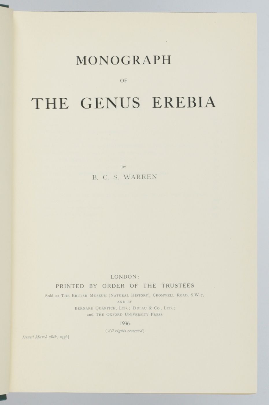 An excellent copy of a magnificent monograph on the brown ringlet butterflies of the family Satyridae, which occurs in the Alpine and Subalpine zones of the Holarctic region. Written and illustrated by the Irish entomologist Brisbane Charles Somerville Warren (1887-1979). Between 1902 and 1960 Warren amassed an extensive collection of nearly 21,000 specimens of Palaearctic Lepidoptera, including 6,200 specimens of Erebia, which are now housed in the Natural History Museum, London. He published 112 scientific papers in all, but this is his magnum opus. De Worms describes his photos as "superb". The plates contain 1,648 individually numbered illustrations. This copy includes the much later (1981!) Supplement, written by Warren, and edited by his daughter and fellow lepidopterologist, Elizabeth J. M. Warren. Provenance: with on the front pastedown a pictorial, lepidopterological bookplate of the French medical biologist and entomologist Paul Thiaucourt (1928-2022), whose collection is now in the Muséum national d'Histoire naturelle in Paris. Corners slightly bumped, otherwise a meticulous copy, as new. It is rare to see this work, in particular with the supplement included. Worms, C. G. M. de (1981) " Obituary. Brisbane Charles Somerville Warren ( 1887-1979)". Entomologist's Record and Journal of Variation 91: 111-112; Vane-Wright & Ackery (1981). " The B.C.S. Warren Collection and its type material". Entomologist's Record and Journal of Variation 93: 1-3, 112-115, 172-175.