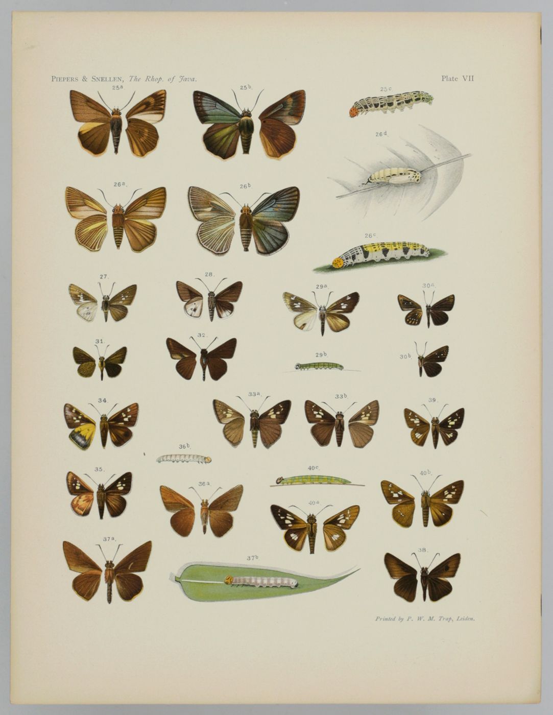 From the atlas of a very rare work by the Dutch entomologists Marinus Cornelis Piepers (1835-1919), and Pieter Cornelius Tobias Snellen (1834-1911). The work was issued in four parts. Included are the fine plates numbered 1-10, 12-13, 17, and 19-27; all printed by the renowned firm of P. W. M. Trap in Leiden. The complete work should comprise four volumes with 480 pp. The four plates not present (11, 14-16, and 18) were all published in the third (1913) part. The lithographed plates are very well printed and many butterflies are depicted with their caterpillars, pupae, and/or eggs. Nissen ZBI, 3180.