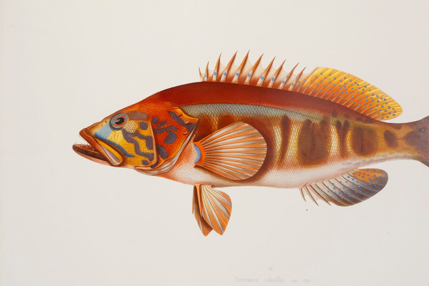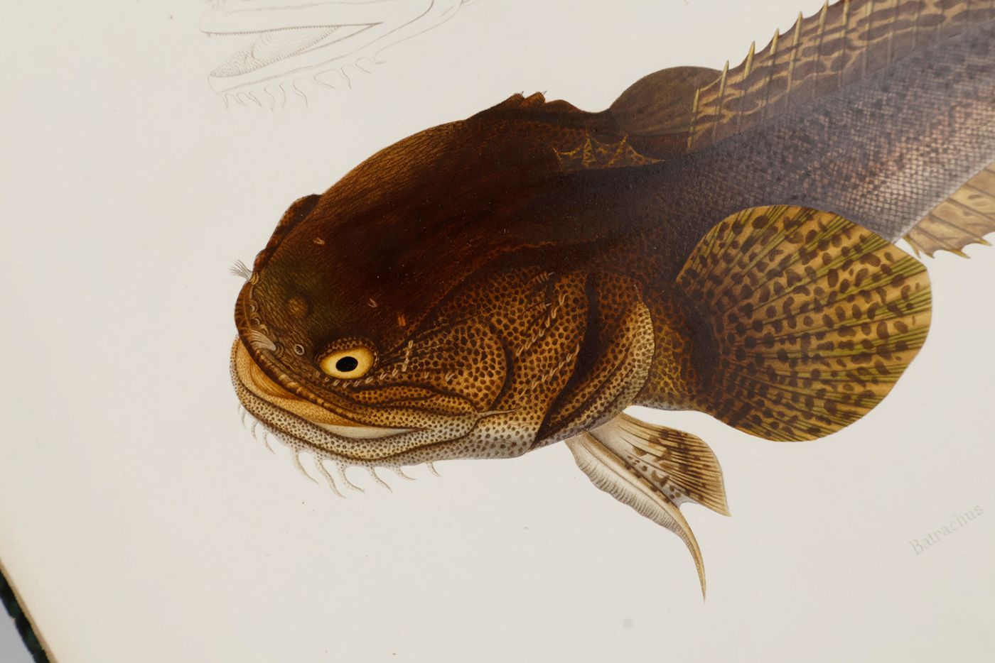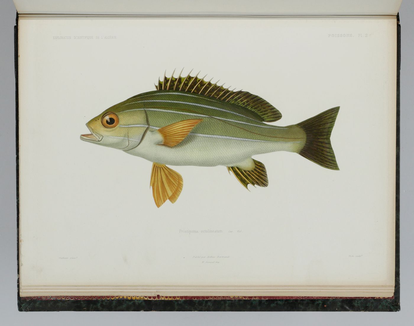 Paris, Arthus Bertrand, 1850. Folio (37.0 x 28.1 cm). Half-title, title page Sciences physiques Zoologie V, with engraved vignette, half-title (to the reptiles and fish); iv, 144, [iv] pp., half-title (to the atlas); 12 plates (four of reptiles and amphibians, eight of fish). The plates are colour-printed engravings à la poupée and then finished by hand. Contemporary half morocco over marbled boards. Spine with five raised bands and gilt title. Marbled endpapers. Speckled edges.