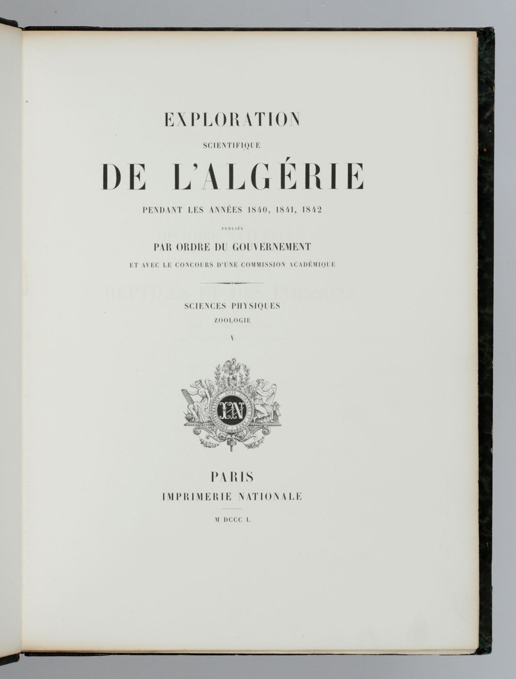 Exploration scientifique de l'Algérie, pendant les années 1840, 1841, 1842 publiée par ordre du gouvernement et avec le concours d'une commission académique. Sciences physiques. Zoologie. V. Histoire naturelle des reptiles et des poissons.