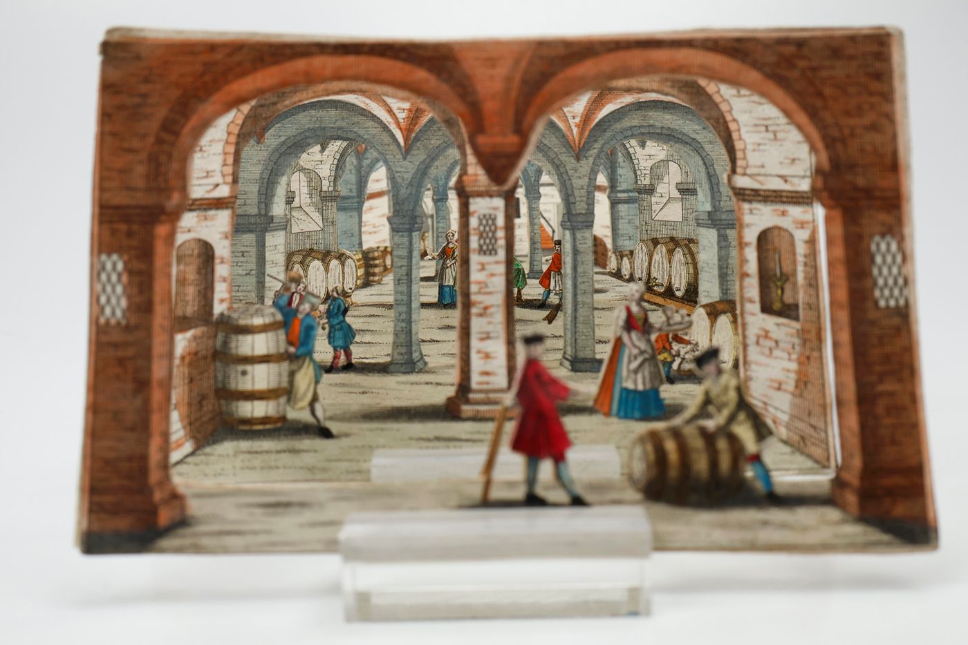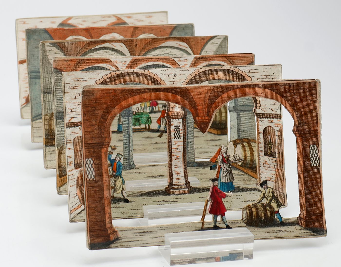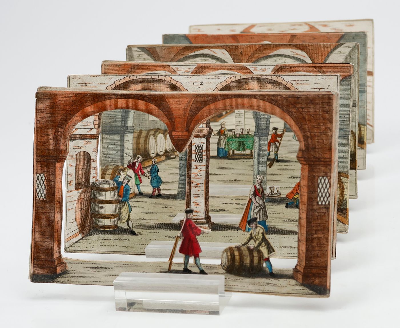 A wonderfully preserved, complete set of cards, with delicate cut-outs and hand-colouring. This peepshow consists of six cards which together form a view through a wine cellar, arguably one of the most popular subjects. Most probably produced by the Augsburg firm of M. Engelbrecht, having all the hallmarks of his quality in engravings and colouring, as well as in the choice of subjects. "Martin Engelbrecht (1684-1756), a native of Augsburg was the son of a colour merchant. He began his career as an artist by the attachment to a local publishing house but had by 1708 moved to Berlin where he was engaged in the designs after Eosander von Goethe of a the Silberbüfett im Ritterall at Berlin and of a porcelain cabinet in Charlottenberg. Returning to Augsburg he was involved in illustrating a wide variety of works after various artist mainly on subjects connected with the decorative arts. However in 1711 Engelbrecht was again in Berlin working at a fine art publishers with his older brother Christian Engelbrecht (1672-1735). They decided to start their own independent publishing house at Augsburg in 1719 where they produce a wide variety of graphic works. It was with peepshows Martin Engelbrecht excelled having the unique position of no other publishing house or place of publication to compete against him. Engelbrecht was kept busy with the many other special graphics and employed two artists, Jeremias Wachsmuth (1711-1771) and Johann David Nessenthaler (1717-1766), to produce designs for the peepshows. Wachsmuth’s work can be found as early as 1731, and those by Nessenthaler starting from 1737. With Martin Engelbrecht's death in 1756 the business continued to thrive under the management of Engelbrecht's daughters and sons-in-law, and continued on well into the nineteenth century." (Marlborough Rare Books Catalog, List XLV, 2009. pp. 33-34). The quality is certainly of the highest level. Cards 2, 4, and 6 are numbered on rectos (printed), the other three are numbered on versos, in an old hand. Very slight rubbing to the edges, otherwise very good, clean. Rare.