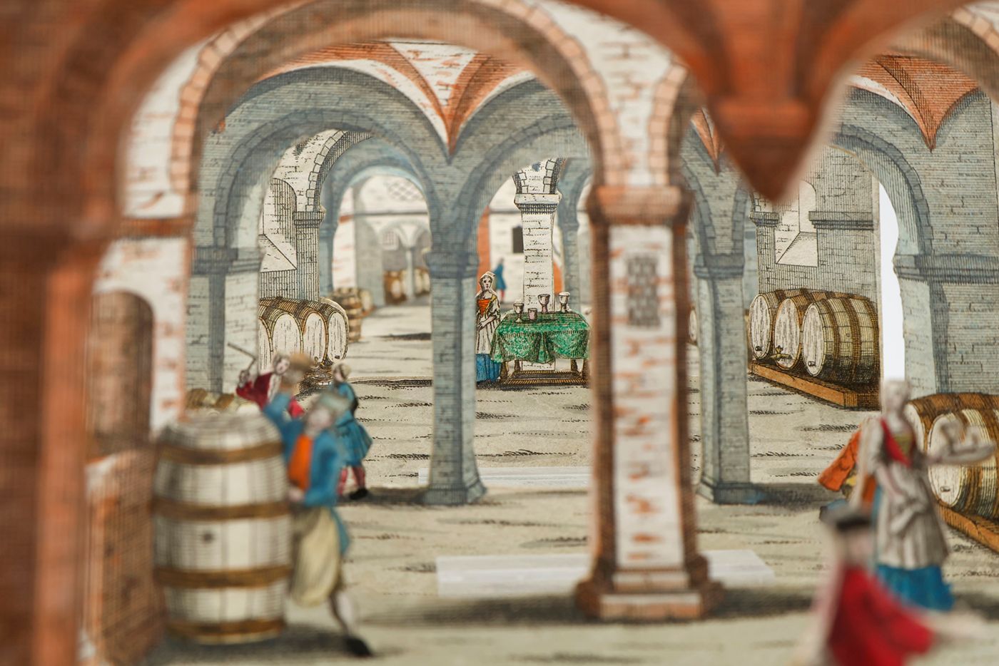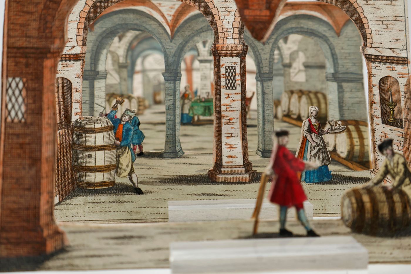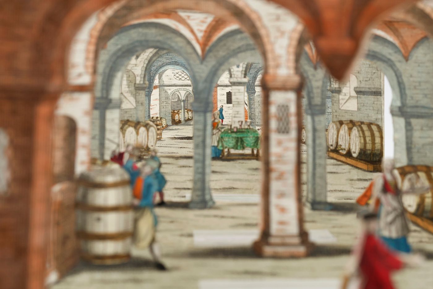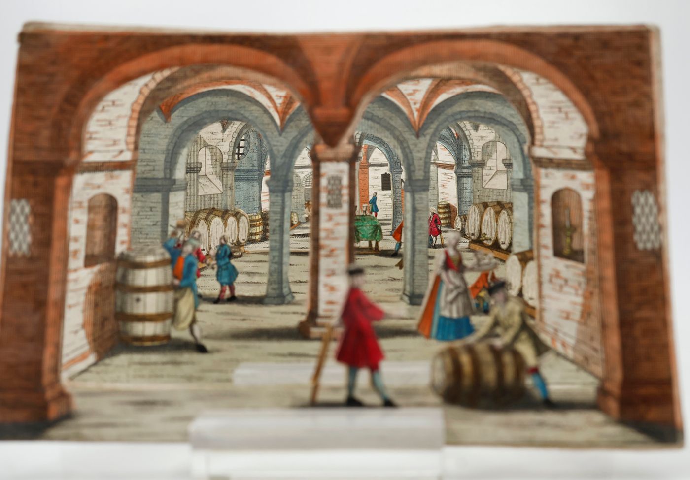 A wonderfully preserved, complete set of cards, with delicate cut-outs and hand-colouring. This peepshow consists of six cards which together form a view through a wine cellar, arguably one of the most popular subjects. Most probably produced by the Augsburg firm of M. Engelbrecht, having all the hallmarks of his quality in engravings and colouring, as well as in the choice of subjects. "Martin Engelbrecht (1684-1756), a native of Augsburg was the son of a colour merchant. He began his career as an artist by the attachment to a local publishing house but had by 1708 moved to Berlin where he was engaged in the designs after Eosander von Goethe of a the Silberbüfett im Ritterall at Berlin and of a porcelain cabinet in Charlottenberg. Returning to Augsburg he was involved in illustrating a wide variety of works after various artist mainly on subjects connected with the decorative arts. However in 1711 Engelbrecht was again in Berlin working at a fine art publishers with his older brother Christian Engelbrecht (1672-1735). They decided to start their own independent publishing house at Augsburg in 1719 where they produce a wide variety of graphic works. It was with peepshows Martin Engelbrecht excelled having the unique position of no other publishing house or place of publication to compete against him. Engelbrecht was kept busy with the many other special graphics and employed two artists, Jeremias Wachsmuth (1711-1771) and Johann David Nessenthaler (1717-1766), to produce designs for the peepshows. Wachsmuth’s work can be found as early as 1731, and those by Nessenthaler starting from 1737. With Martin Engelbrecht's death in 1756 the business continued to thrive under the management of Engelbrecht's daughters and sons-in-law, and continued on well into the nineteenth century." (Marlborough Rare Books Catalog, List XLV, 2009. pp. 33-34). The quality is certainly of the highest level. Cards 2, 4, and 6 are numbered on rectos (printed), the other three are numbered on versos, in an old hand. Very slight rubbing to the edges, otherwise very good, clean. Rare.