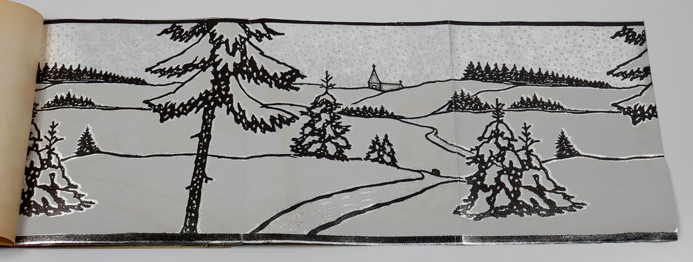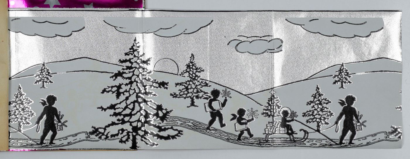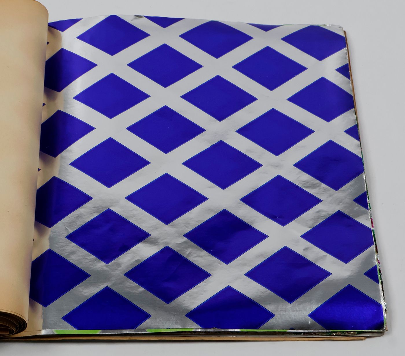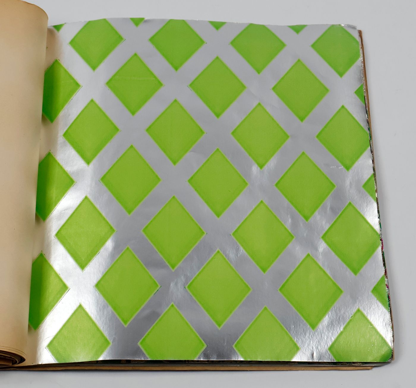 A fantastic and amazingly large-sized catalogue of aluminium or "tin" foil samples. Usually, the firm's sample catalogues are much smaller, oblong, but this one is fair and square superior, showing not just patterns (here; stars, of different sizes), but also Christmas an easter scenes, with bells and bunnies, etc. These are the gift wrappers that are a gift in themselves. Each leaf stamped on verso with a catalogue number. Edges a bit creased; the front wrapper with a very short, marginal tear; otherwise, in excellent condition. Rare.