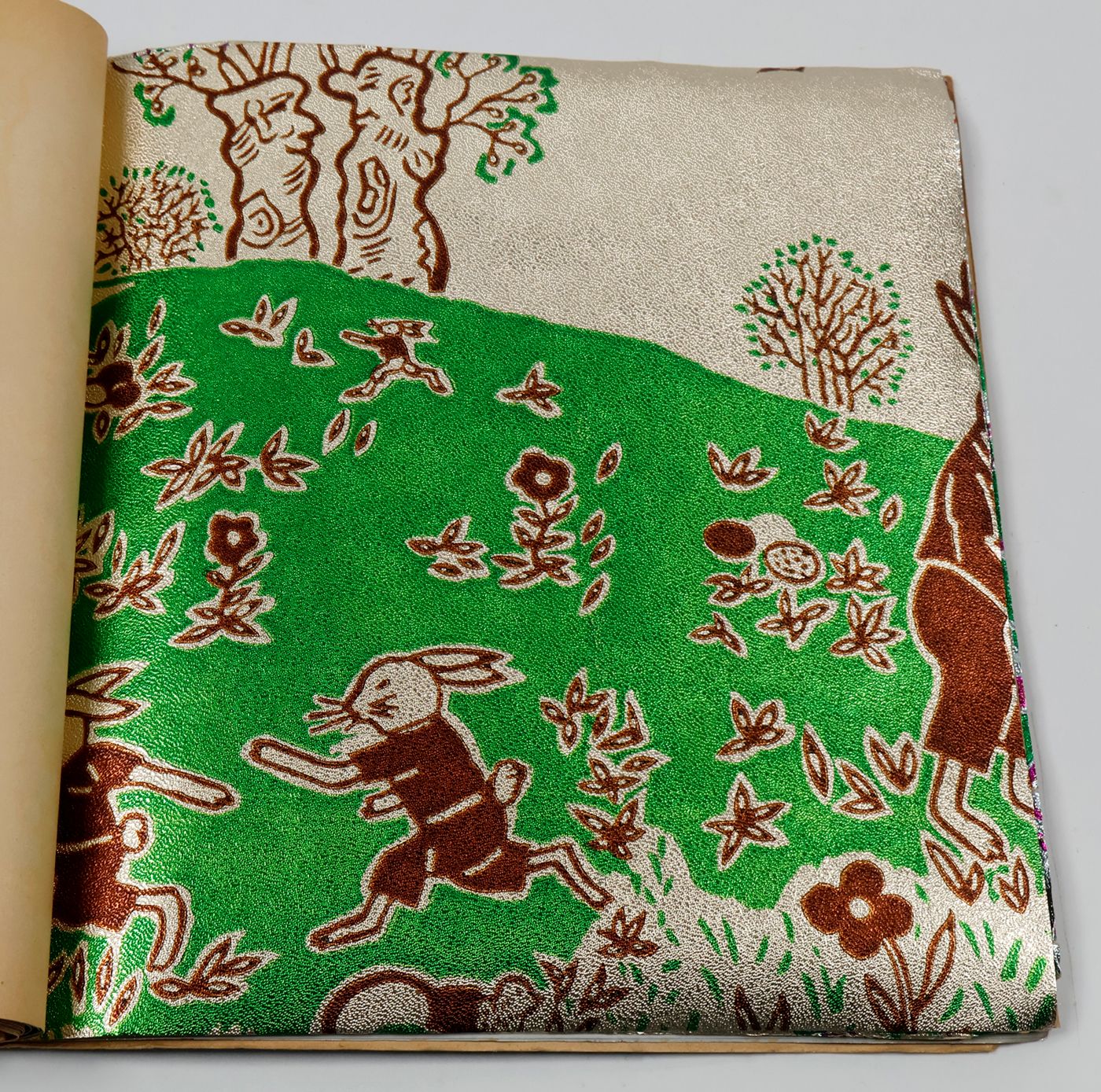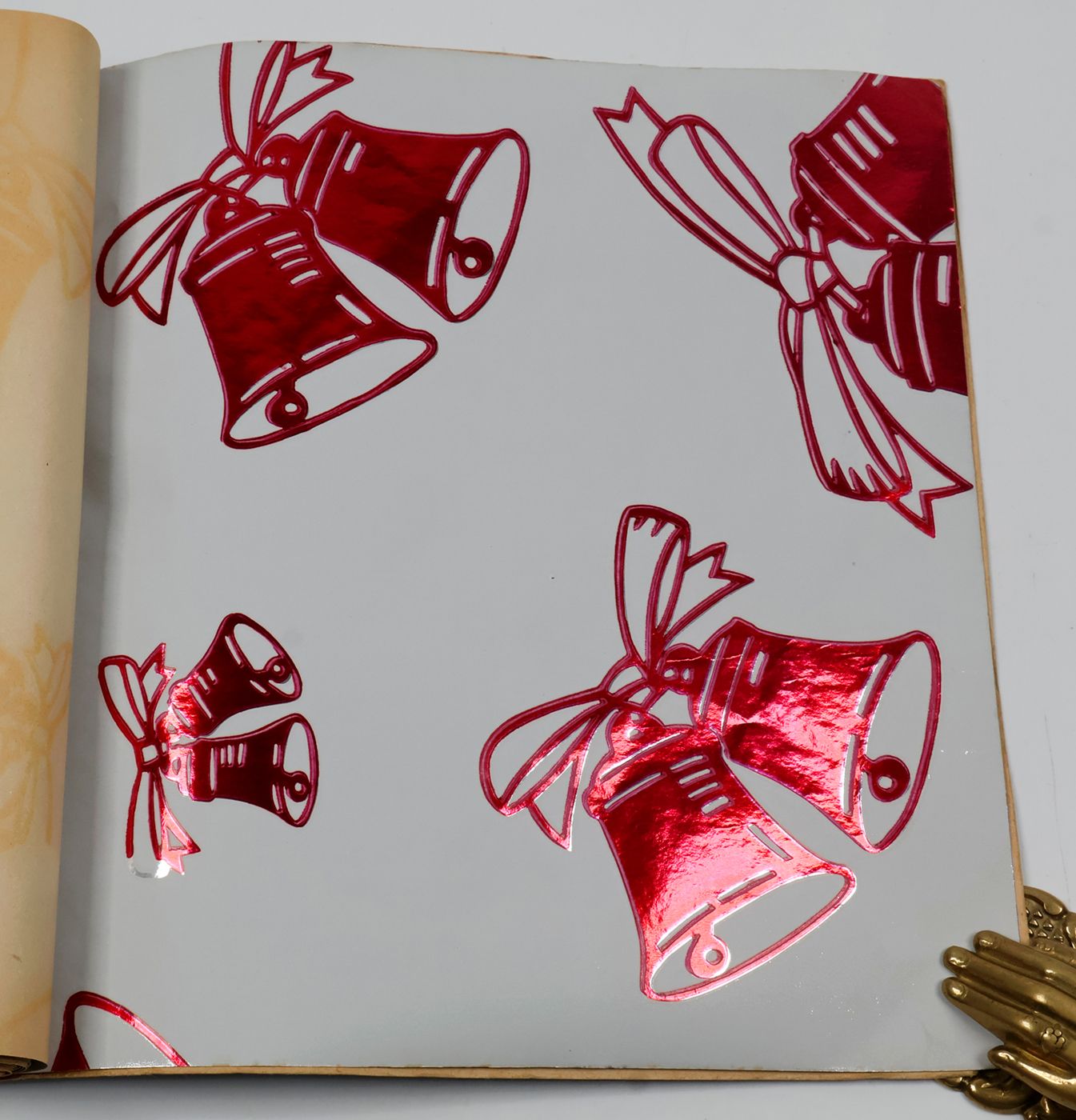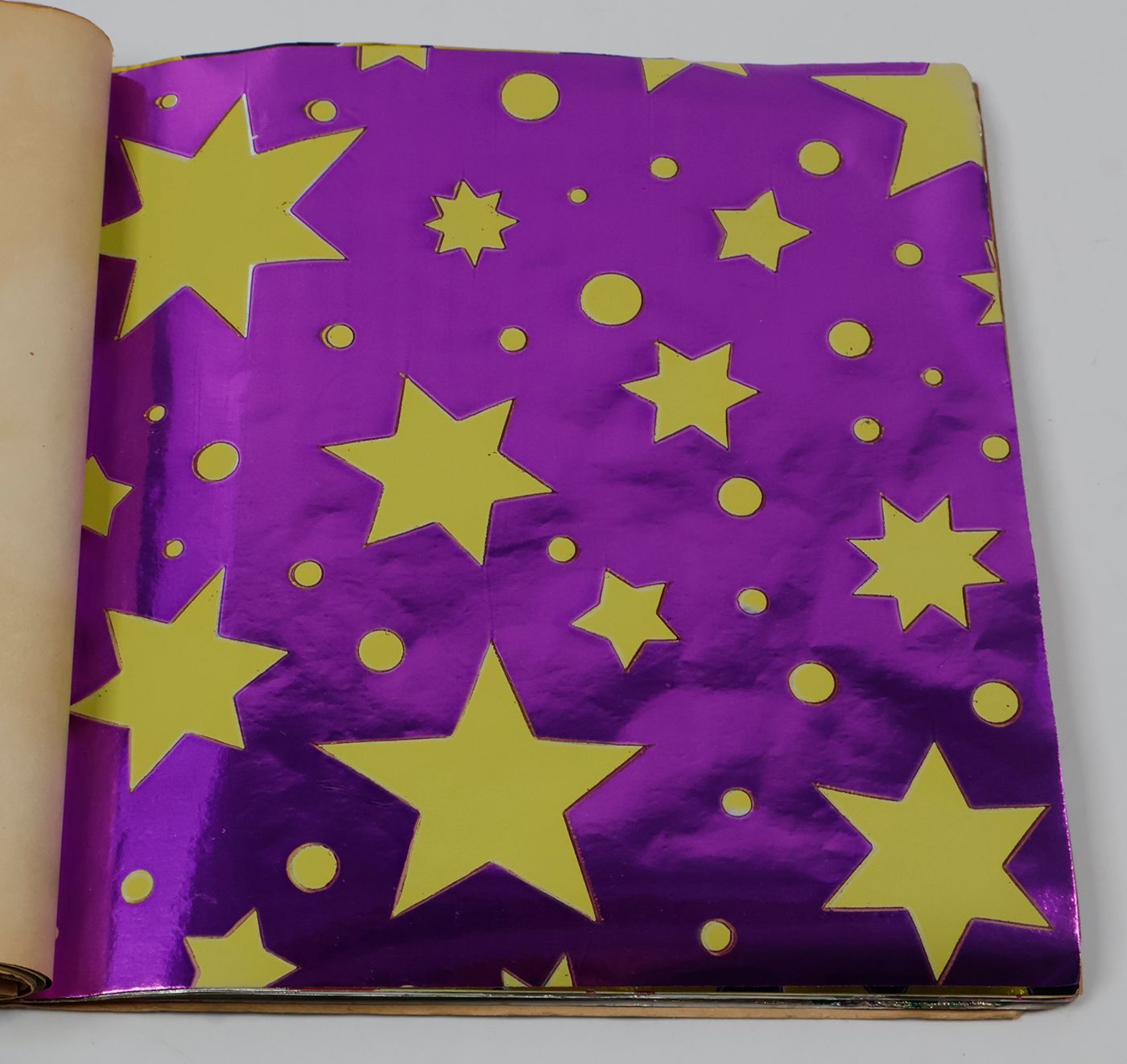 A fantastic and amazingly large-sized catalogue of aluminium or "tin" foil samples. Usually, the firm's sample catalogues are much smaller, oblong, but this one is fair and square superior, showing not just patterns (here; stars, of different sizes), but also Christmas an easter scenes, with bells and bunnies, etc. These are the gift wrappers that are a gift in themselves. Each leaf stamped on verso with a catalogue number. Edges a bit creased; the front wrapper with a very short, marginal tear; otherwise, in excellent condition. Rare.