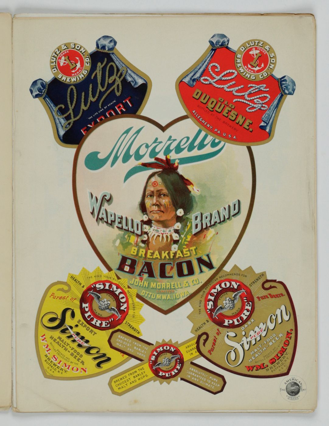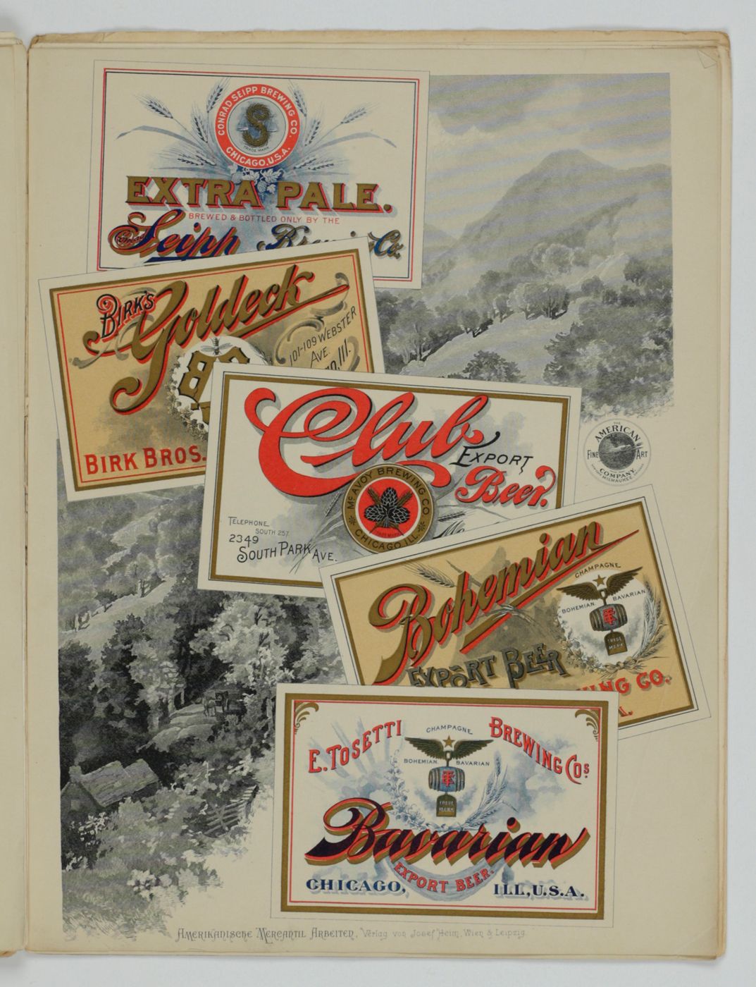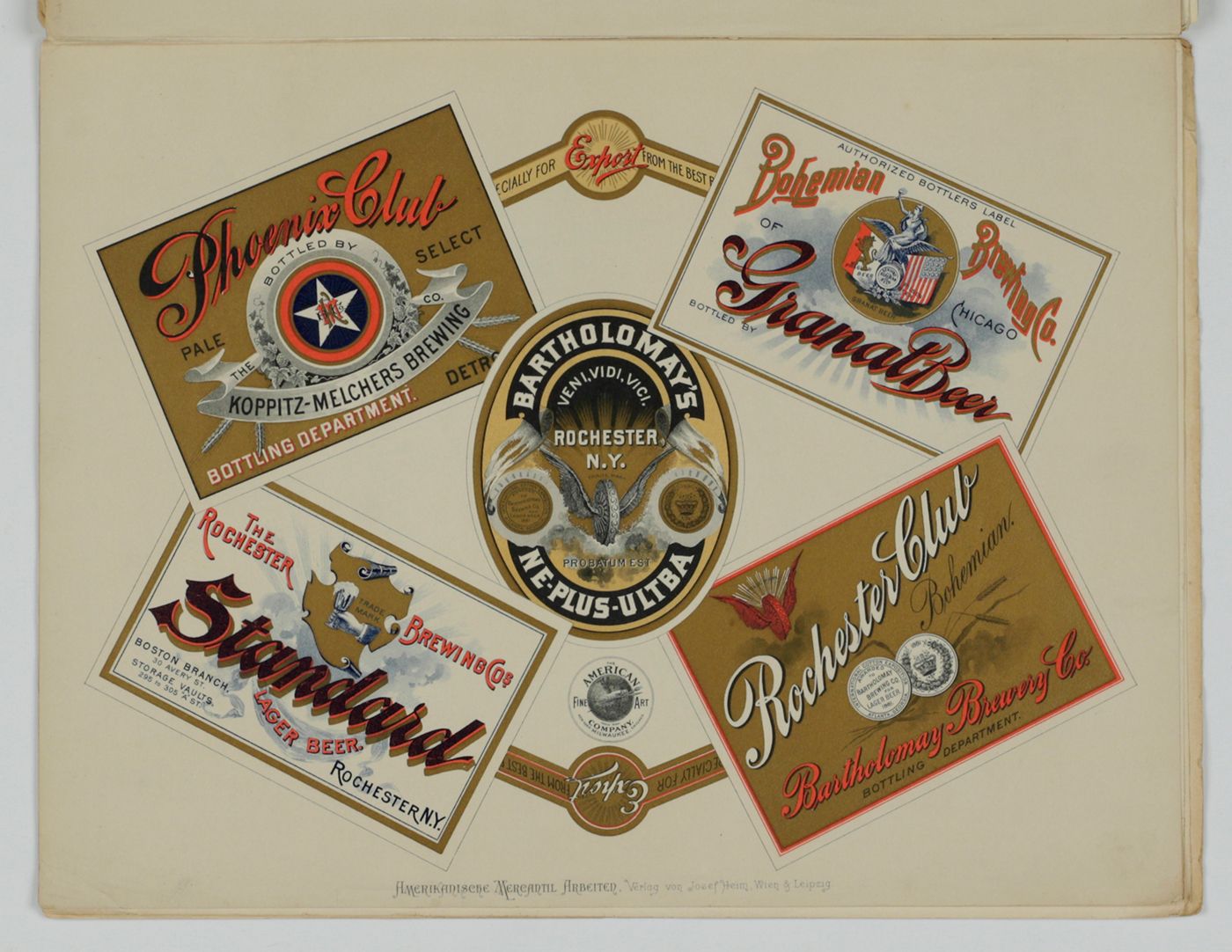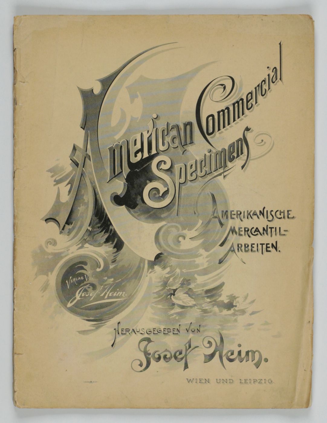 A potpourri of American advertising and label designs, meant as examples of the newest trends in commercial communication, apparently aimed at German and Austrian entrepreneurs. It is an early documentation of the growing influence of American culture on Europe, in particular on trade and commerce. Examples shown include beer and whiskey labels. The printer is the American Fine Art Company of Milwaukee (their logo on several leaves). Another, later edition, apparently titled "Second Series", and with only 24 plates, is known. Another antiquarian book-dealer stated "The only listing on OCLC is of a copy with the same pagination in St. Gallen, but with no mention of second series". Wrappers torn at fold. One leaf worn and chipped at edges, one with a short, marginal tear, otherwise very good. Exceedingly rare.