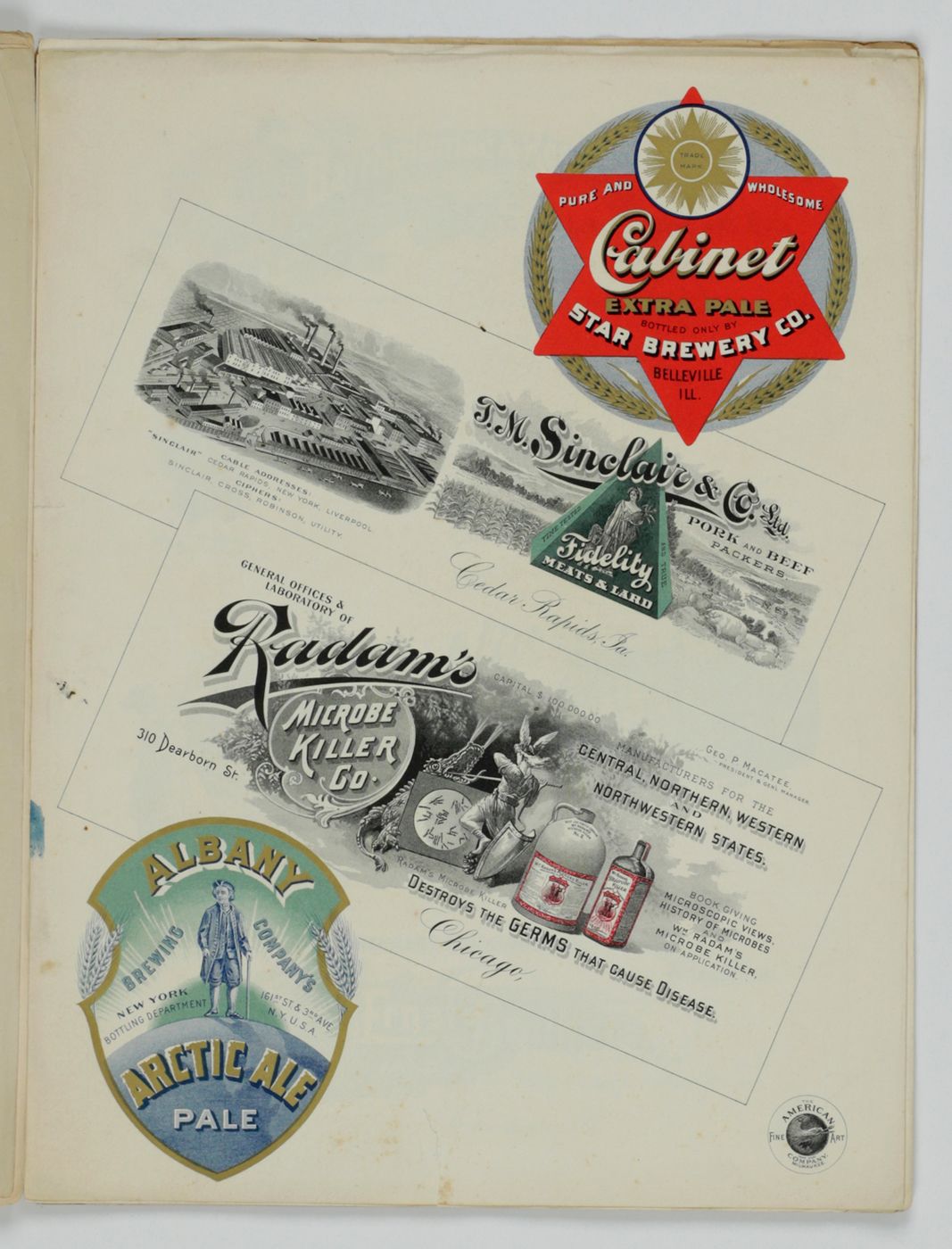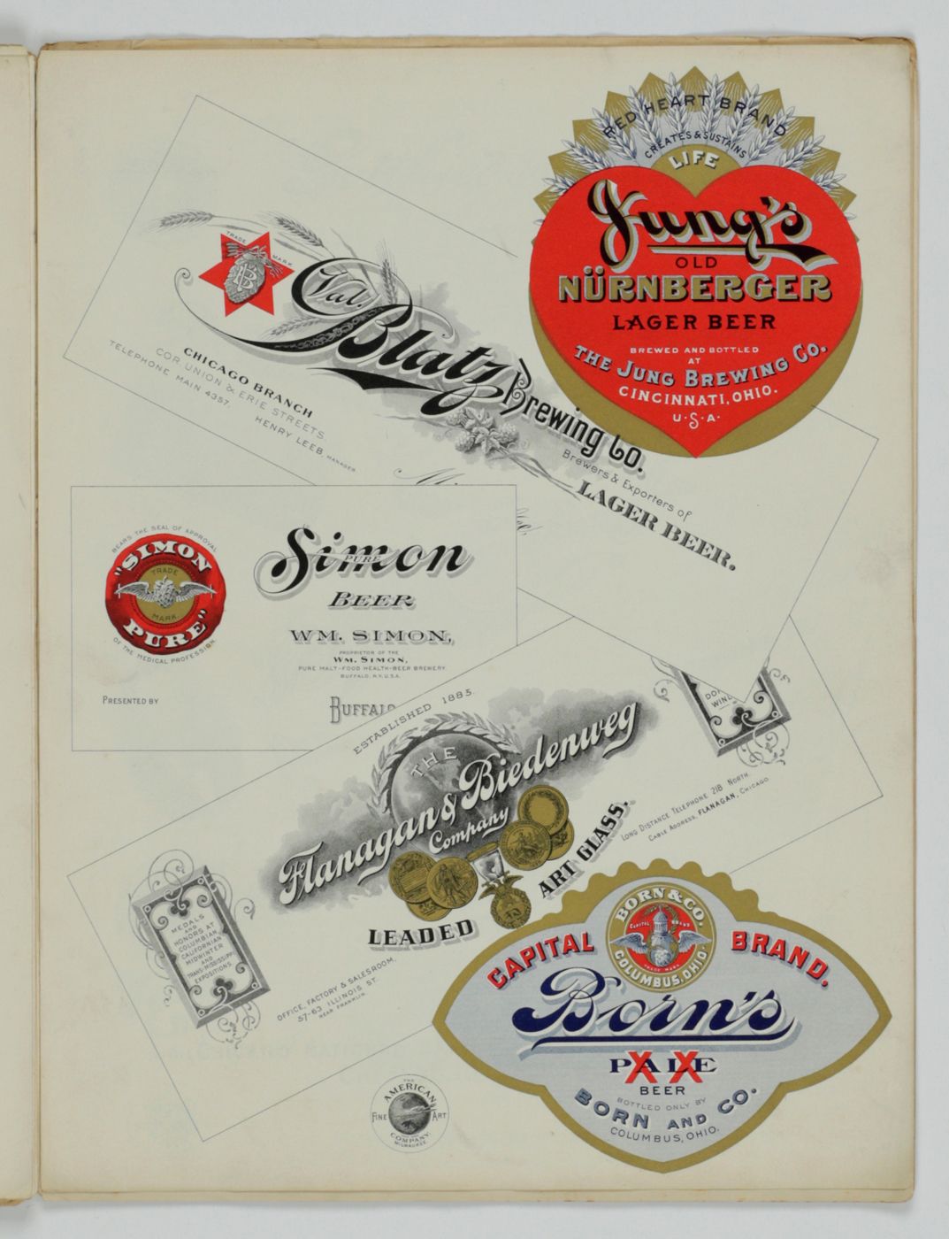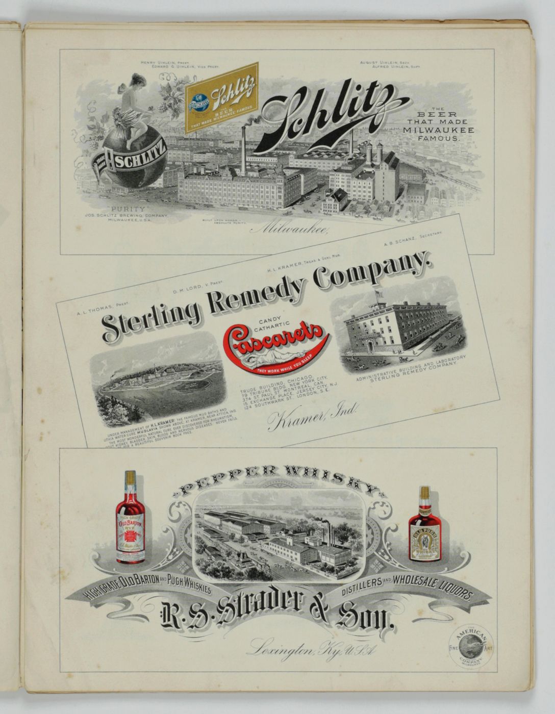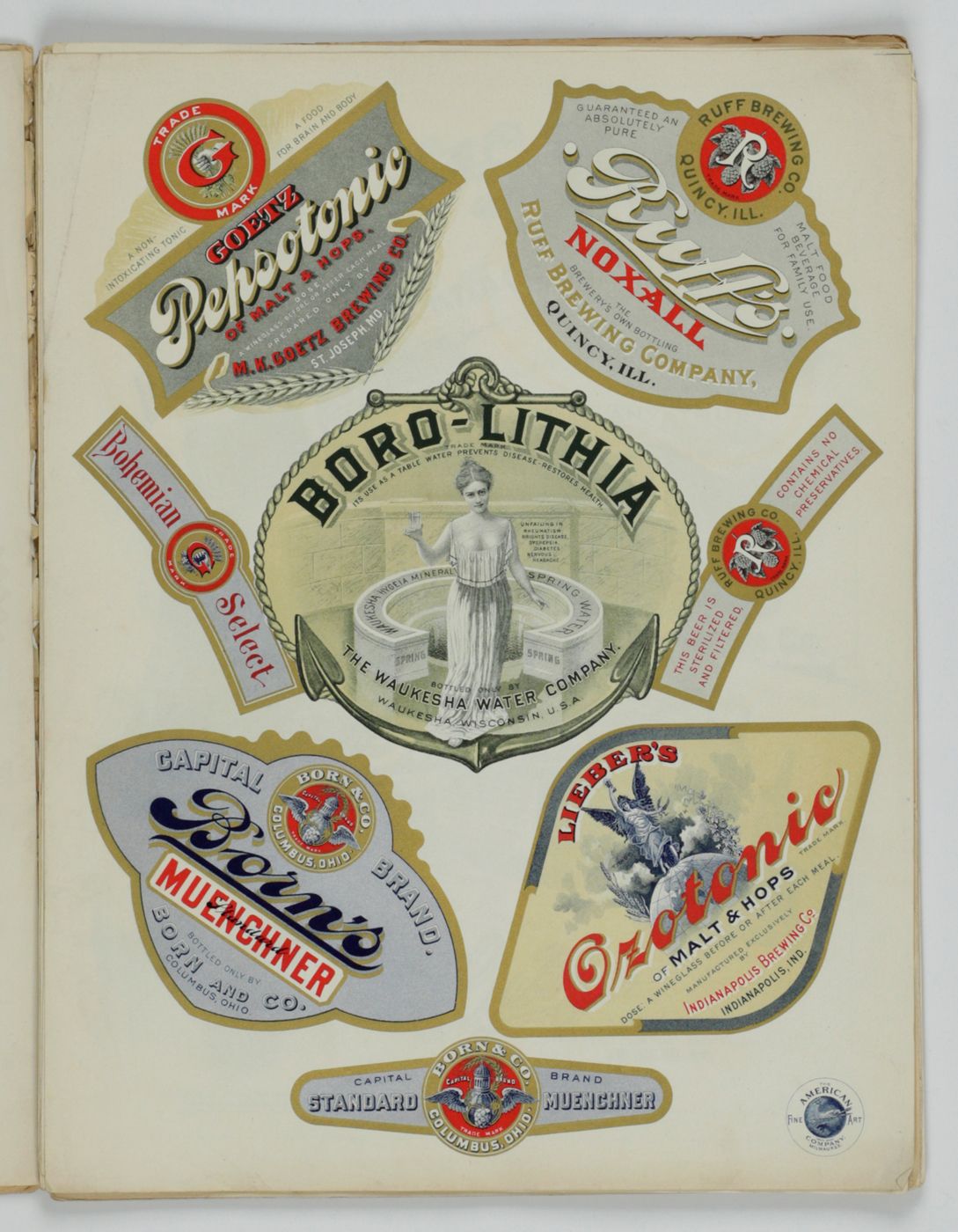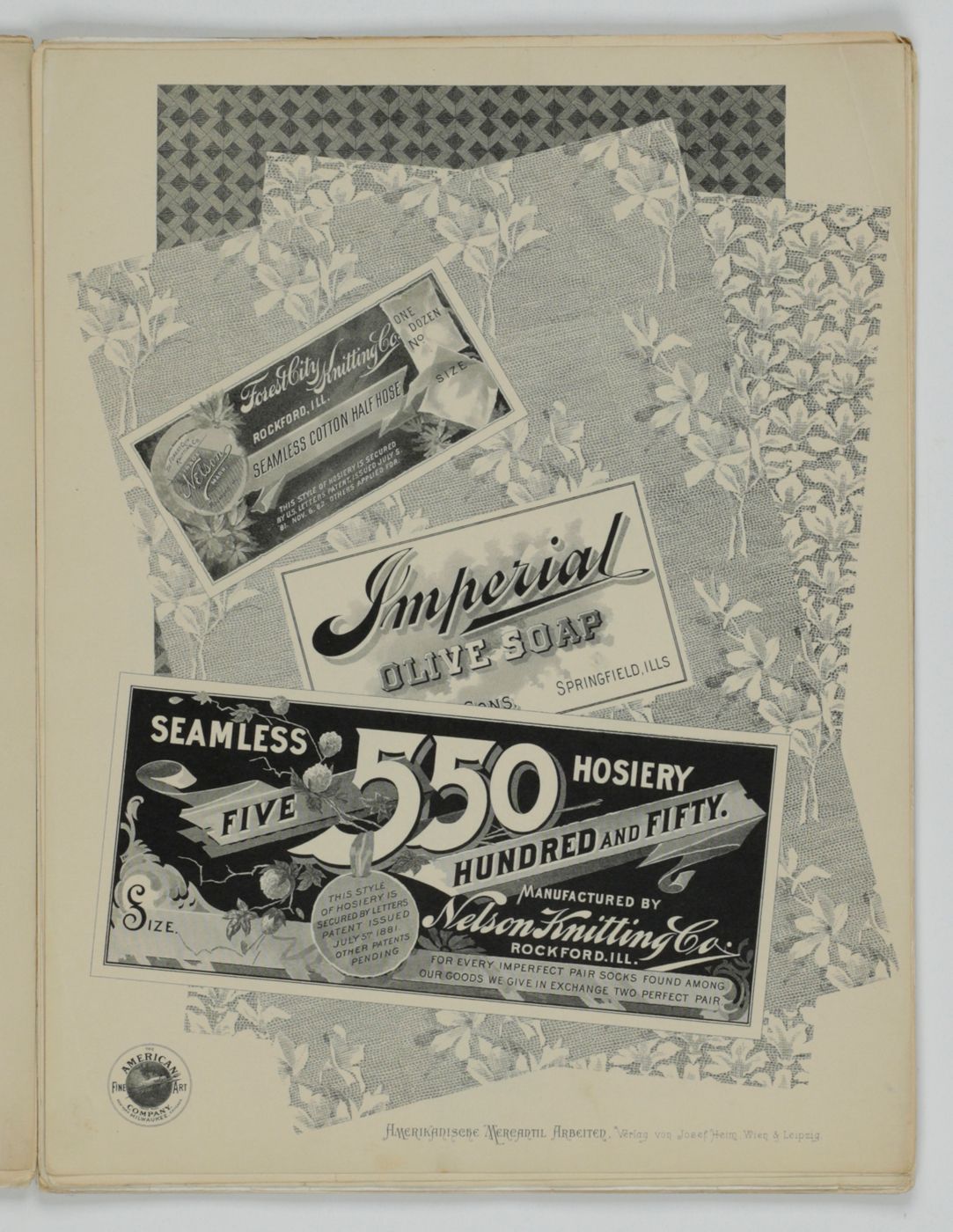 A potpourri of American advertising and label designs, meant as examples of the newest trends in commercial communication, apparently aimed at German and Austrian entrepreneurs. It is an early documentation of the growing influence of American culture on Europe, in particular on trade and commerce. Examples shown include beer and whiskey labels. The printer is the American Fine Art Company of Milwaukee (their logo on several leaves). Another, later edition, apparently titled "Second Series", and with only 24 plates, is known. Another antiquarian book-dealer stated "The only listing on OCLC is of a copy with the same pagination in St. Gallen, but with no mention of second series". Wrappers torn at fold. One leaf worn and chipped at edges, one with a short, marginal tear, otherwise very good. Exceedingly rare.