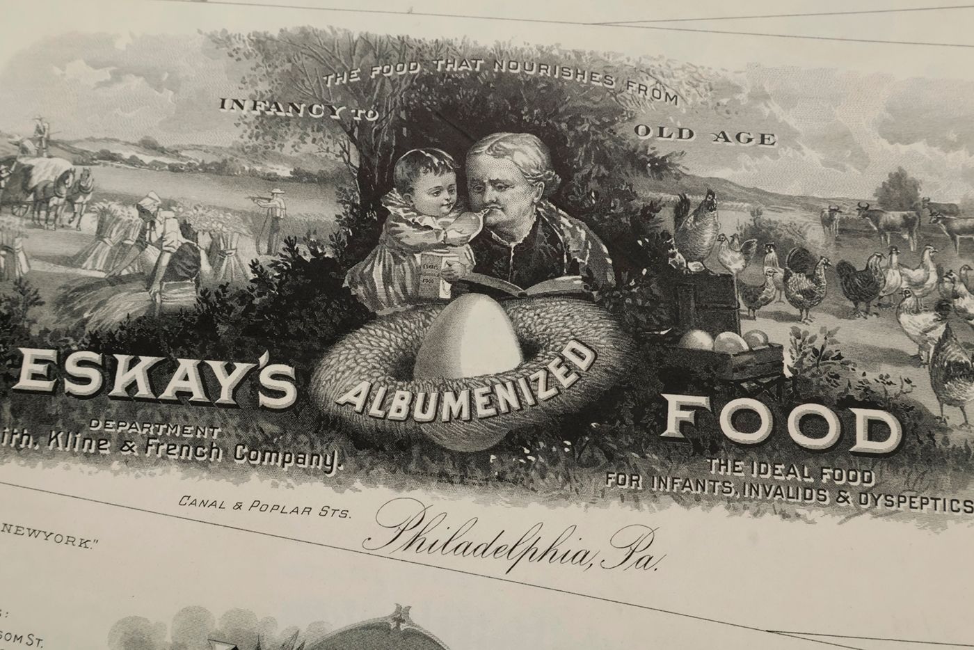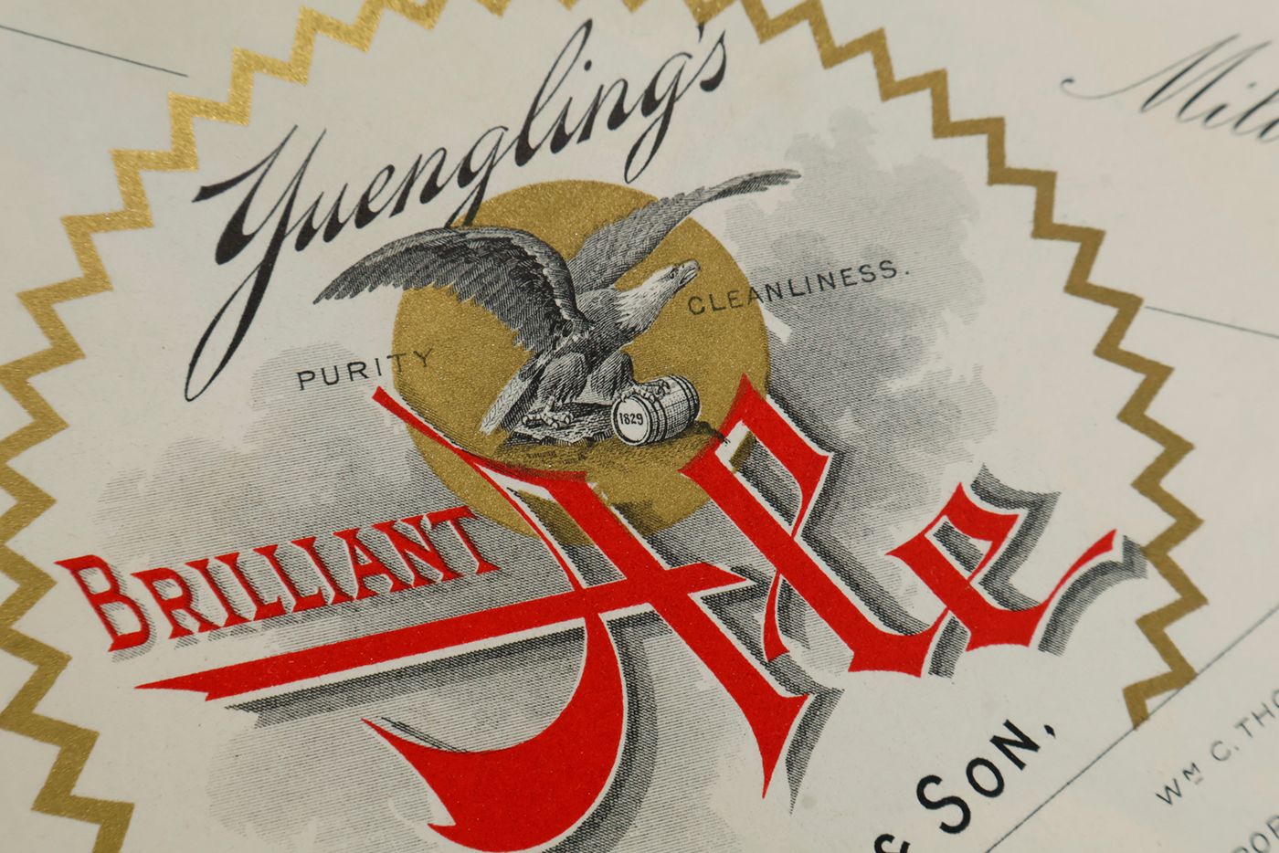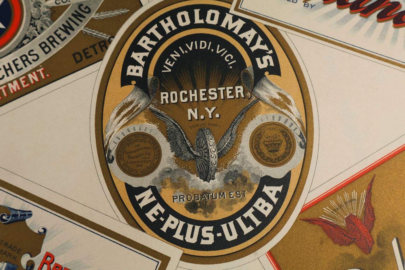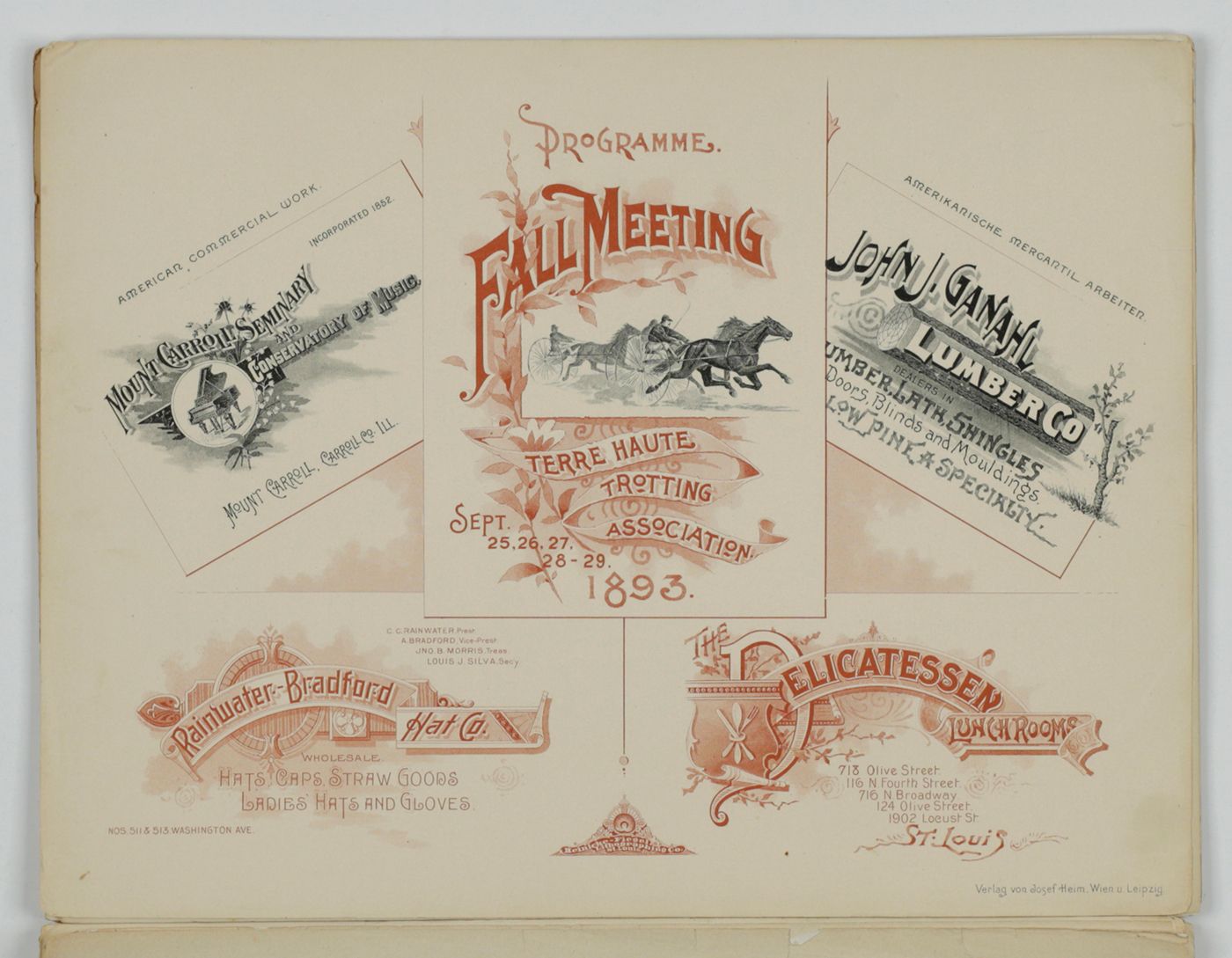 A potpourri of American advertising and label designs, meant as examples of the newest trends in commercial communication, apparently aimed at German and Austrian entrepreneurs. It is an early documentation of the growing influence of American culture on Europe, in particular on trade and commerce. Examples shown include beer and whiskey labels. The printer is the American Fine Art Company of Milwaukee (their logo on several leaves). Another, later edition, apparently titled "Second Series", and with only 24 plates, is known. Another antiquarian book-dealer stated "The only listing on OCLC is of a copy with the same pagination in St. Gallen, but with no mention of second series". Wrappers torn at fold. One leaf worn and chipped at edges, one with a short, marginal tear, otherwise very good. Exceedingly rare.