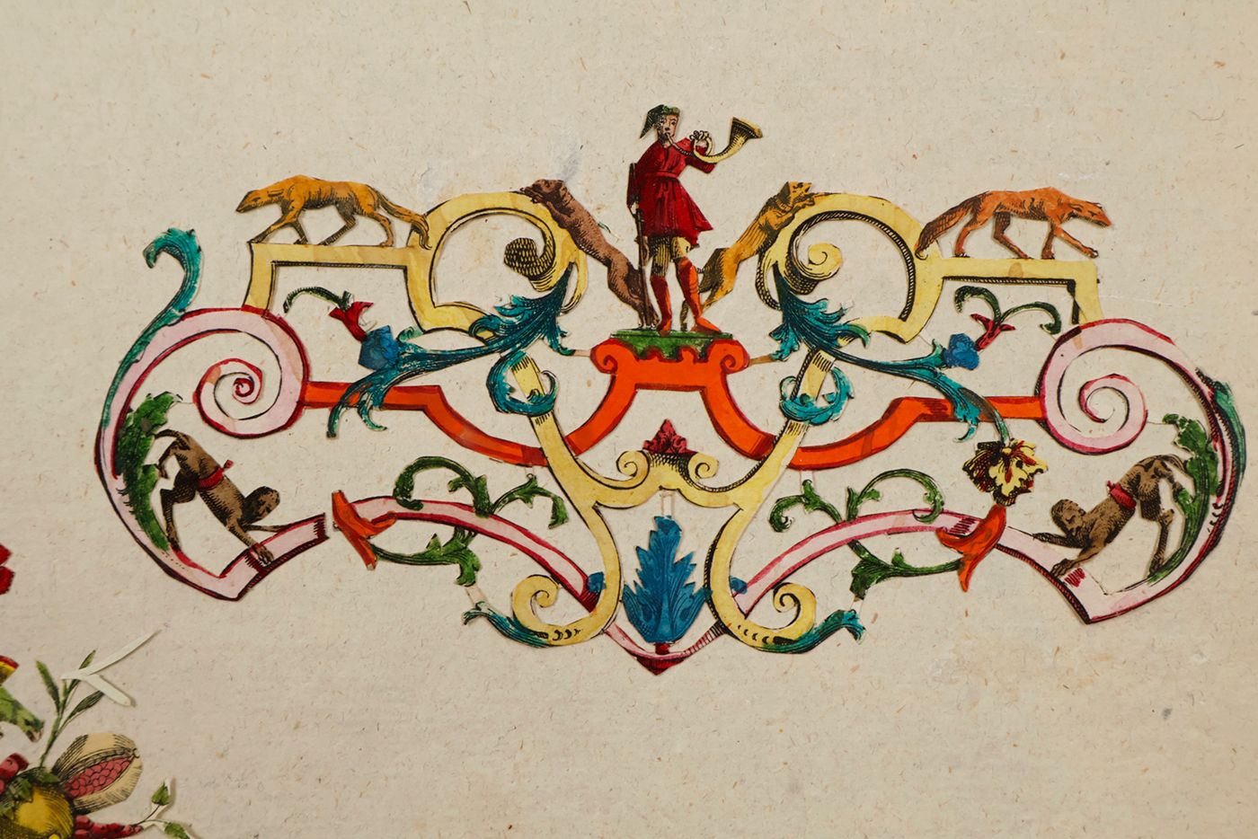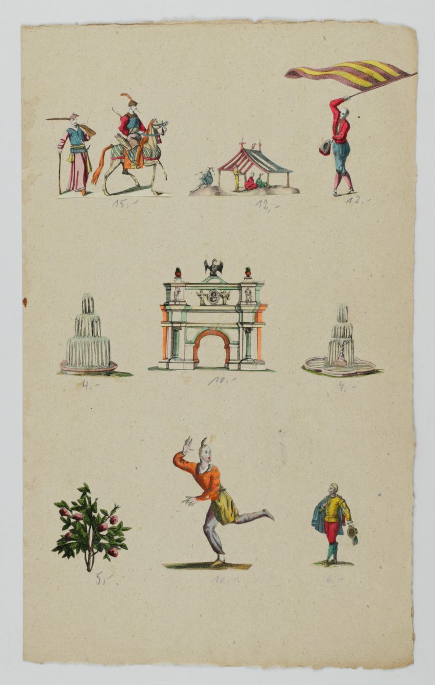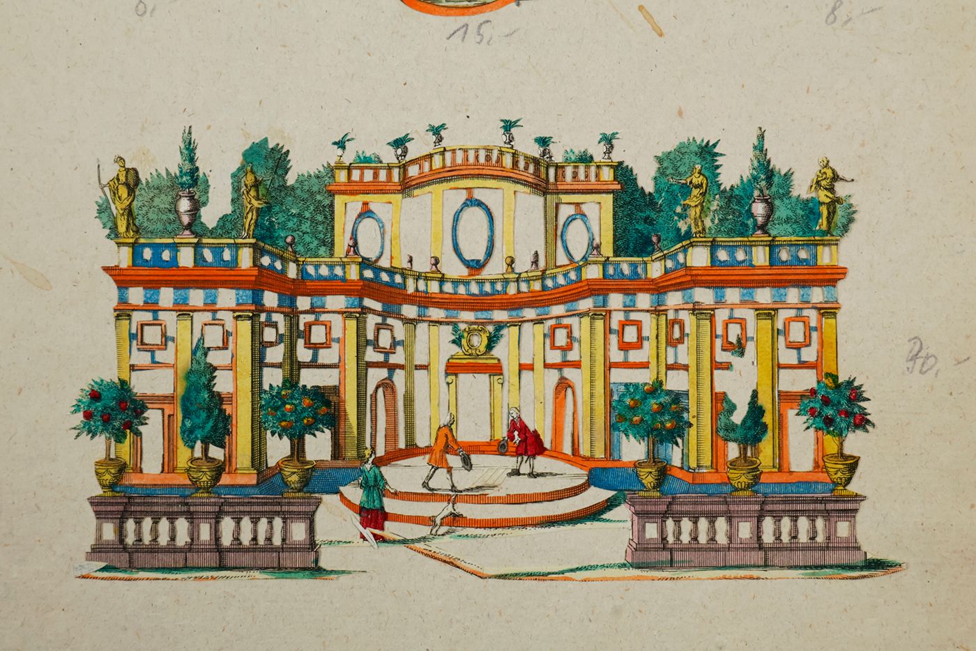 Martin Engelbrecht (1684-1756) and his brother Christian were successful German illustrators and engravers from the Augsburg School at the beginning of the 18th century. Martin Engelbrecht was probably the first to create cards specially designed for miniature theatres, portable dioramas that became highly successful in the second half of the 18th and early part of the 19th centuries, before being replaced by the magic lantern, home film and video, etc. Engelbrecht devoted entire series of these illustrations to the Italian and Chinese theatre. They were, however, also used in scrapbooks. It is rare to see so these original sheets, all, except one, without cutouts. An unusual high number show oriental, mostly Chines people, and scenery. All are in contemporary, if not original, hand-colouring. Most leaves uncut. Two blank leaves present in the rear. Paper strong and clean. Printing and colouring bright and natural. A unique item.