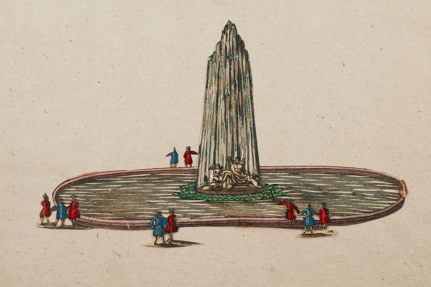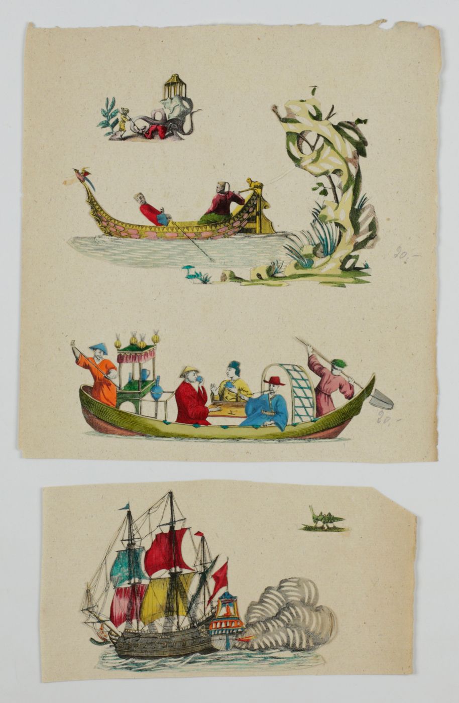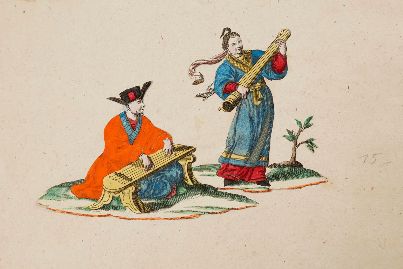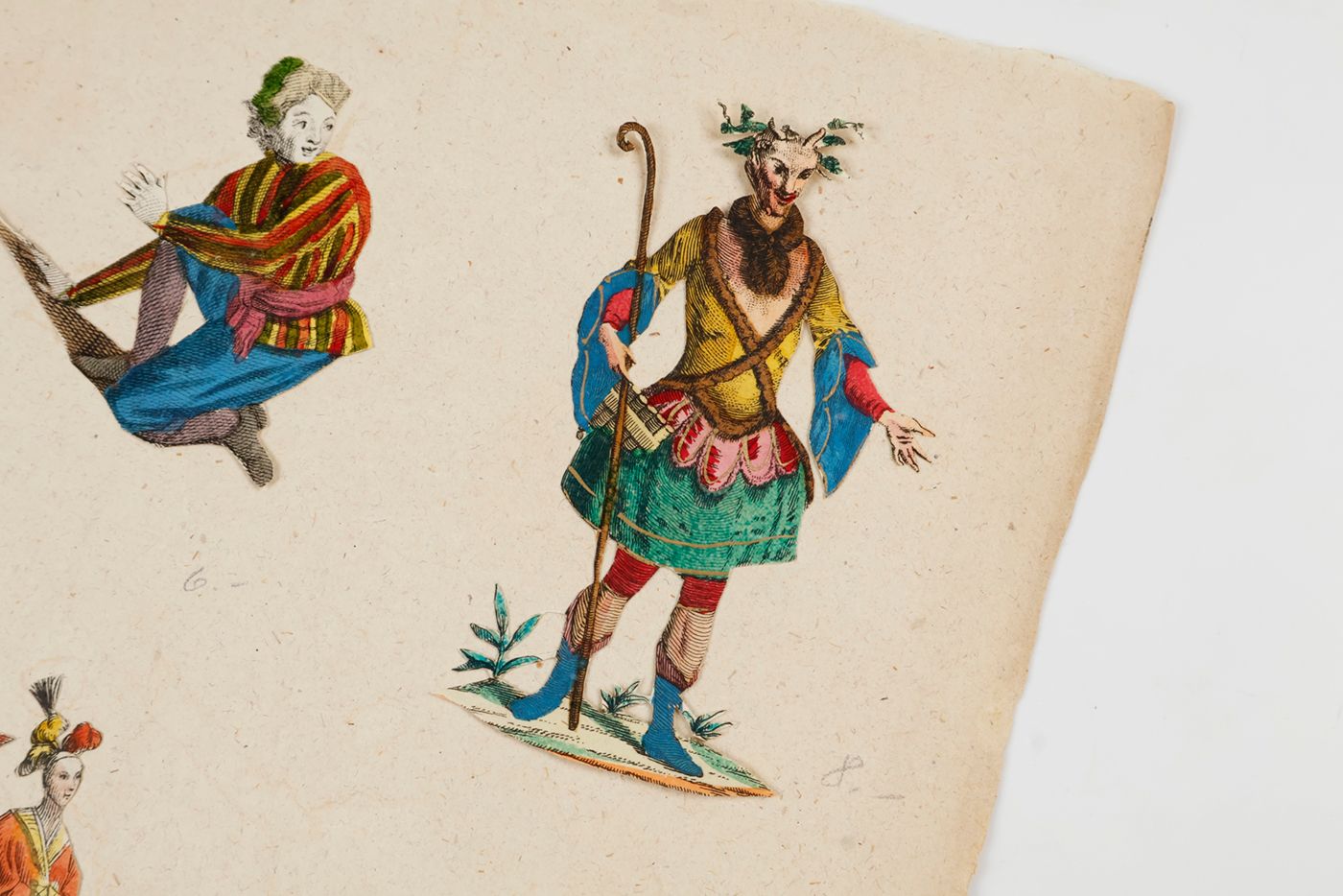 Martin Engelbrecht (1684-1756) and his brother Christian were successful German illustrators and engravers from the Augsburg School at the beginning of the 18th century. Martin Engelbrecht was probably the first to create cards specially designed for miniature theatres, portable dioramas that became highly successful in the second half of the 18th and early part of the 19th centuries, before being replaced by the magic lantern, home film and video, etc. Engelbrecht devoted entire series of these illustrations to the Italian and Chinese theatre. They were, however, also used in scrapbooks. It is rare to see so these original sheets, all, except one, without cutouts. An unusual high number show oriental, mostly Chines people, and scenery. All are in contemporary, if not original, hand-colouring. Most leaves uncut. Two blank leaves present in the rear. Paper strong and clean. Printing and colouring bright and natural. A unique item.