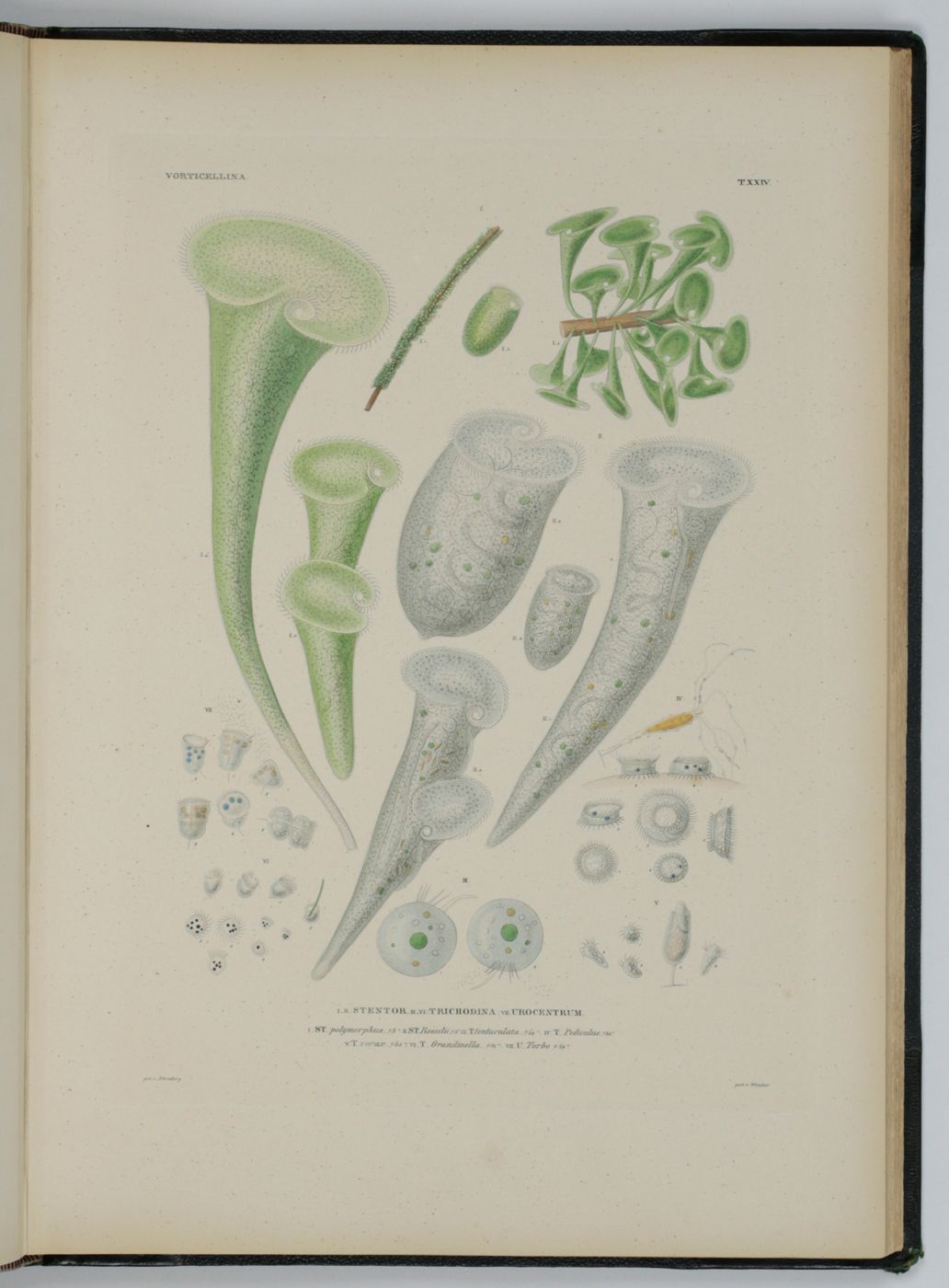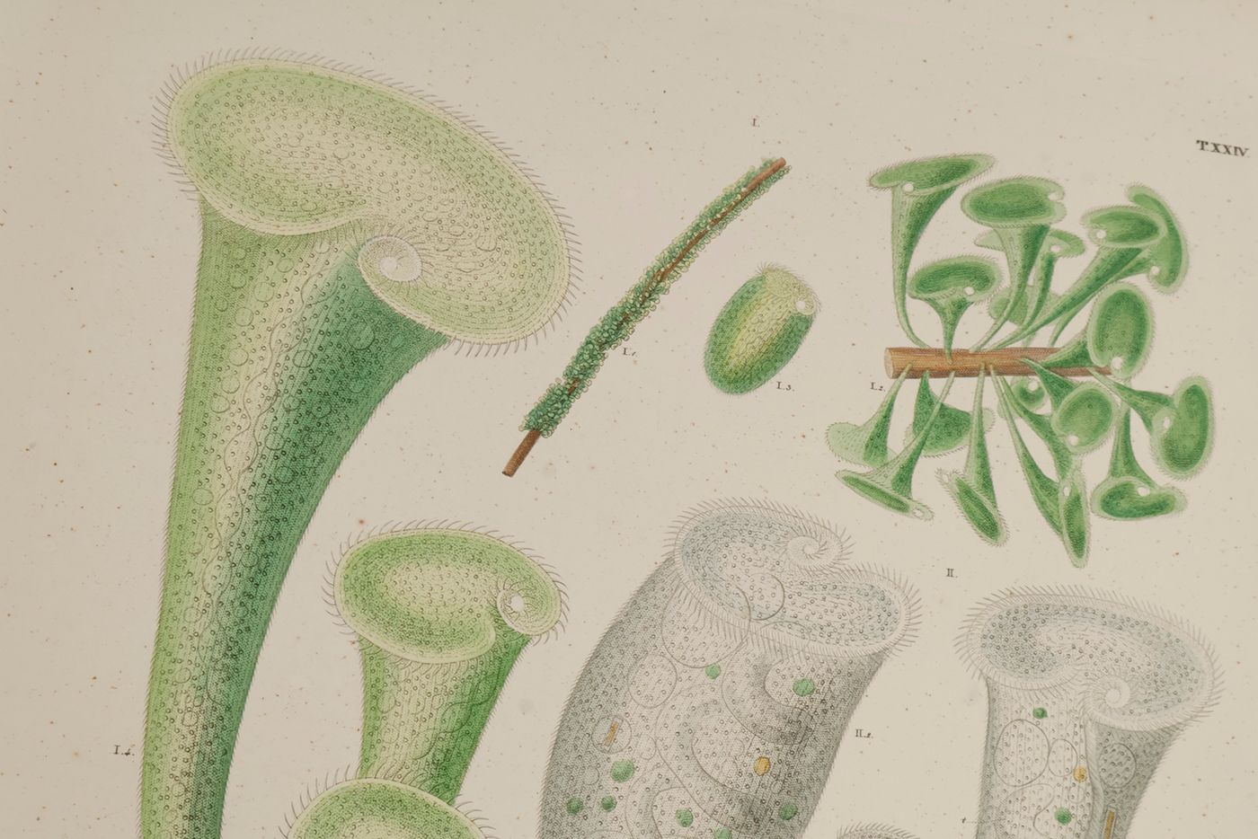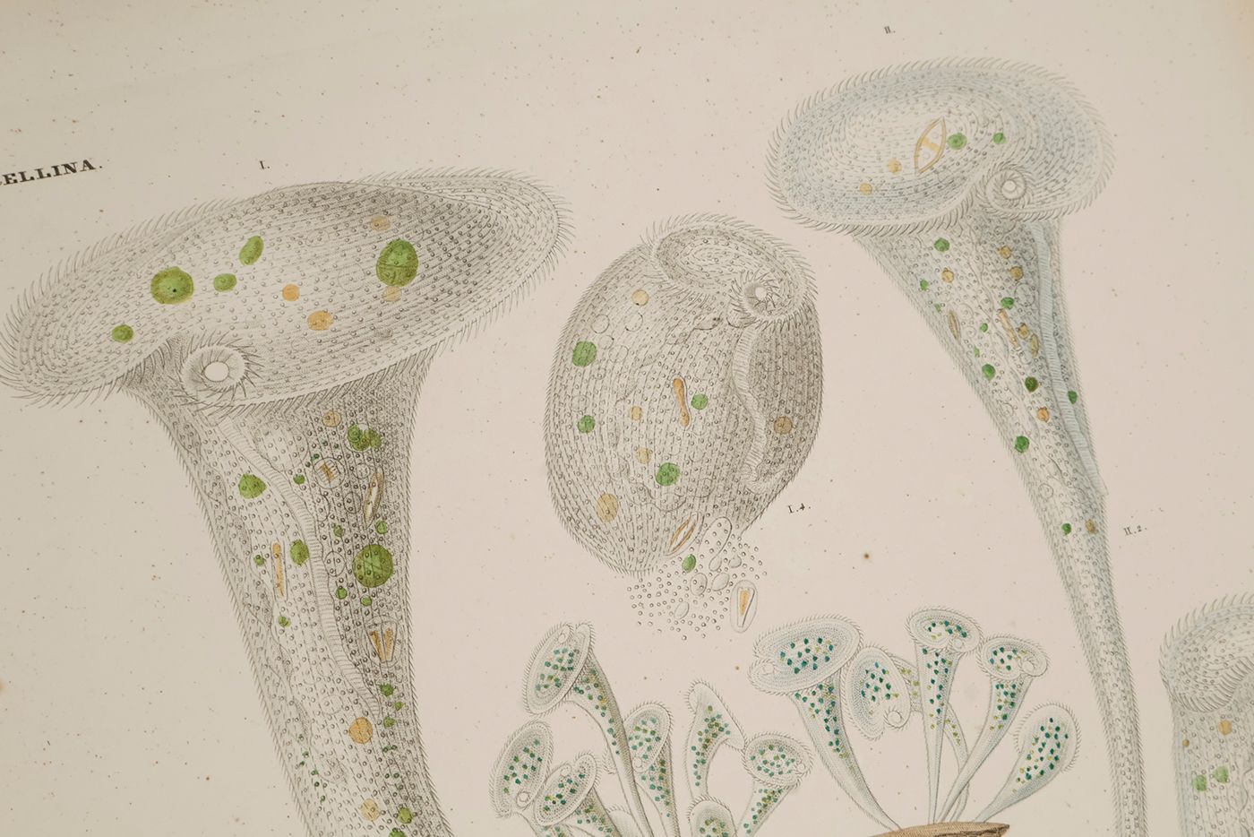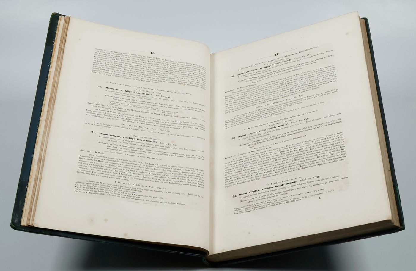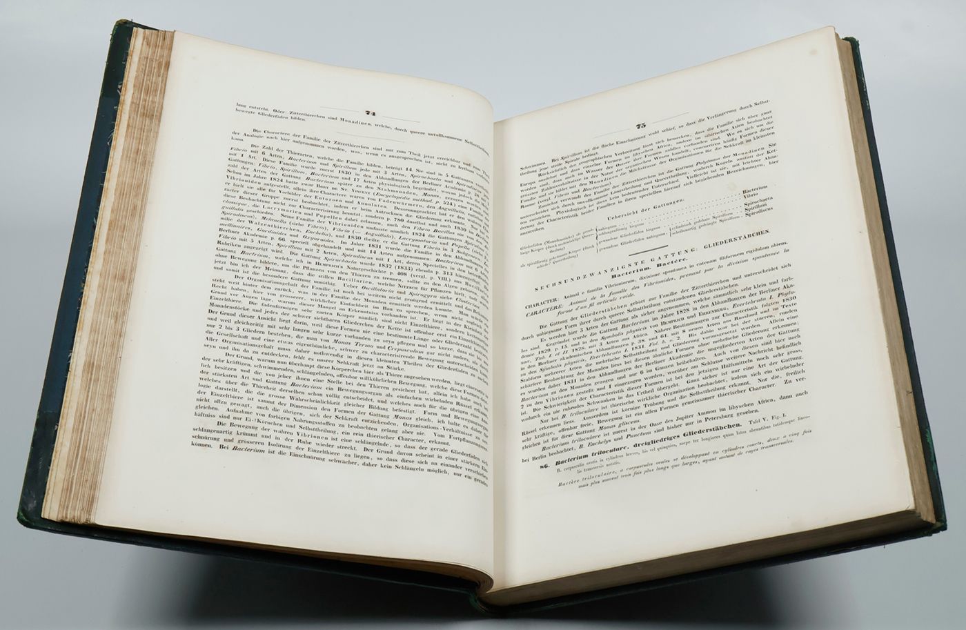 Magnum opus, introducing the systematic study of micro-organisms, and the concept that they are neither animals nor plants, of the German zoologist, explorer, and microscopist Chistian Gottfried Ehrenberg (1795-1876). The fine plates are after original drawings by Ehrenberg himself, who was an accomplished artist. "Ehrenberg was the premier microscopist for most of the 19th century, famous in his time for drawing attention to microorganisms both living and fossil. Today he is credited as one of the founders of protozoology by authoring a "truly monumental monograph", his 1838 Die Infusionsthierschen als volkommene Organismen [this work]. The monograph included an "Atlas" of 64 hand-colored plates illustrating living microorganisms. The work has been described as "the most sumptuously illustrated classic of the field" (Churchill 1989). By the late 1830's, Ehrenberg had turned his attention to studies of the remains of microorganisms in atmospheric dust, soils, minerals and sediments. He was the first to systematically investigate the remains of microorganisms, shells, skeletons, etc., and today is credited as the "Founder of Micropaleontology" (Dolan). Provenance: very small circular stamp of the Quekett Microscopical Club on both titles; a few text page margins, and on plate versos (not shining through), "Presented by Mr [illegible]" (dated 1884); gilt Club logo on spines' foot. Extremities a bit dry and worn or scuffed. Scattered foxing to the text, however, mostly clean. Some plates with minute spotting, due to the paper quality. Very rare work, most copies with more serious paper or foxing problems than here, all considered this is a very good copy. Cat. BM(NH), p. 515; Churchill, F. B. (1989). The guts of the matter: infusoria from Ehrenberg to Bütschli: 1838-1876. In: Journal of the History of Biology, 22 pp. 189-213; Dolan, J. R. (2022) The Lesser-Known Scientific Art of Christian Gottfried Ehrenberg; Nissen ZBI, 1244.