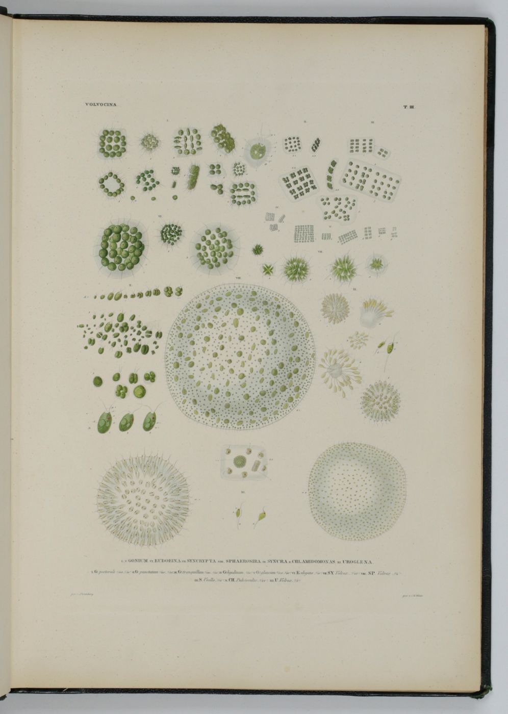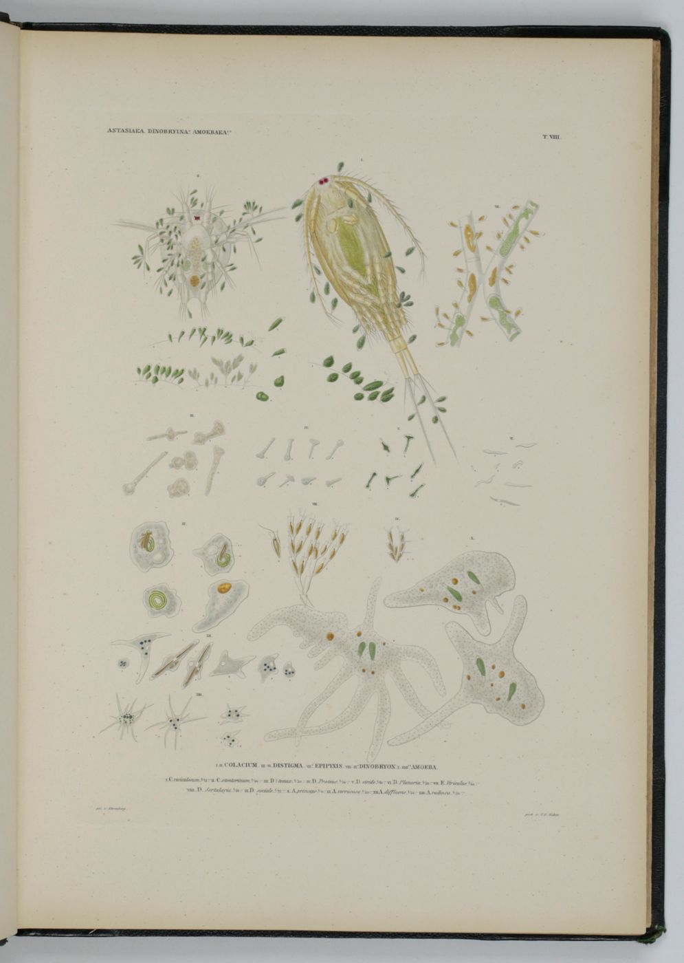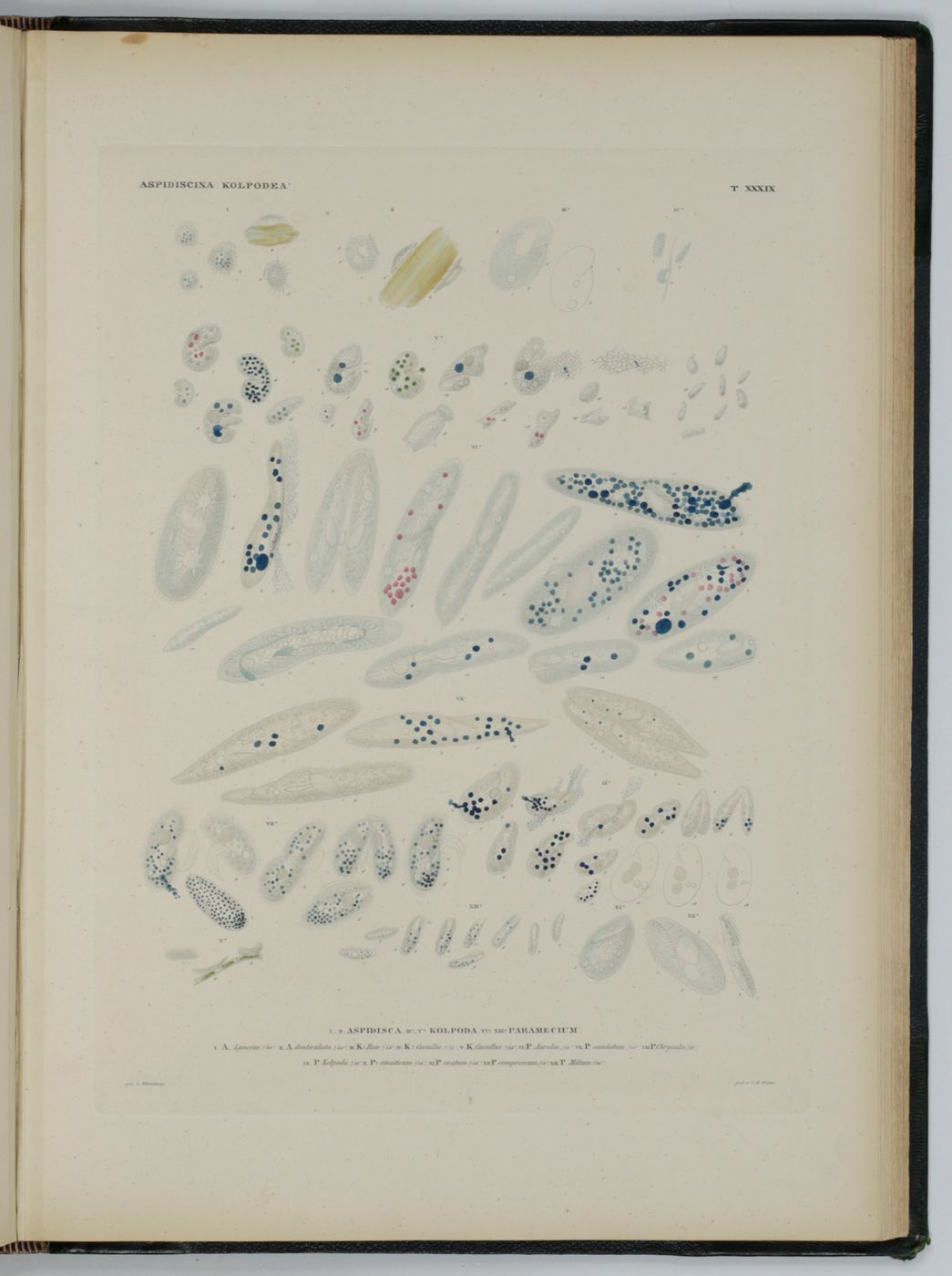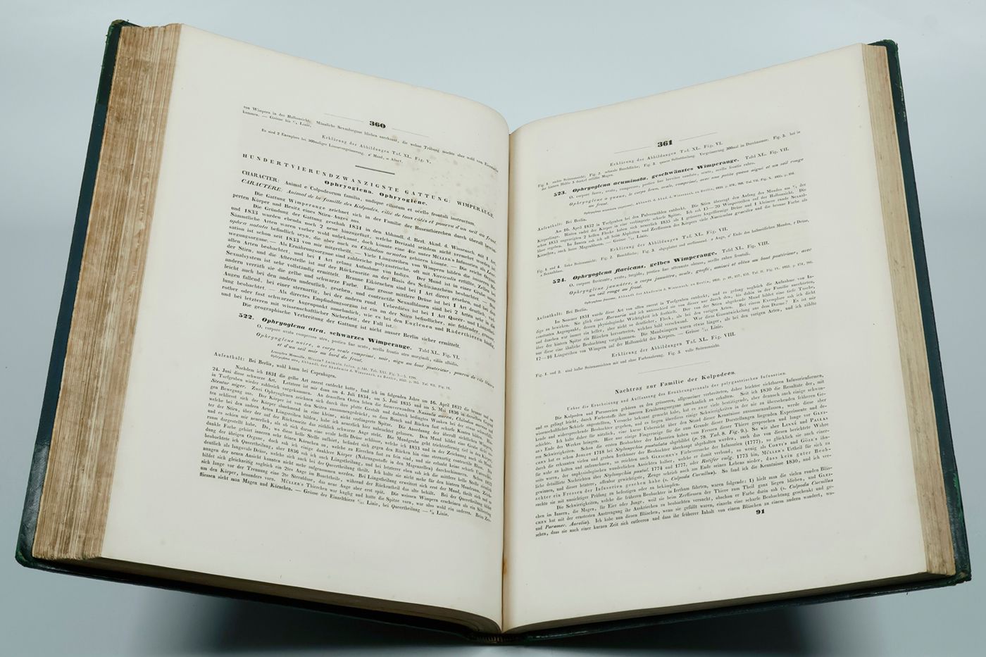 Magnum opus, introducing the systematic study of micro-organisms, and the concept that they are neither animals nor plants, of the German zoologist, explorer, and microscopist Chistian Gottfried Ehrenberg (1795-1876). The fine plates are after original drawings by Ehrenberg himself, who was an accomplished artist. "Ehrenberg was the premier microscopist for most of the 19th century, famous in his time for drawing attention to microorganisms both living and fossil. Today he is credited as one of the founders of protozoology by authoring a "truly monumental monograph", his 1838 Die Infusionsthierschen als volkommene Organismen [this work]. The monograph included an "Atlas" of 64 hand-colored plates illustrating living microorganisms. The work has been described as "the most sumptuously illustrated classic of the field" (Churchill 1989). By the late 1830's, Ehrenberg had turned his attention to studies of the remains of microorganisms in atmospheric dust, soils, minerals and sediments. He was the first to systematically investigate the remains of microorganisms, shells, skeletons, etc., and today is credited as the "Founder of Micropaleontology" (Dolan). Provenance: very small circular stamp of the Quekett Microscopical Club on both titles; a few text page margins, and on plate versos (not shining through), "Presented by Mr [illegible]" (dated 1884); gilt Club logo on spines' foot. Extremities a bit dry and worn or scuffed. Scattered foxing to the text, however, mostly clean. Some plates with minute spotting, due to the paper quality. Very rare work, most copies with more serious paper or foxing problems than here, all considered this is a very good copy. Cat. BM(NH), p. 515; Churchill, F. B. (1989). The guts of the matter: infusoria from Ehrenberg to Bütschli: 1838-1876. In: Journal of the History of Biology, 22 pp. 189-213; Dolan, J. R. (2022) The Lesser-Known Scientific Art of Christian Gottfried Ehrenberg; Nissen ZBI, 1244.