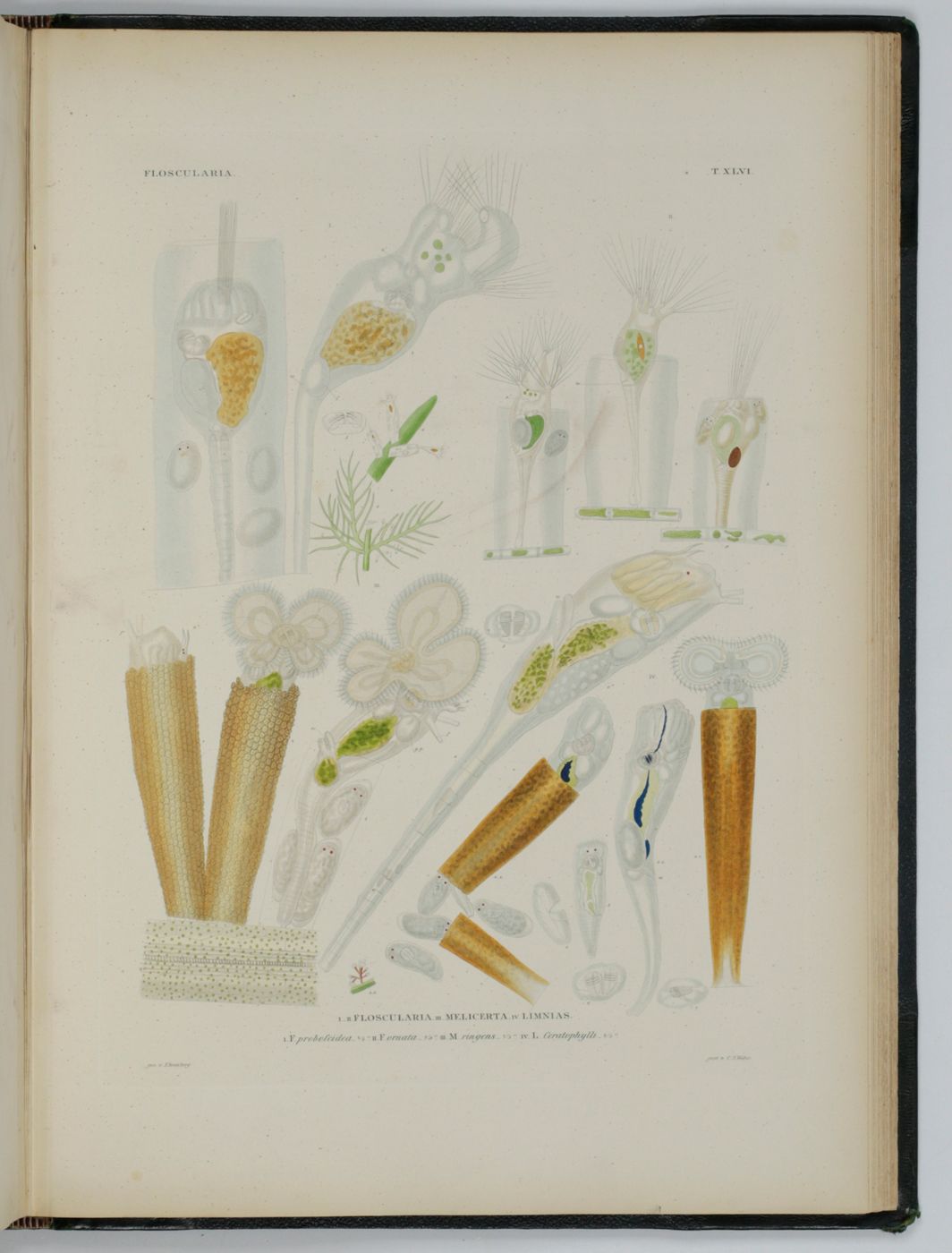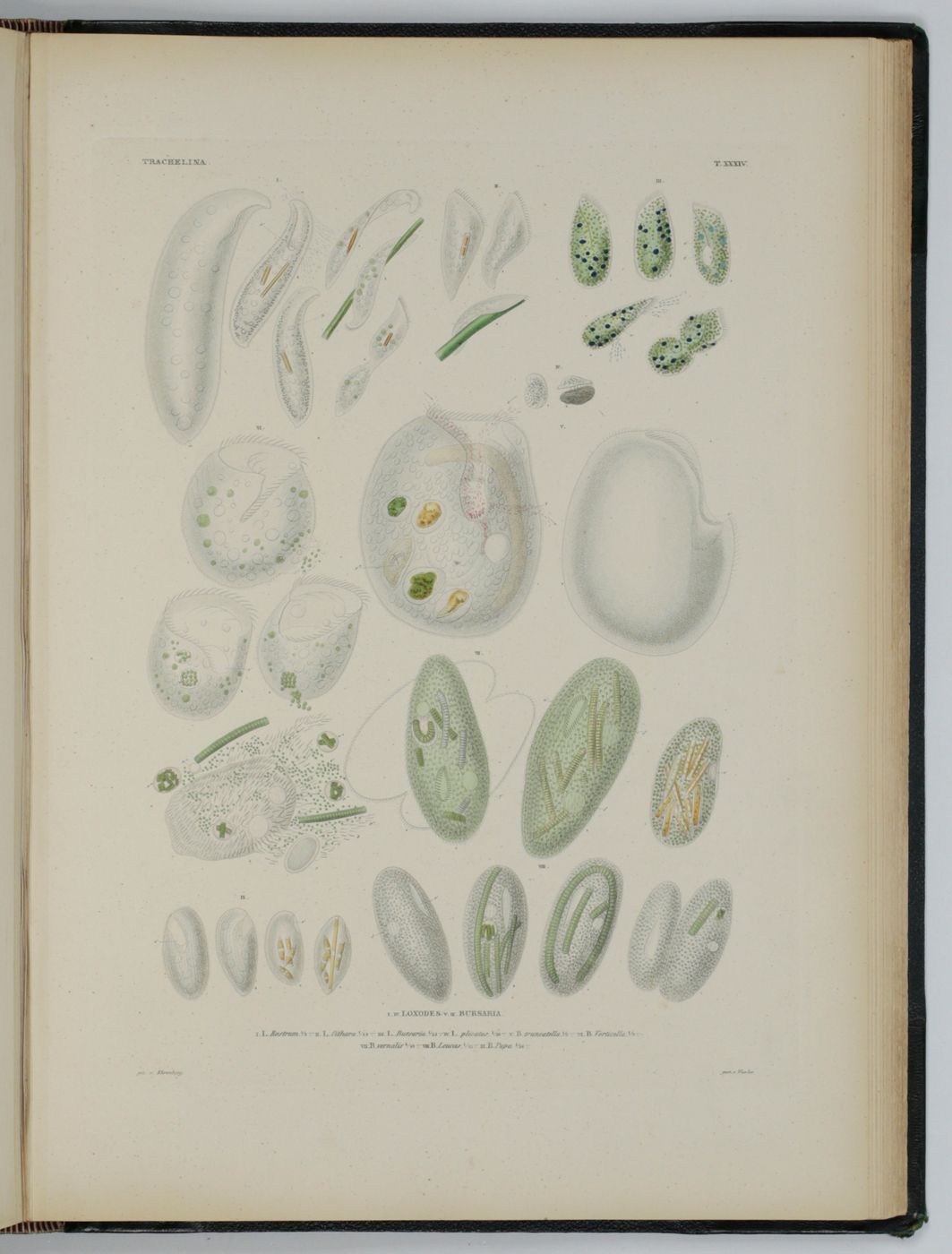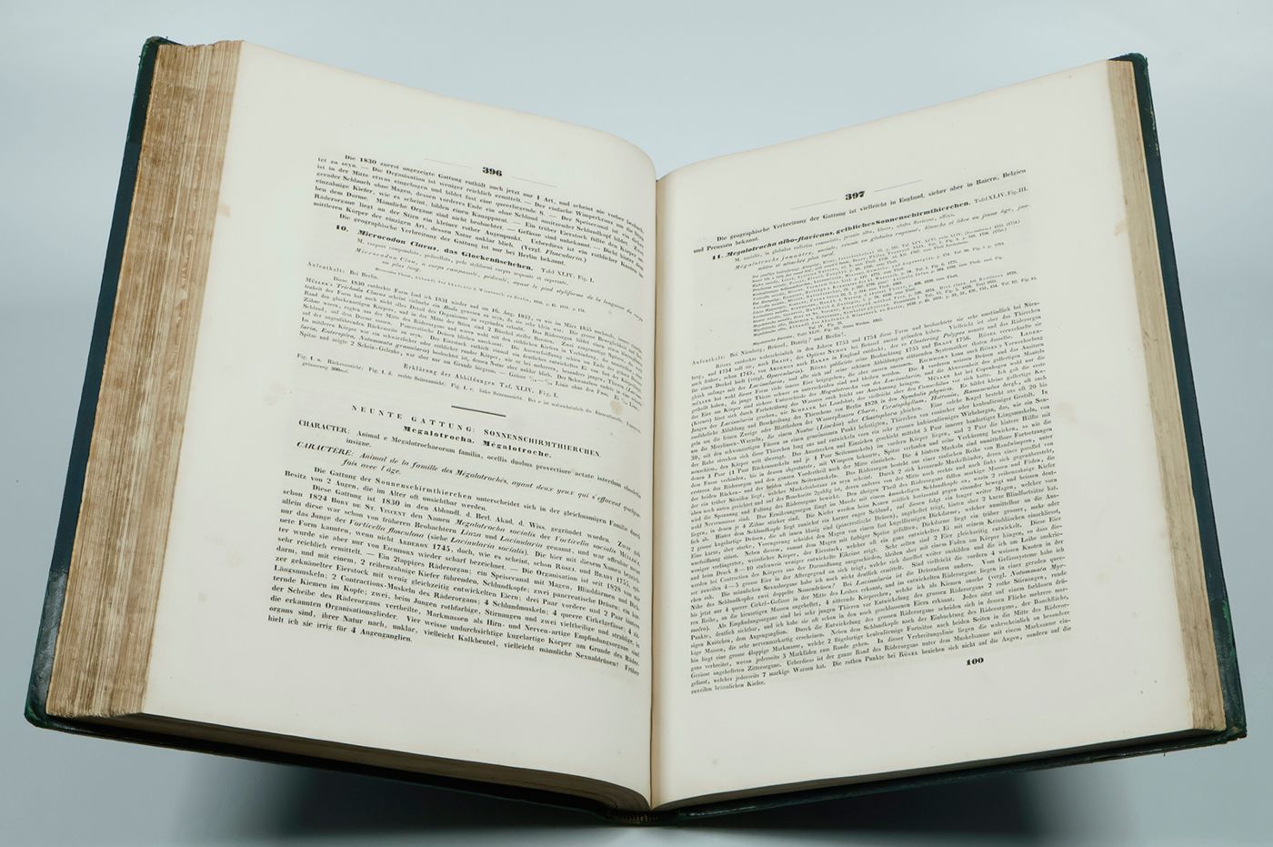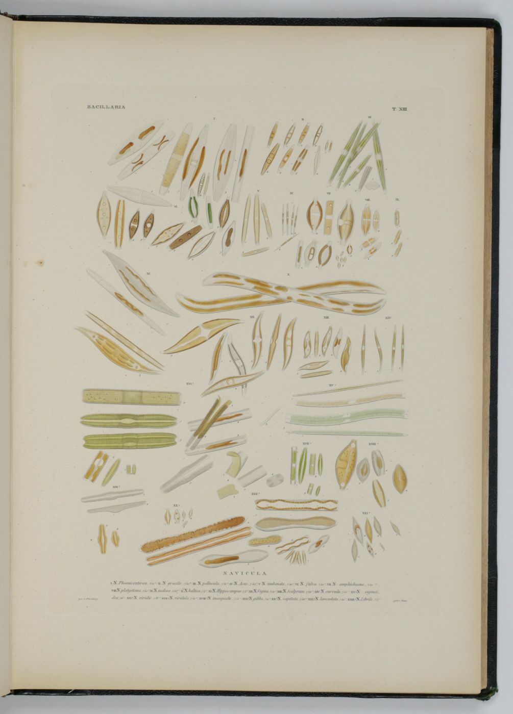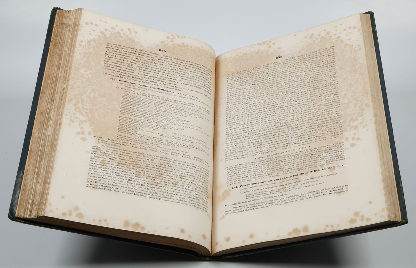 Magnum opus, introducing the systematic study of micro-organisms, and the concept that they are neither animals nor plants, of the German zoologist, explorer, and microscopist Chistian Gottfried Ehrenberg (1795-1876). The fine plates are after original drawings by Ehrenberg himself, who was an accomplished artist. "Ehrenberg was the premier microscopist for most of the 19th century, famous in his time for drawing attention to microorganisms both living and fossil. Today he is credited as one of the founders of protozoology by authoring a "truly monumental monograph", his 1838 Die Infusionsthierschen als volkommene Organismen [this work]. The monograph included an "Atlas" of 64 hand-colored plates illustrating living microorganisms. The work has been described as "the most sumptuously illustrated classic of the field" (Churchill 1989). By the late 1830's, Ehrenberg had turned his attention to studies of the remains of microorganisms in atmospheric dust, soils, minerals and sediments. He was the first to systematically investigate the remains of microorganisms, shells, skeletons, etc., and today is credited as the "Founder of Micropaleontology" (Dolan). Provenance: very small circular stamp of the Quekett Microscopical Club on both titles; a few text page margins, and on plate versos (not shining through), "Presented by Mr [illegible]" (dated 1884); gilt Club logo on spines' foot. Extremities a bit dry and worn or scuffed. Scattered foxing to the text, however, mostly clean. Some plates with minute spotting, due to the paper quality. Very rare work, most copies with more serious paper or foxing problems than here, all considered this is a very good copy. Cat. BM(NH), p. 515; Churchill, F. B. (1989). The guts of the matter: infusoria from Ehrenberg to Bütschli: 1838-1876. In: Journal of the History of Biology, 22 pp. 189-213; Dolan, J. R. (2022) The Lesser-Known Scientific Art of Christian Gottfried Ehrenberg; Nissen ZBI, 1244.