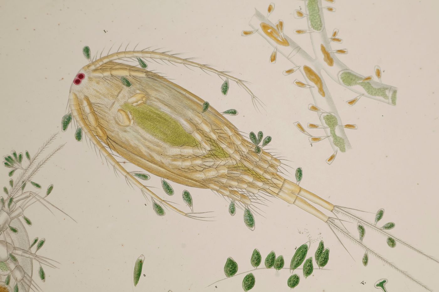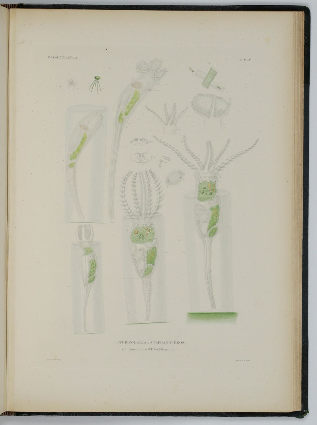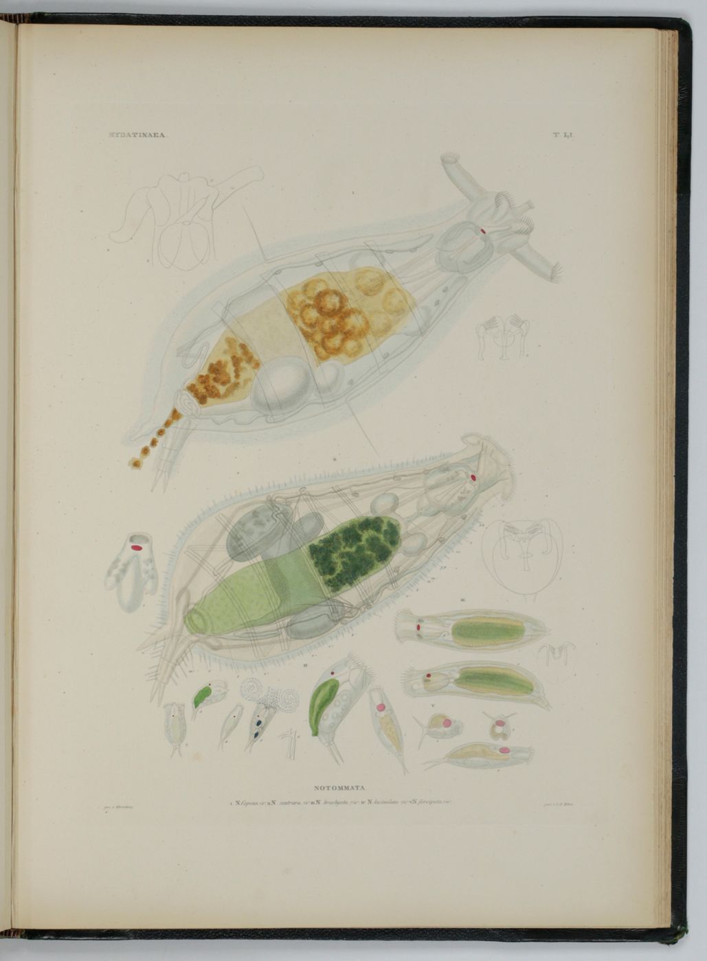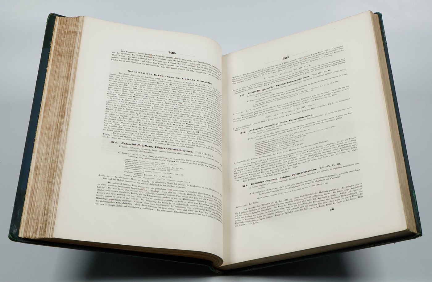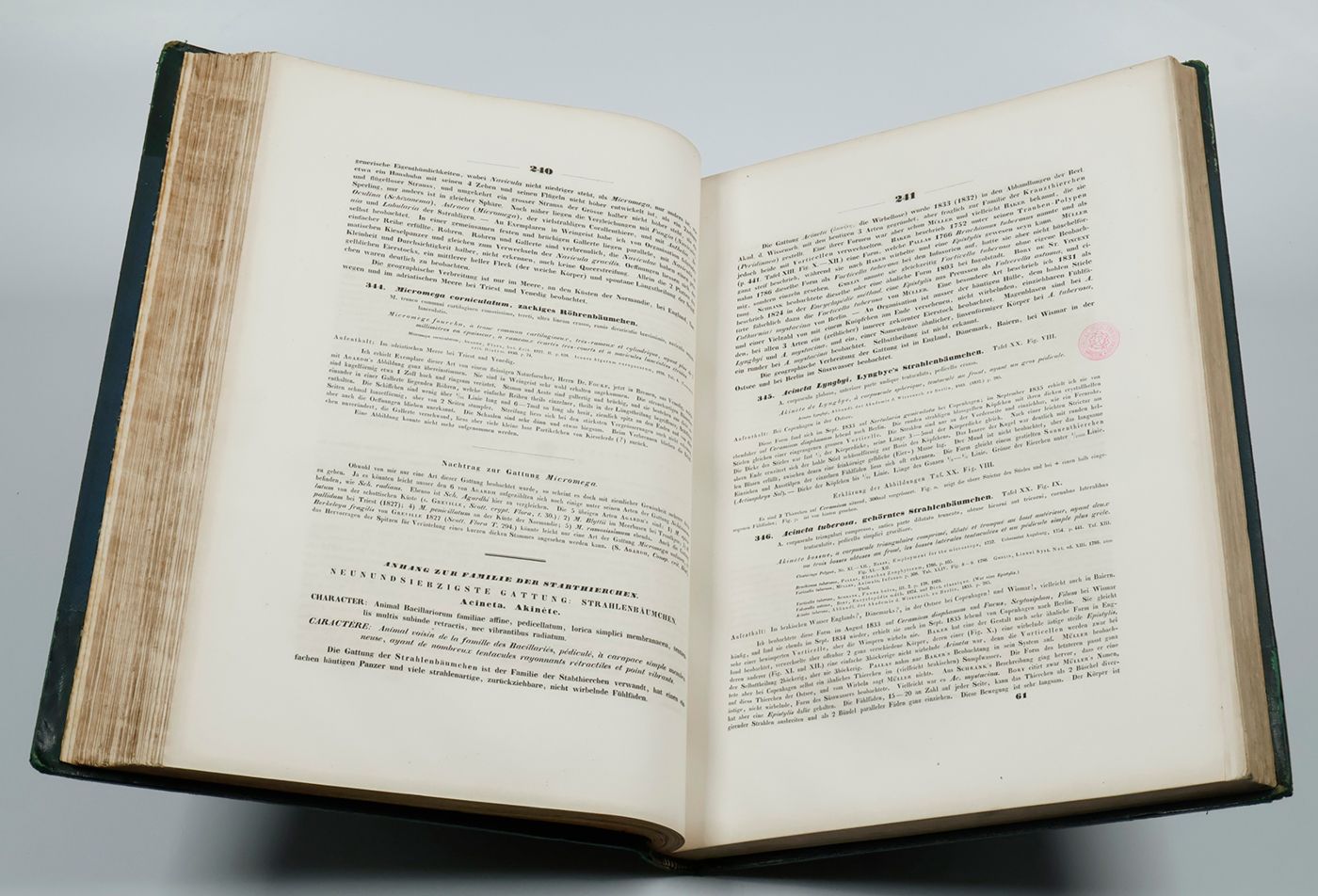 Magnum opus, introducing the systematic study of micro-organisms, and the concept that they are neither animals nor plants, of the German zoologist, explorer, and microscopist Chistian Gottfried Ehrenberg (1795-1876). The fine plates are after original drawings by Ehrenberg himself, who was an accomplished artist. "Ehrenberg was the premier microscopist for most of the 19th century, famous in his time for drawing attention to microorganisms both living and fossil. Today he is credited as one of the founders of protozoology by authoring a "truly monumental monograph", his 1838 Die Infusionsthierschen als volkommene Organismen [this work]. The monograph included an "Atlas" of 64 hand-colored plates illustrating living microorganisms. The work has been described as "the most sumptuously illustrated classic of the field" (Churchill 1989). By the late 1830's, Ehrenberg had turned his attention to studies of the remains of microorganisms in atmospheric dust, soils, minerals and sediments. He was the first to systematically investigate the remains of microorganisms, shells, skeletons, etc., and today is credited as the "Founder of Micropaleontology" (Dolan). Provenance: very small circular stamp of the Quekett Microscopical Club on both titles; a few text page margins, and on plate versos (not shining through), "Presented by Mr [illegible]" (dated 1884); gilt Club logo on spines' foot. Extremities a bit dry and worn or scuffed. Scattered foxing to the text, however, mostly clean. Some plates with minute spotting, due to the paper quality. Very rare work, most copies with more serious paper or foxing problems than here, all considered this is a very good copy. Cat. BM(NH), p. 515; Churchill, F. B. (1989). The guts of the matter: infusoria from Ehrenberg to Bütschli: 1838-1876. In: Journal of the History of Biology, 22 pp. 189-213; Dolan, J. R. (2022) The Lesser-Known Scientific Art of Christian Gottfried Ehrenberg; Nissen ZBI, 1244.