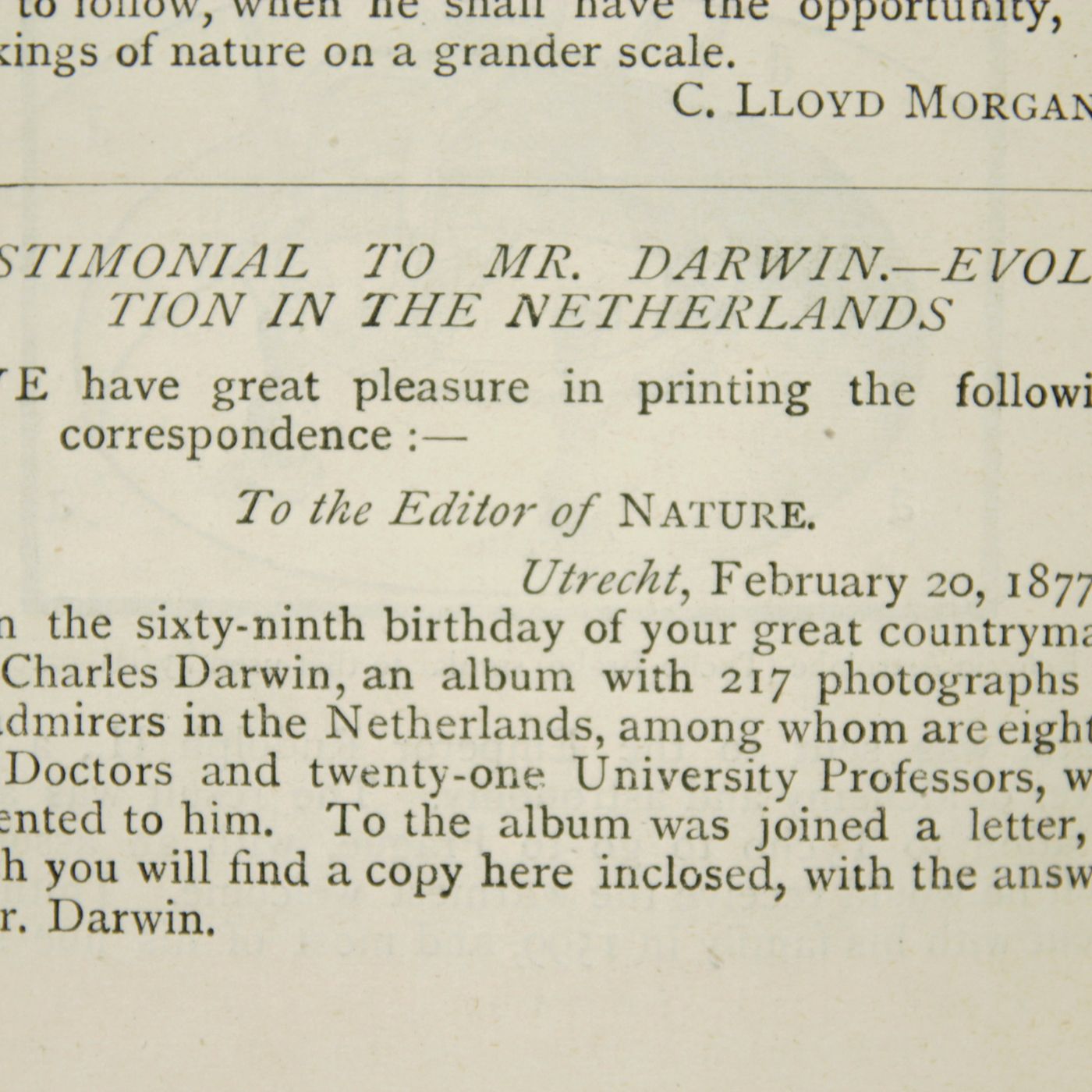 [Reply letter]. Testimonial to Mr. Darwin. - Evolution in the Netherlands.
