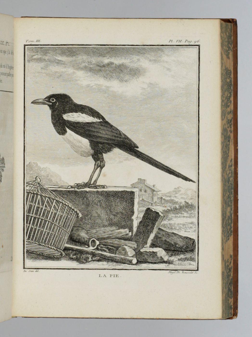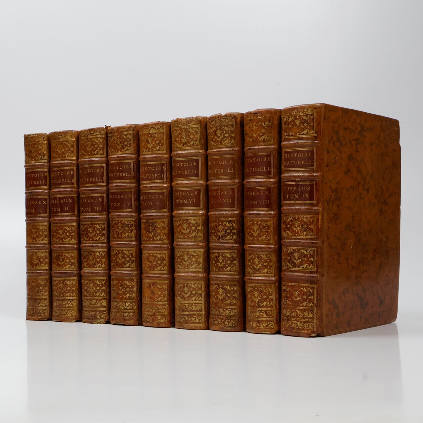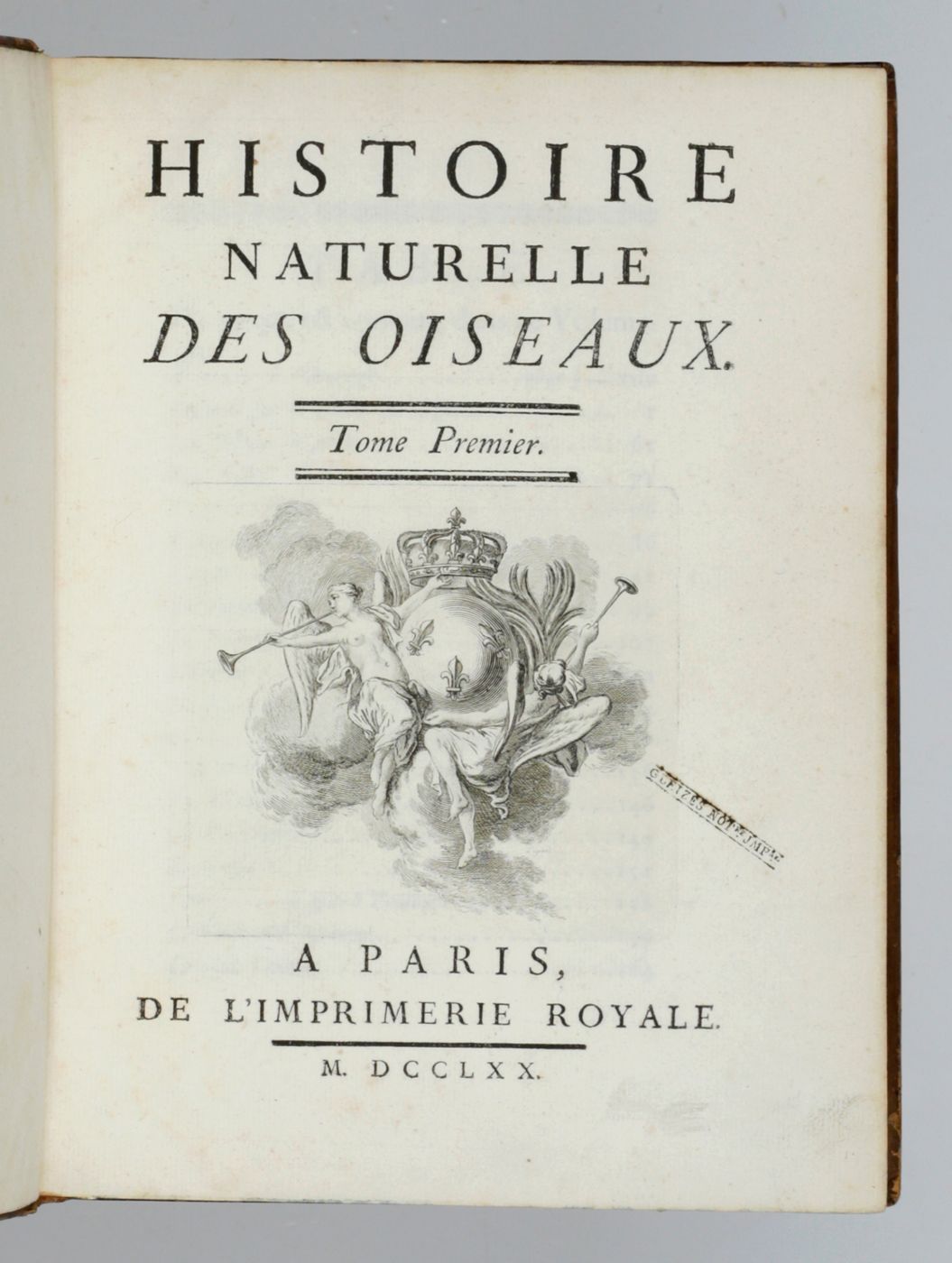 The complete, rare, birds part of the first 4to edition ("PMM edition") of this large and important series on natural history by Georges-Louis Leclerc, Comte de Buffon (1707-1788). Together they form a coherent segment of the whole work. Provenance: On the front pastedowns a bookplate, Bibliothèque du C.en [= Citoyen] Capon, over an older, usually removed, bookplate with coat of arms, of the French lawyer and politician Count François-Antoine de Boissy d'Anglas (1756-1826); small stamp "Gleizes Not.re. JMP" on titles. Some light rubbing to the boards edges and spine ends; apart from some minimal spotting, and a page text with a brown smudge, exceptionally clean. A very attractive, uniformly bound set. Ashworth and Bradley (1984). Theories of the Earth 1644-1830. The history of a genre, 25; Nissen ZBI, 672; PMM 198 (in part); Casey Wood, p. 267. Not in Nissen IVB.