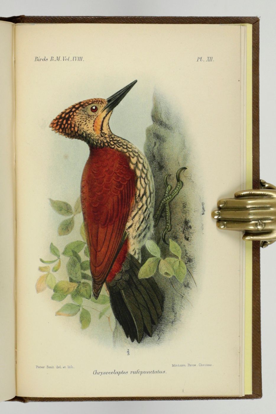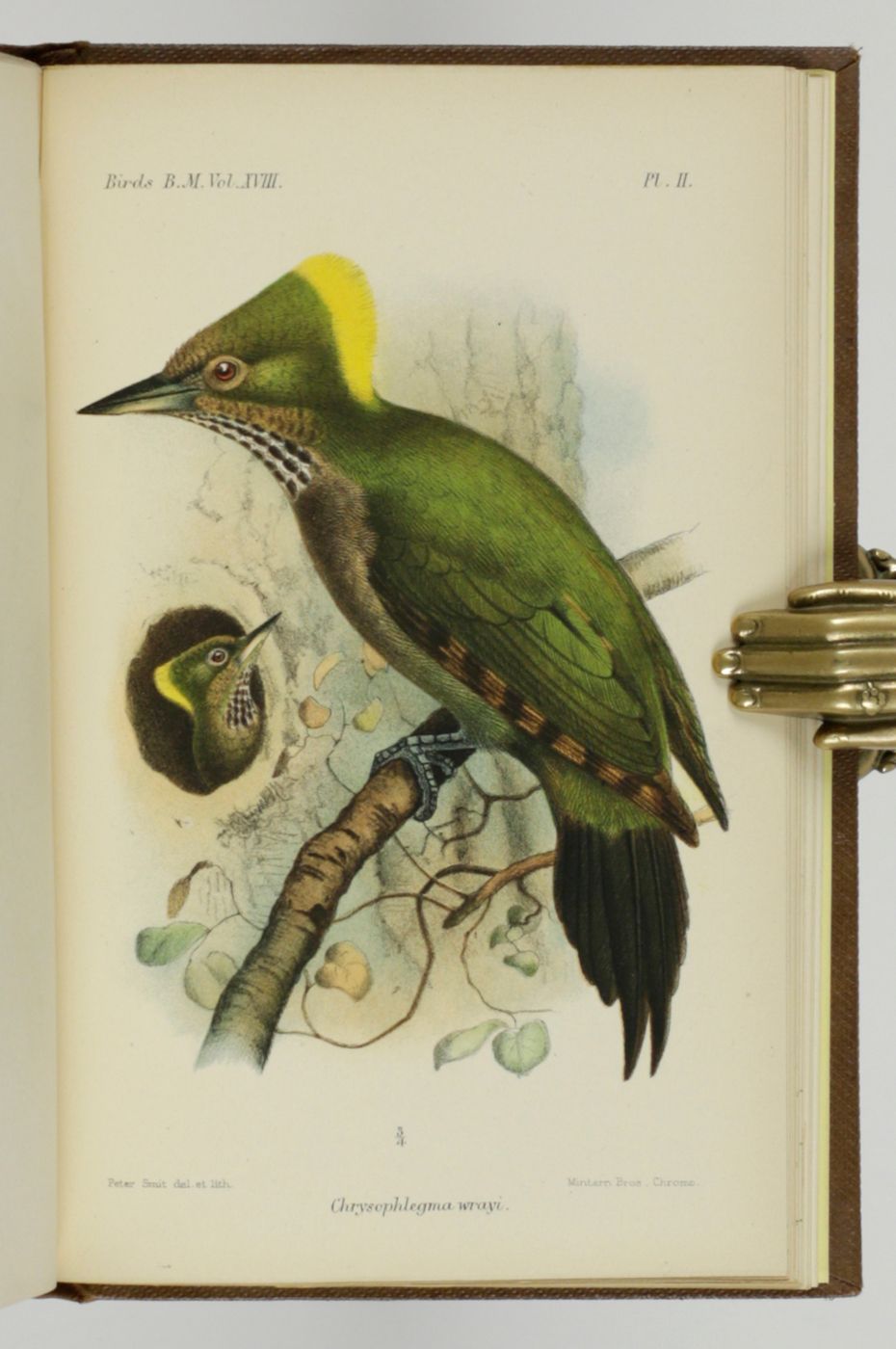 A splendid copy of a rare part of a large series, but the only volume dealing with the woodpeckers. With fine chromolithographed plates by Pierre "Peter" Smit, son of the famous Dutch natural history artist Joseph Smit (1836-1929), and an accomplished natural history illustrator himself. "Pierre's woodpeckers have rather clearer lines than the birds drawn by his father, and they are shown in livelier attitudes" (Jackson). Edward Hargitt (1835-1895) was a Scottish ornithologist. "[He] studied art in the Royal Scottish Academy and was a fairly good painter of landscapes. These paintings yield high prices today, auctioned at Christie's. He became also an ornithologist and developed into an expert on woodpeckers. ... During later years, he prepared 1300 drawings of woodpeckers for a proposed monograph" (Wikipedia). This monograph, however, was never published. Printed notice bound in. Notice and title toned, British Museum Board Room and date stamp [16 Aug. (18)90; perhaps the true date of publication], on the title; Board Room stamp also in the lower margin of last index page, otherwise an impeccable, clean copy. C. E. Jackson (1975) Bird illustrators, p. 81; Nissen IVB, 175; Zimmer, pp. 95-98; 838.