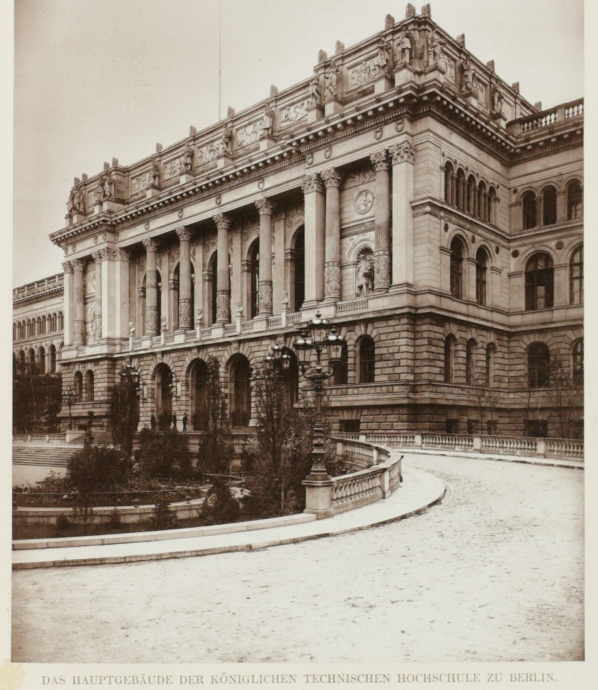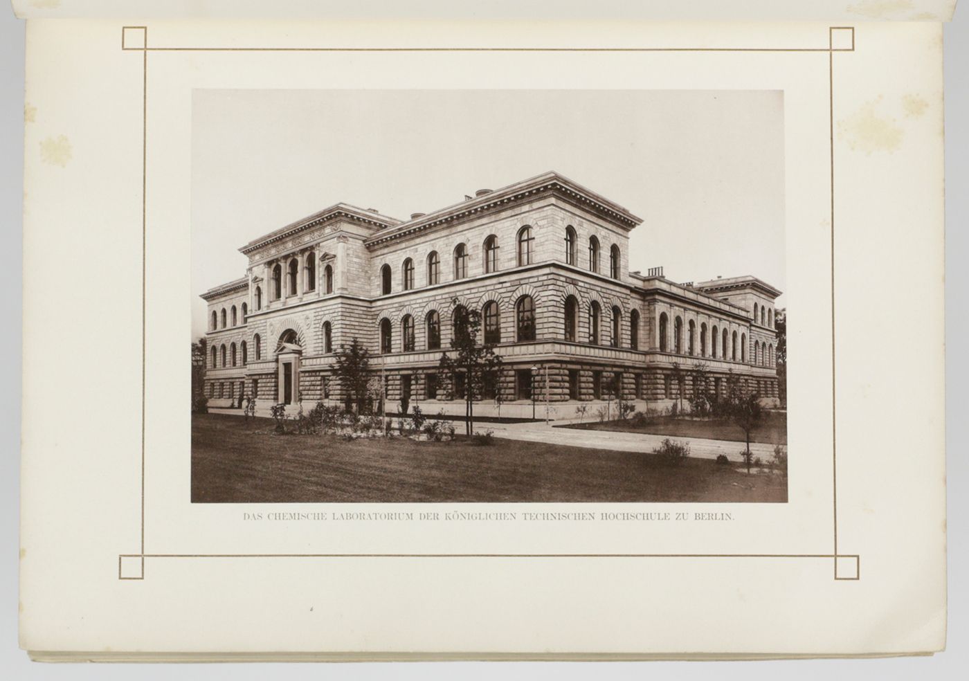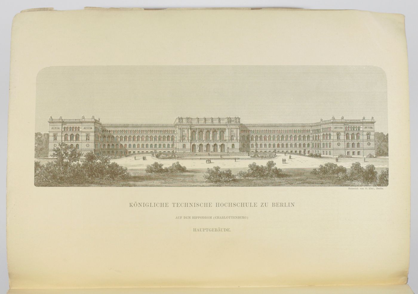 This jubilee volume commemorates the opening of a new building of the Royal Technical School (now: Technical University) of Berlin. It contains a detailed paper on its history, the new building and its architecture, with a steel-engraved frontispiece of the building, a floor plan and two large, mounted photographs of the exterior; as well as 13 contributions on several subjects by members of its staff. This includes a paper on photography of coloured images, with three mounted photos, Über die Photographie farbiger Gegenstände in den richtigen Tonverhältnissen, by H. W. Vogel; a work titled Die Gewinnung der Baumaterialen für Steinstrassen, with illustrations of newly developed machinery; a work on building battleships, Einiges über die Konstruktion von Kreuzerschiffen, with a fine, large, folded plate; a work titled Araceenformen in der Flora des Ornaments, with two beautiful chromolithographs, and several other illustrated contributions. The building still exists, it was heavily damaged during WWII but entirely repaired. The university alumni and professor list includes seven Nobel Prize laureates. The numbering, in Roman numbers, of pp. 91-93 is peculiar. Wrappers soiled; a few leaves a bit spotted, and some marginal soiling, however, in all a very good, unmarked copy.