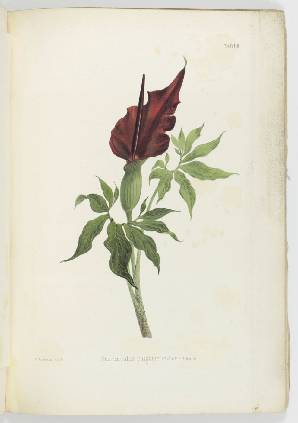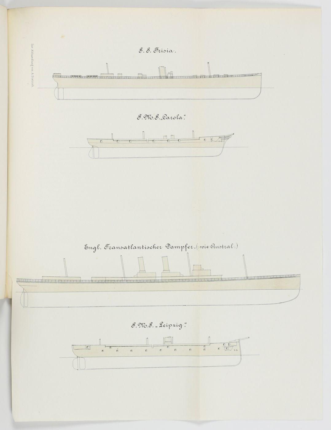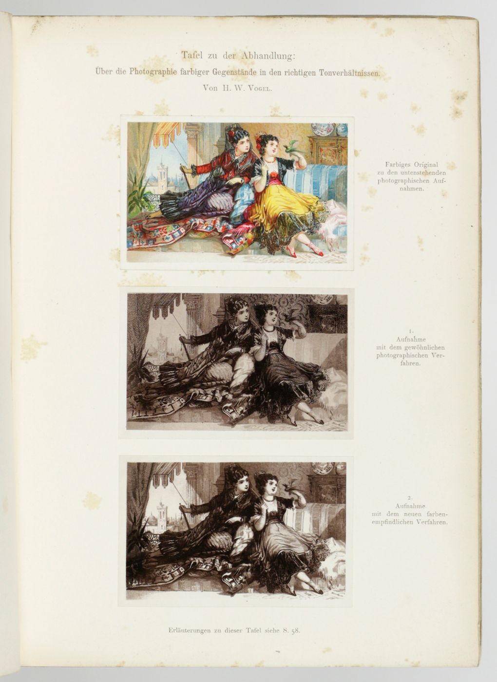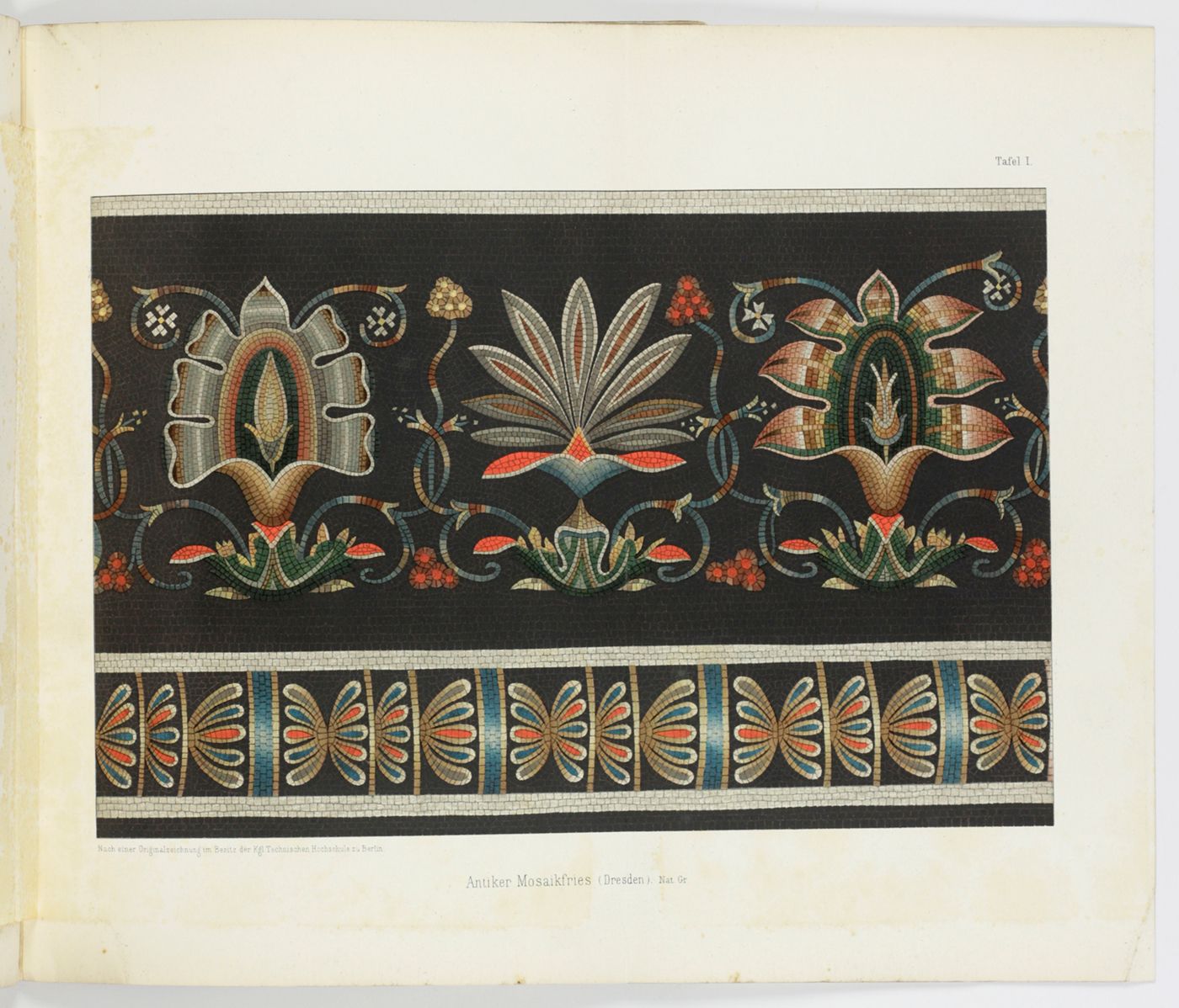 This jubilee volume commemorates the opening of a new building of the Royal Technical School (now: Technical University) of Berlin. It contains a detailed paper on its history, the new building and its architecture, with a steel-engraved frontispiece of the building, a floor plan and two large, mounted photographs of the exterior; as well as 13 contributions on several subjects by members of its staff. This includes a paper on photography of coloured images, with three mounted photos, Über die Photographie farbiger Gegenstände in den richtigen Tonverhältnissen, by H. W. Vogel; a work titled Die Gewinnung der Baumaterialen für Steinstrassen, with illustrations of newly developed machinery; a work on building battleships, Einiges über die Konstruktion von Kreuzerschiffen, with a fine, large, folded plate; a work titled Araceenformen in der Flora des Ornaments, with two beautiful chromolithographs, and several other illustrated contributions. The building still exists, it was heavily damaged during WWII but entirely repaired. The university alumni and professor list includes seven Nobel Prize laureates. The numbering, in Roman numbers, of pp. 91-93 is peculiar. Wrappers soiled; a few leaves a bit spotted, and some marginal soiling, however, in all a very good, unmarked copy.