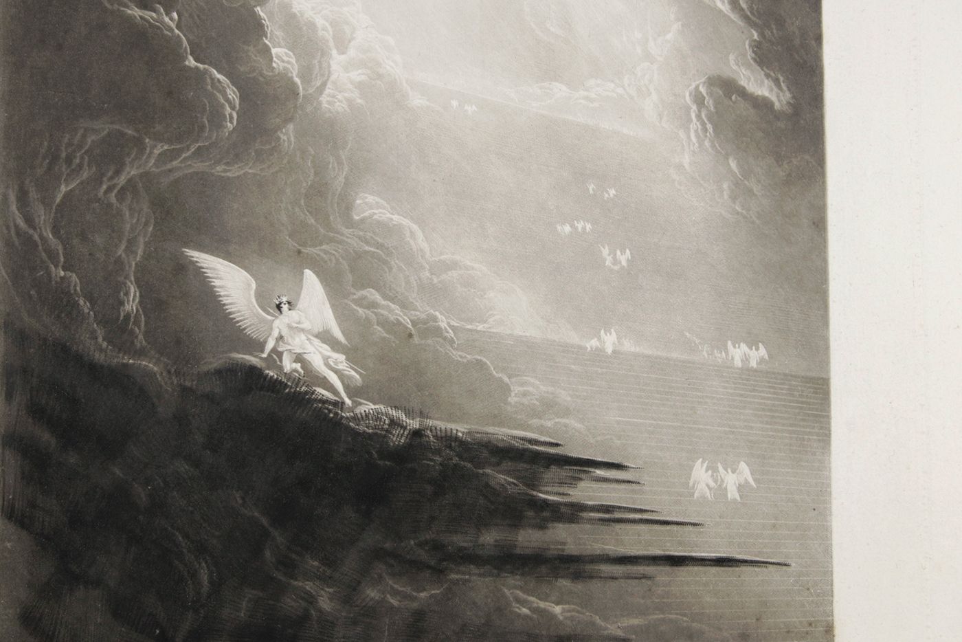 A magnificent proof-plate from the very rare folio edition with much larger sheets than those in the "usual" quarto editions (of which the largest was ca. 27 x 37 cm), and with the plates in the larger of two states (both sets separately engraved by Martin). This wonderfully detailed plate with Rembrandtesque light and shadows, illustrates Milton's Book 3, line 501. Satan viewing the Ascent to Heaven. John Martin (1789-1854) was an English Romantic painter, engraver and illustrator. He was celebrated for his typically vast and melodramatic paintings of religious subjects and fantastic compositions, populated with minute figures placed in imposing landscapes. Martin's paintings, and the prints made from them, enjoyed great success with the general public - in 1821 Thomas Lawrence referred to him as "the most popular painter of his day...Martin began to experiment with mezzotint technology, and as a result was commissioned to produce 24 engravings for a new edition of Paradise Lost - perhaps the definitive illustrations of Milton’s masterpiece" (Wikipedia). "The poem concerns the biblical story of the Fall of Man: the temptation of Adam and Eve by the fallen angel Satan and their expulsion from the Garden of Eden. Milton's purpose, stated in Book I, is to "justify the ways of God to men." (Wikipedia). Part of the original, corresponding text by Milton neatly written in an old hand below the printed caption. Light, scattered, mostly marginal foxing, otherwise in excellent condition.