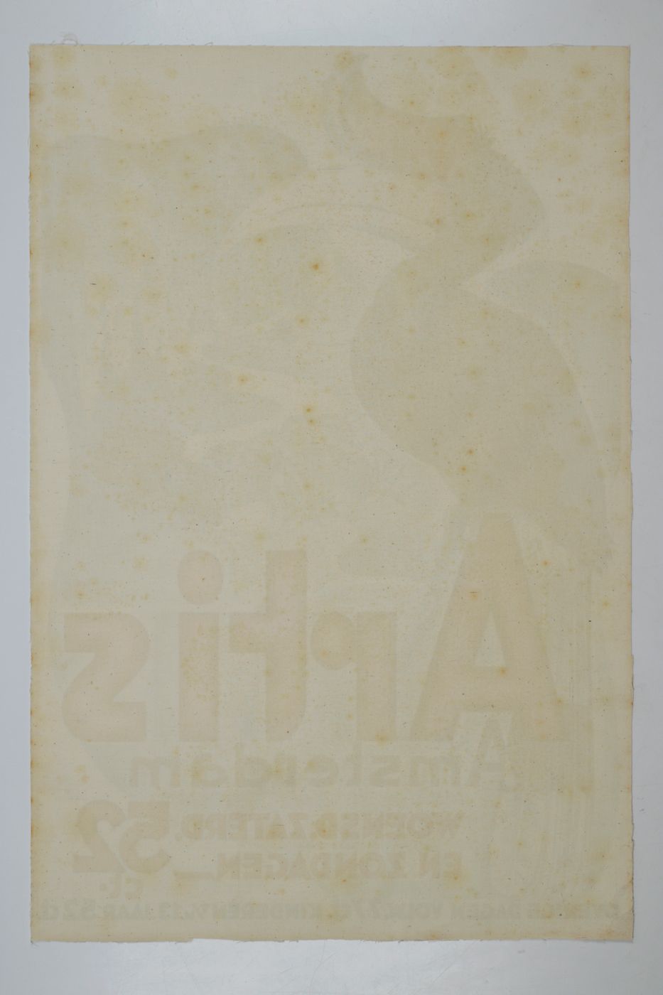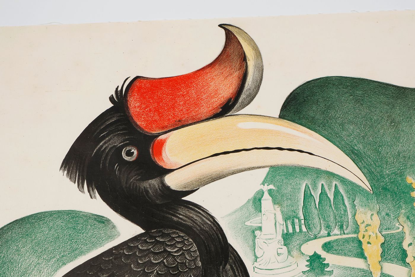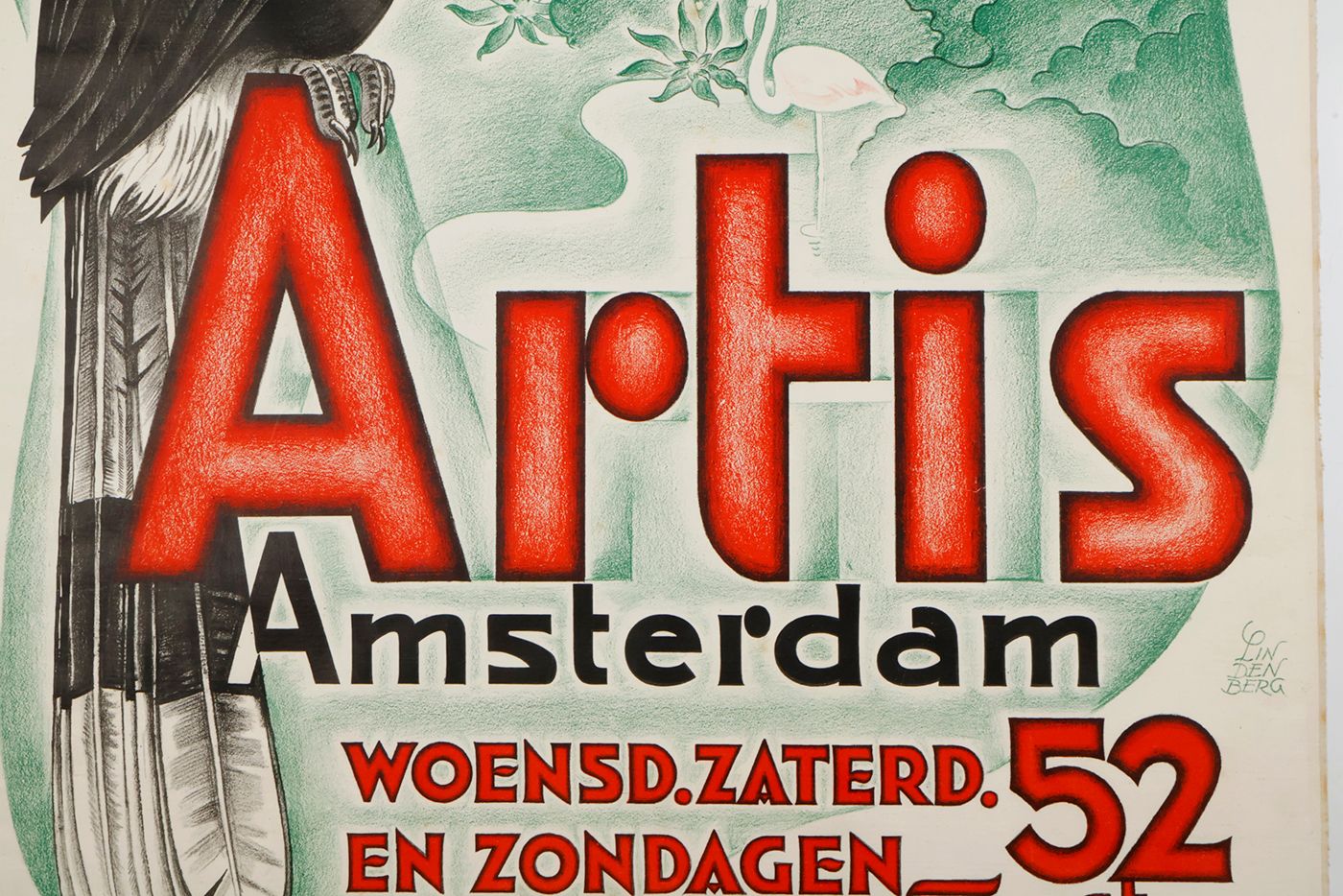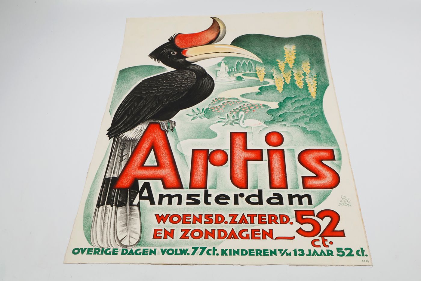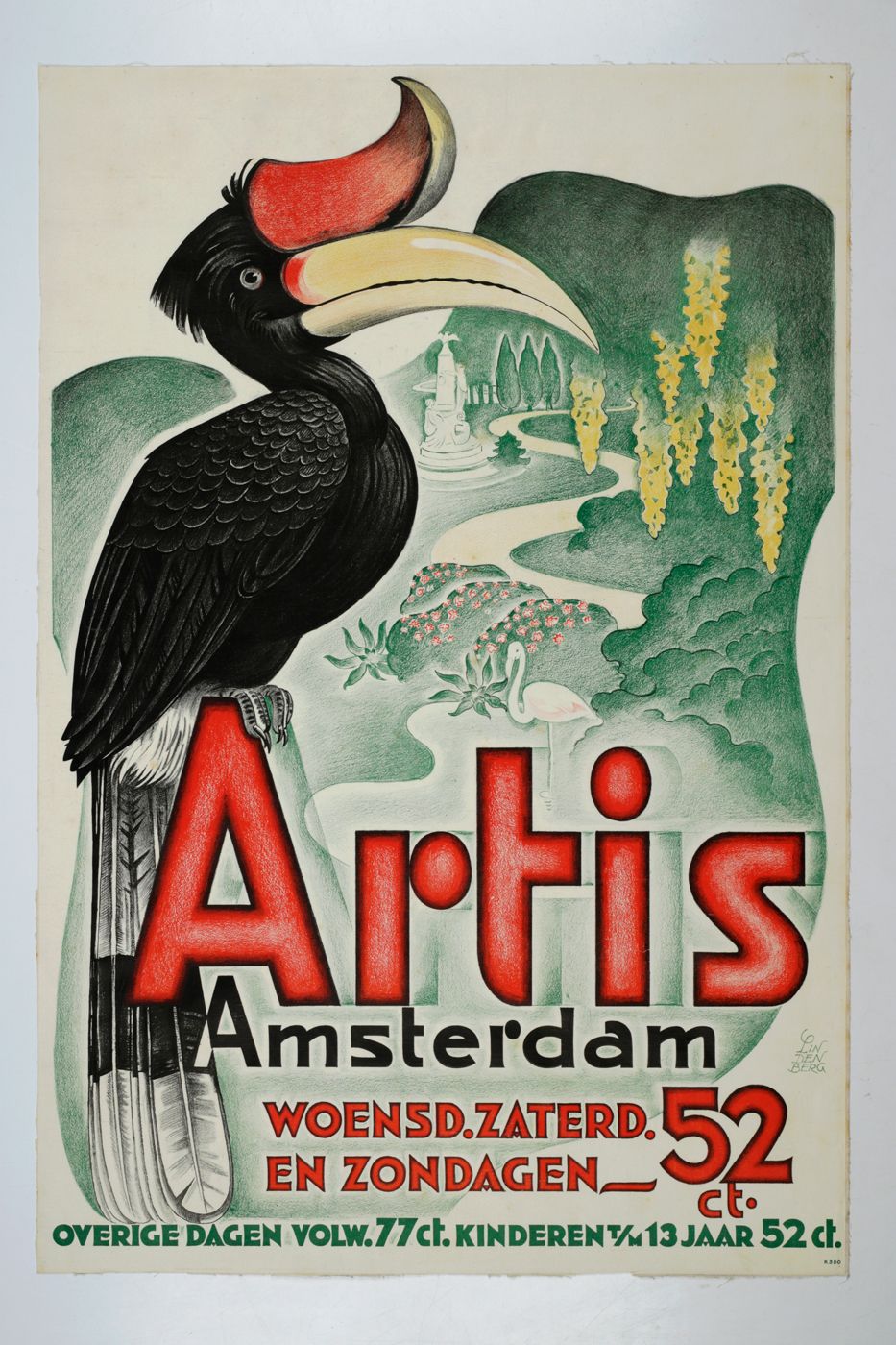 A stunning, large poster announcing a reduced lower entrance fee to the Amsterdam public zoo (founded 1838), named after a Latin inscription above the entrance gate, Natura Artis Magistra [nature is the teacher of the arts], usually abbreviated to the middle word, "Artis". The illustration shows a rhinoceros hornbill - a bird from the forests of the Malay archipelago and Thailand - with, in the background, a stylized rendition of the zoo, with a flamingo and the Westerman monument, erected after the death of the zoo's first director and one of its three founders, Gerardus Frederik Westerman (1807-1890). The complete text is as follows: Artis Amsterdam. Woensd. Zaterd. en Zondagen 52 ct. Overige dagen Volw. 77 ct. kinderen t/m 13 jaar 52 ct. [Wednesdays, Saturdays, and Sundays 52 cent. Other days Adults 77 cent. Children up to 13 years 52 cent.]. These represent the entrance prices 90 years ago, which is 85x the price of today... The print is numbered K390 in the lower right corner. Unfortunately, little if anything is known about the artist, Lindenberg, apart from him or her being an accomplished illustrator. Weak spotting on verso, very slight, marginal creasing; the lower margin a bit rough, otherwise fine. Rare, especially in this excellent condition.