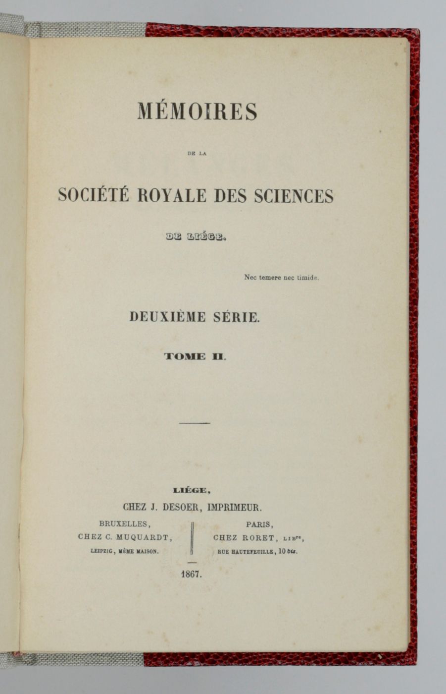 Liége, J. Desoer, 1867. 8vo (22.5 x 14.3 cm). 352 pp. 20th-century half cloth over reptile-skin boards. Original printed wrappers bound in.