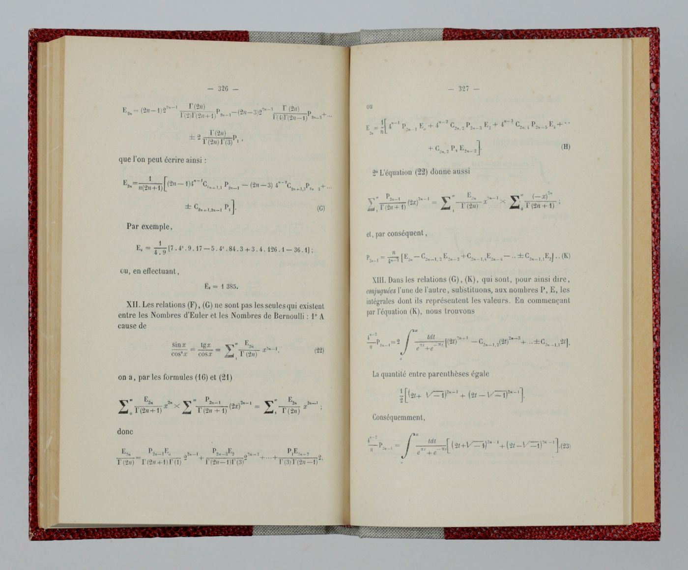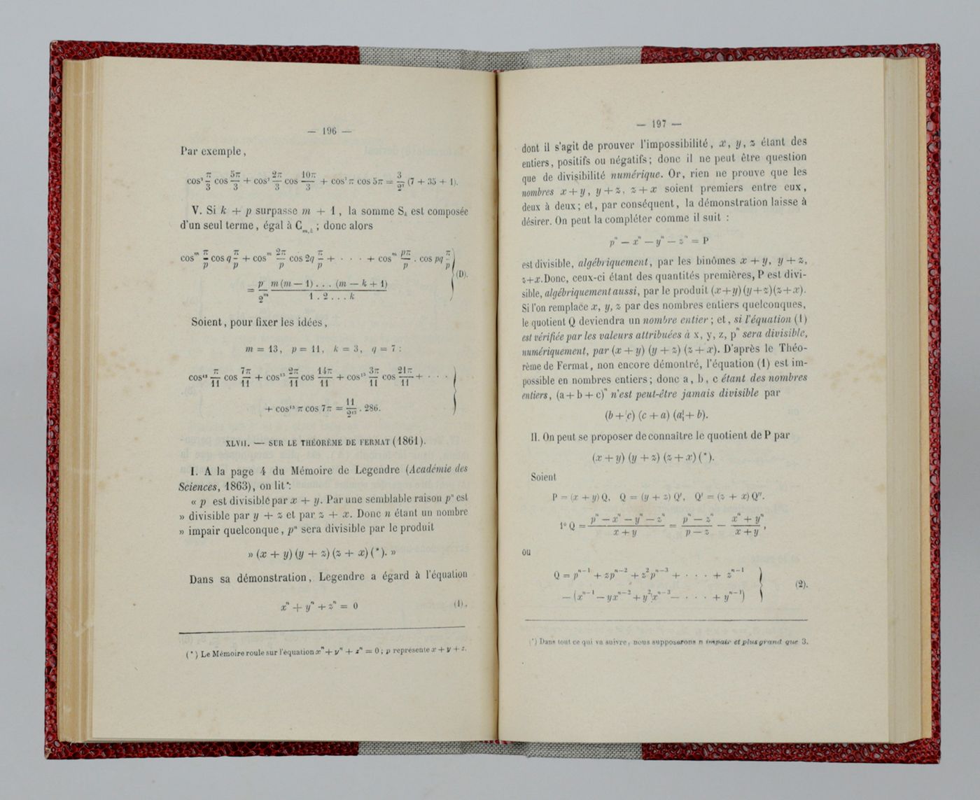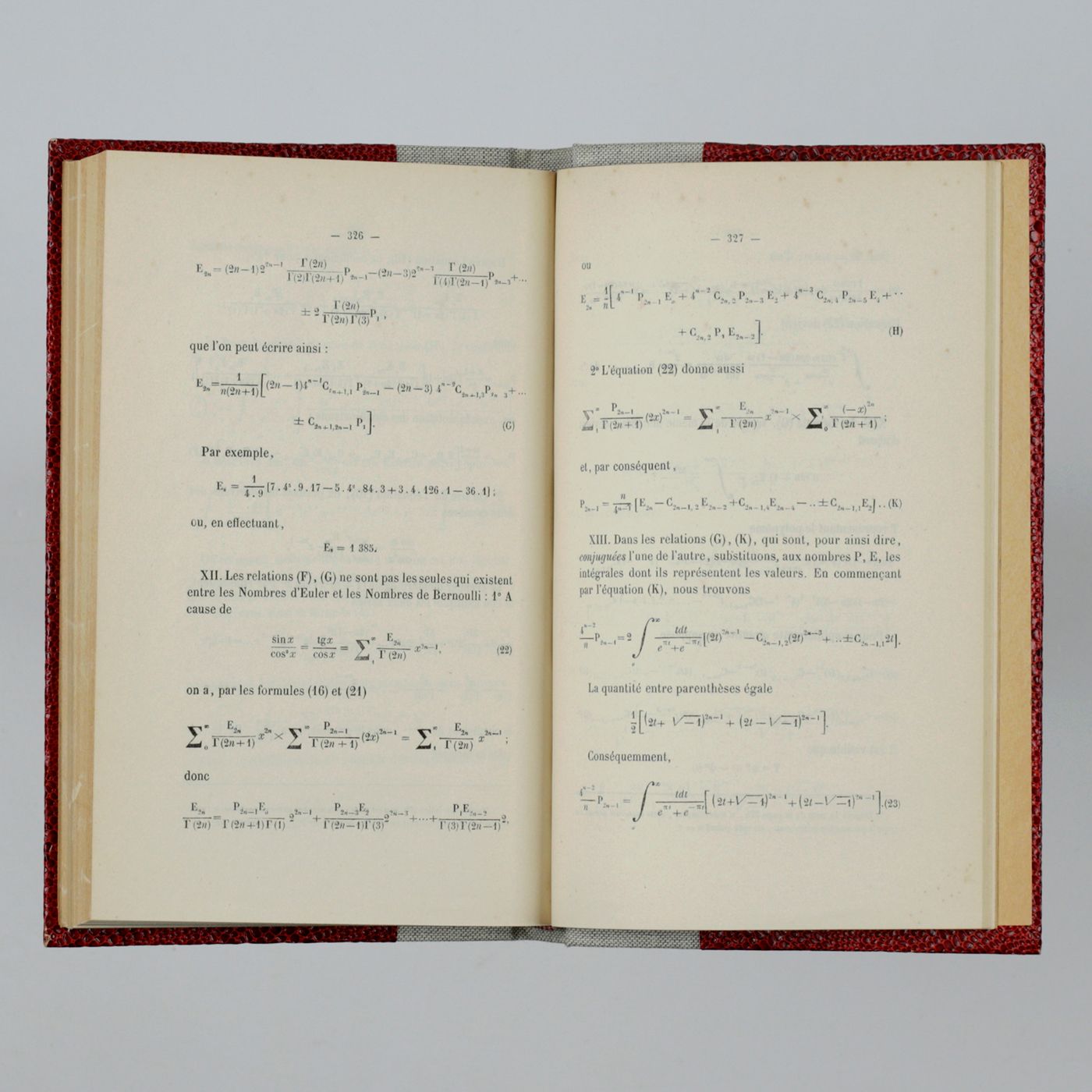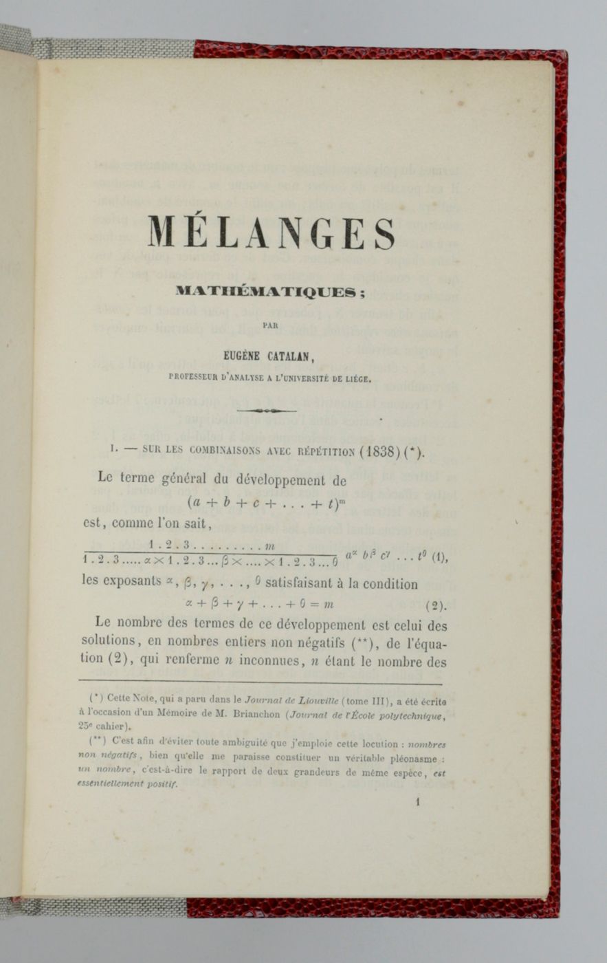 A rare work. It combines 79 mathematical works by the French-Belgian mathematician Eugène Charles Catalan (1814-1894) which were published earlier, but appear here, reviewed by the author and with new additions (all dated). Included are works on number theory, the calculus of numbers by Bernouilli, comments on a work by Poisson, a work on Fermat's theorem, and on works by Newton and by Euler. Catalan "...worked on continued fractions, descriptive geometry, number theory and combinatorics. His notable contributions included discovering a periodic minimal surface in the space R3; stating the famous Catalan's conjecture, which was eventually proved in 2002; and introducing the Catalan numbers to solve a combinatorial problem" (Wikipedia). Two papers (the one numbered 15, and a comment, from a letter, to the same) are by the French professor of mathematics, Charles Pierre Housel (1817-1874). Offprint from the Mémoires de la Société royale des Sciences de Liége, Deuxième Série, Volume 2. Blind stamp on title; short tear in the margin of pp. 45-48; otherwise very good, clean.