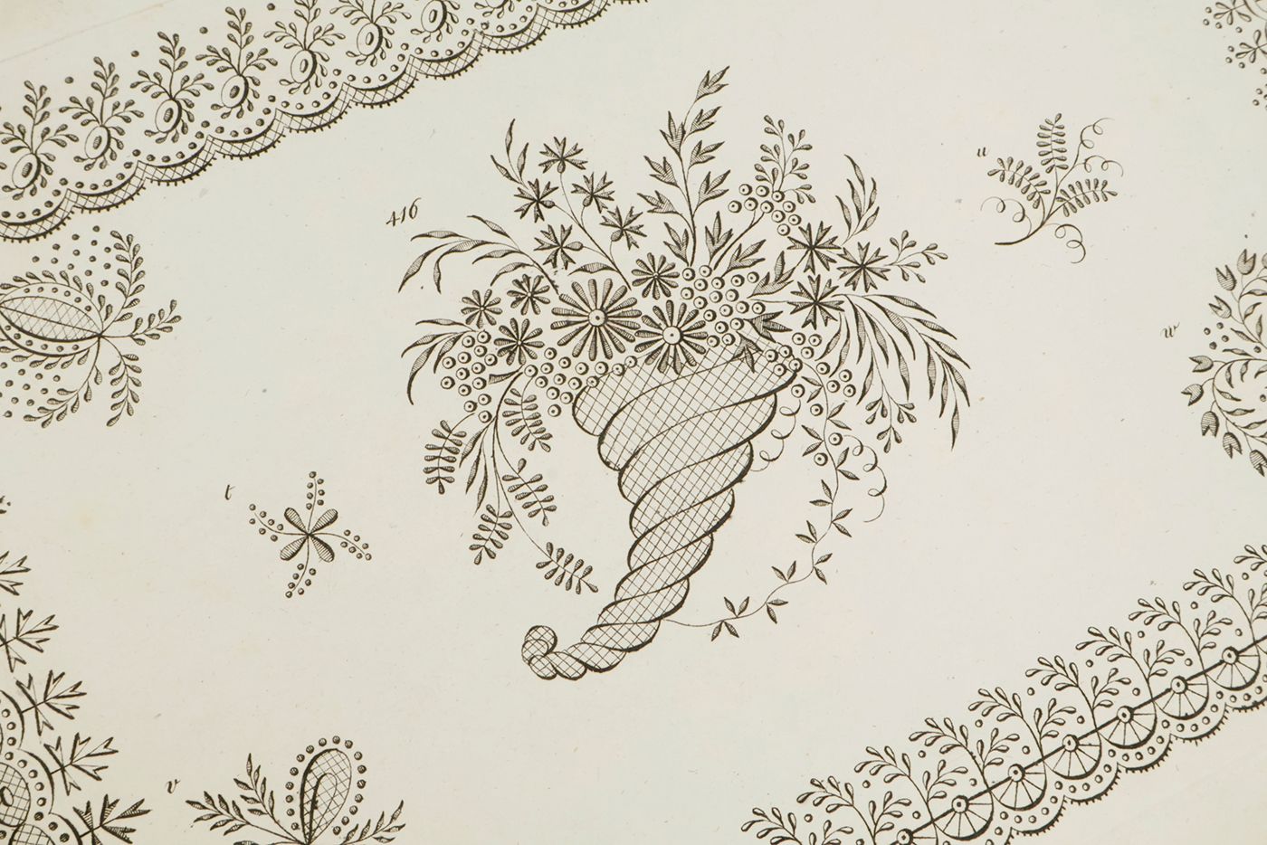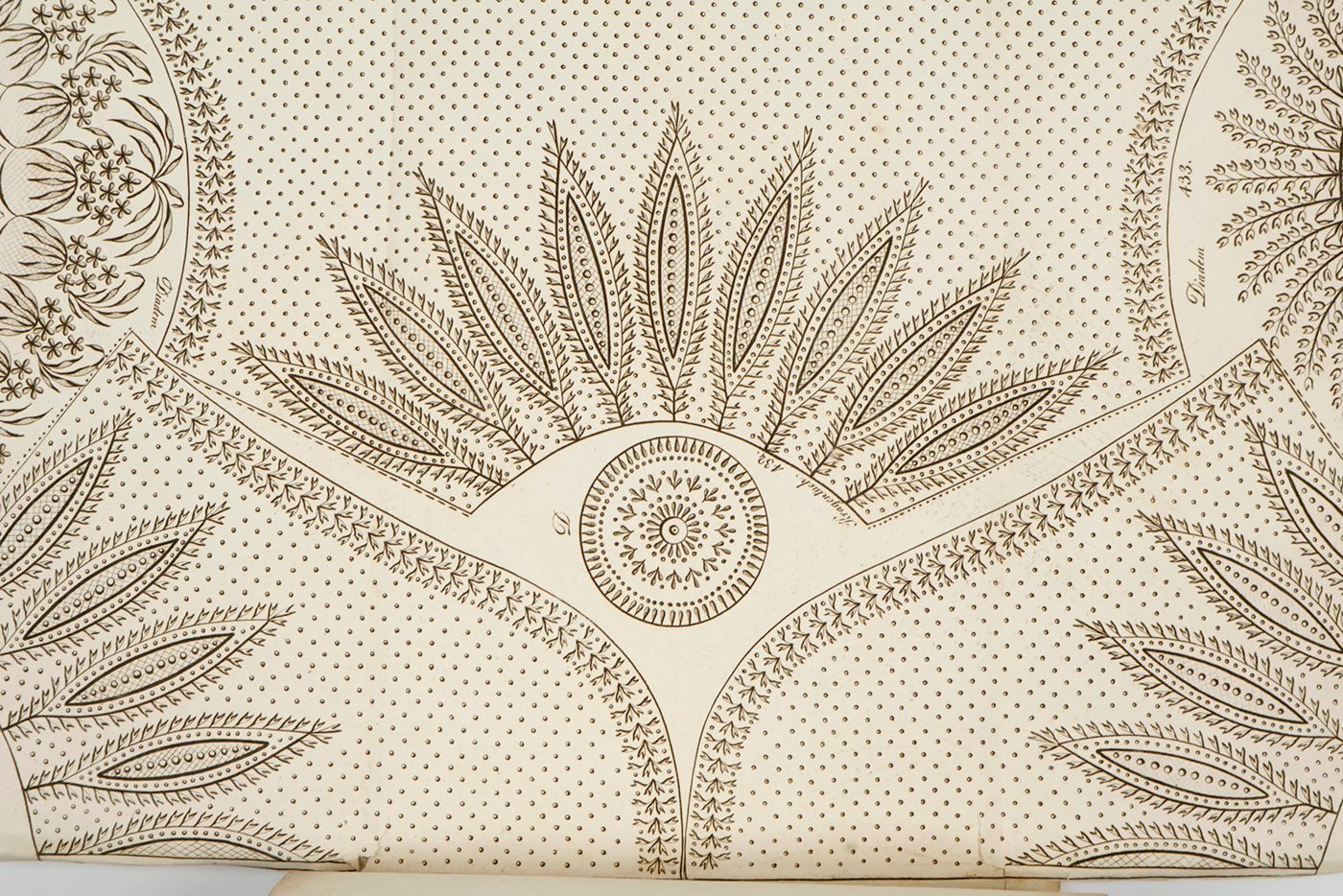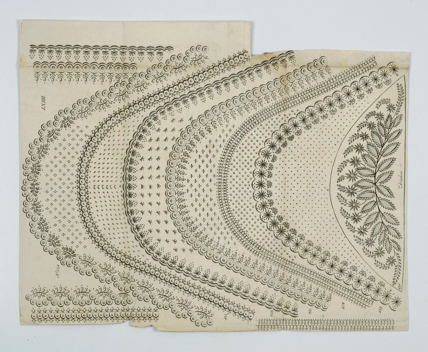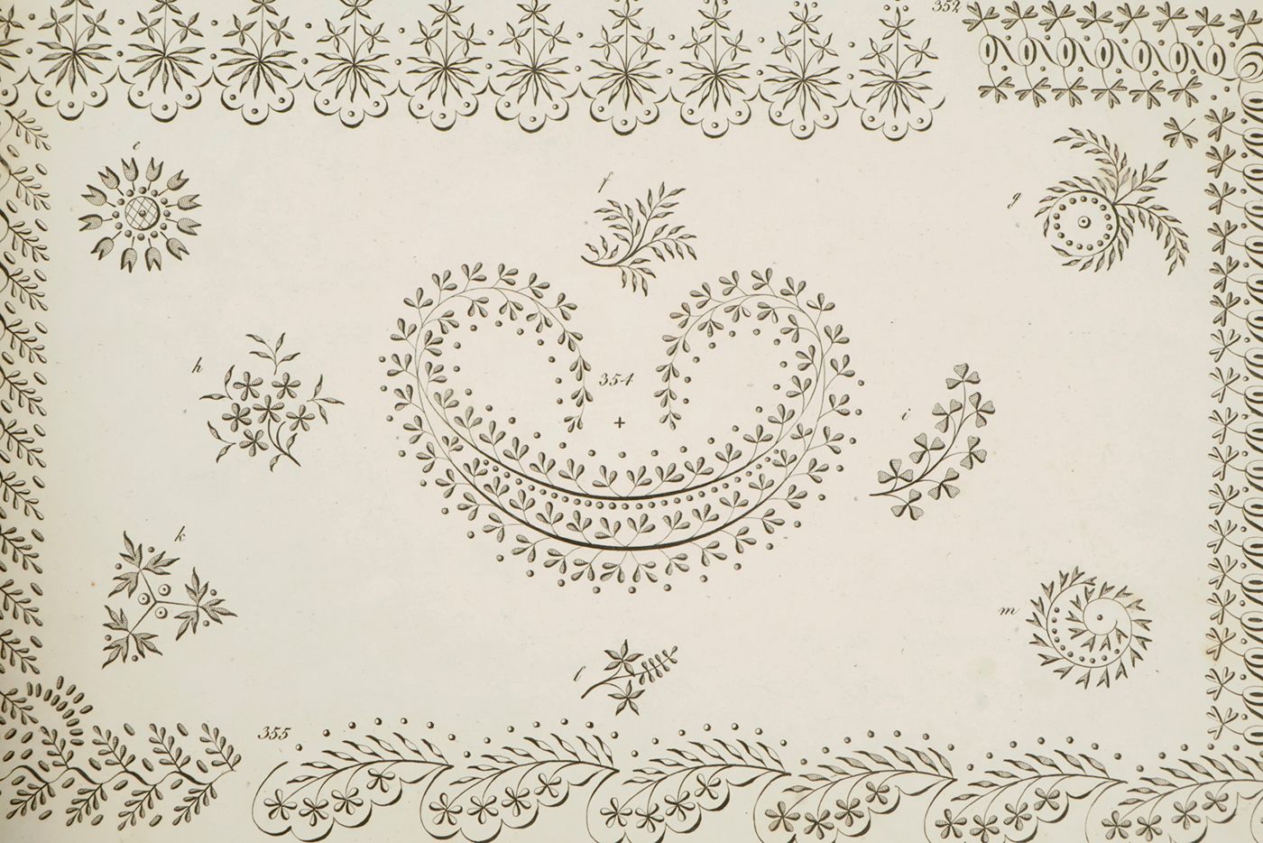 A part of the very rare first edition of a work titled "Patterns for embroidery in satin stitch and tambour". This work is known to be written and illustrated by Eleonore Sophie Elisabeth Hornbostel (d. 1859), but this first edition was published anonymously. In total, six parts were published. All are rare. The text leaf, dated October 1812, contains descriptions of all plates, except the first, which appears to be deliberately omitted. In 1818 a second edition was issued, with the numbering adjusted to LII-LXVIII. A third edition was published in 1828. Two folded leaves detached; wrappers somewhat worn and stained; wrapper edges a bit frayed, with a few, short tears. Otherwise very good and wonderful item with stunning plates.