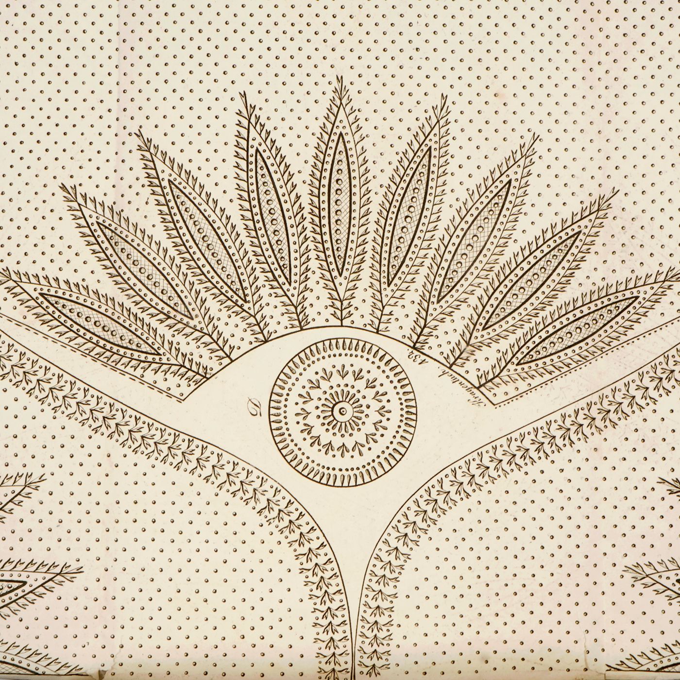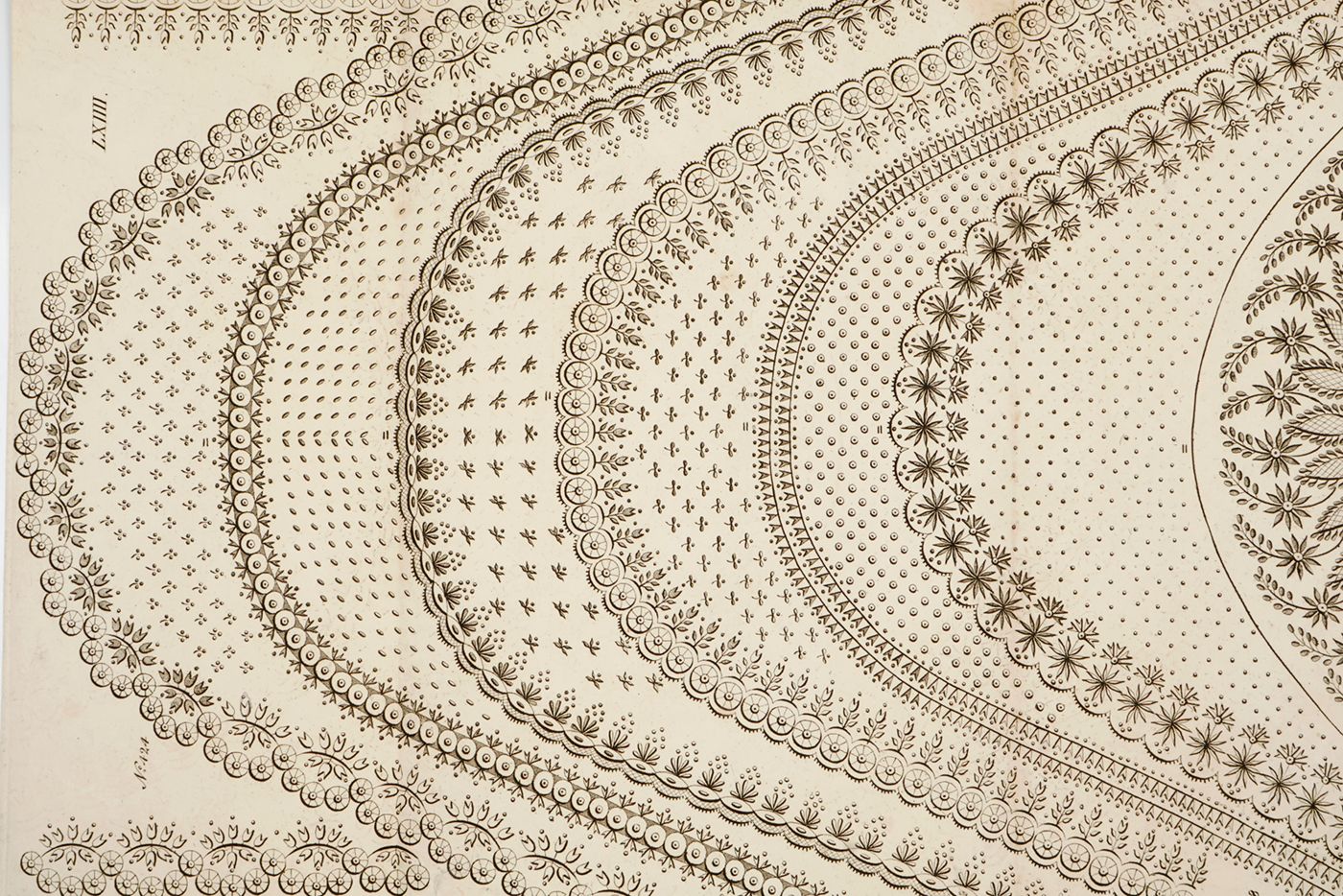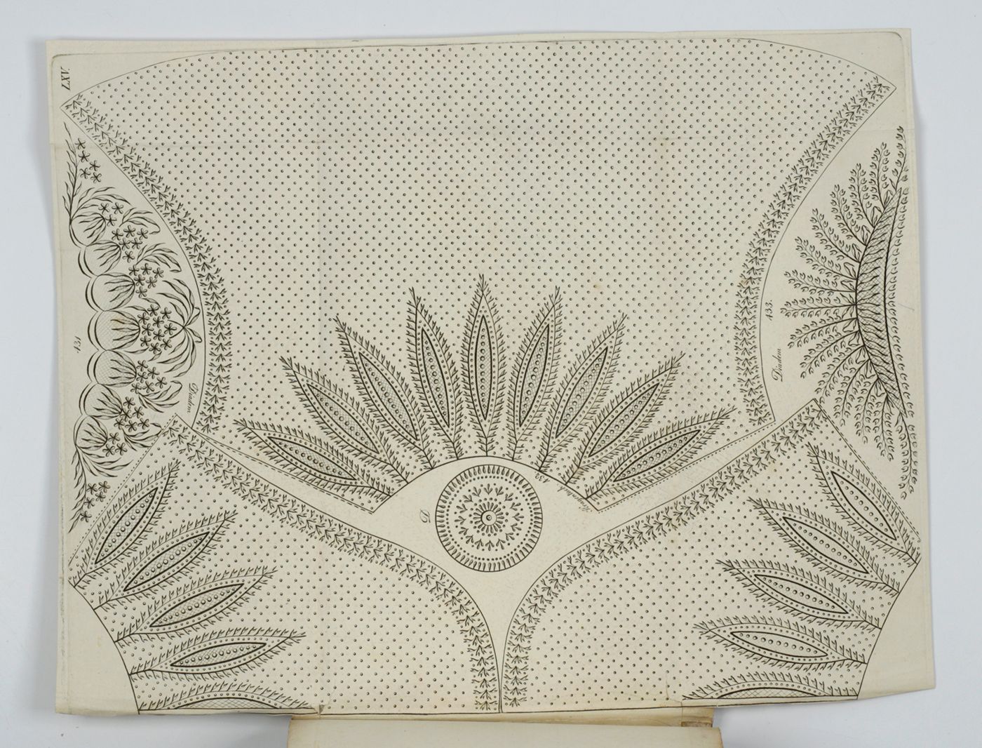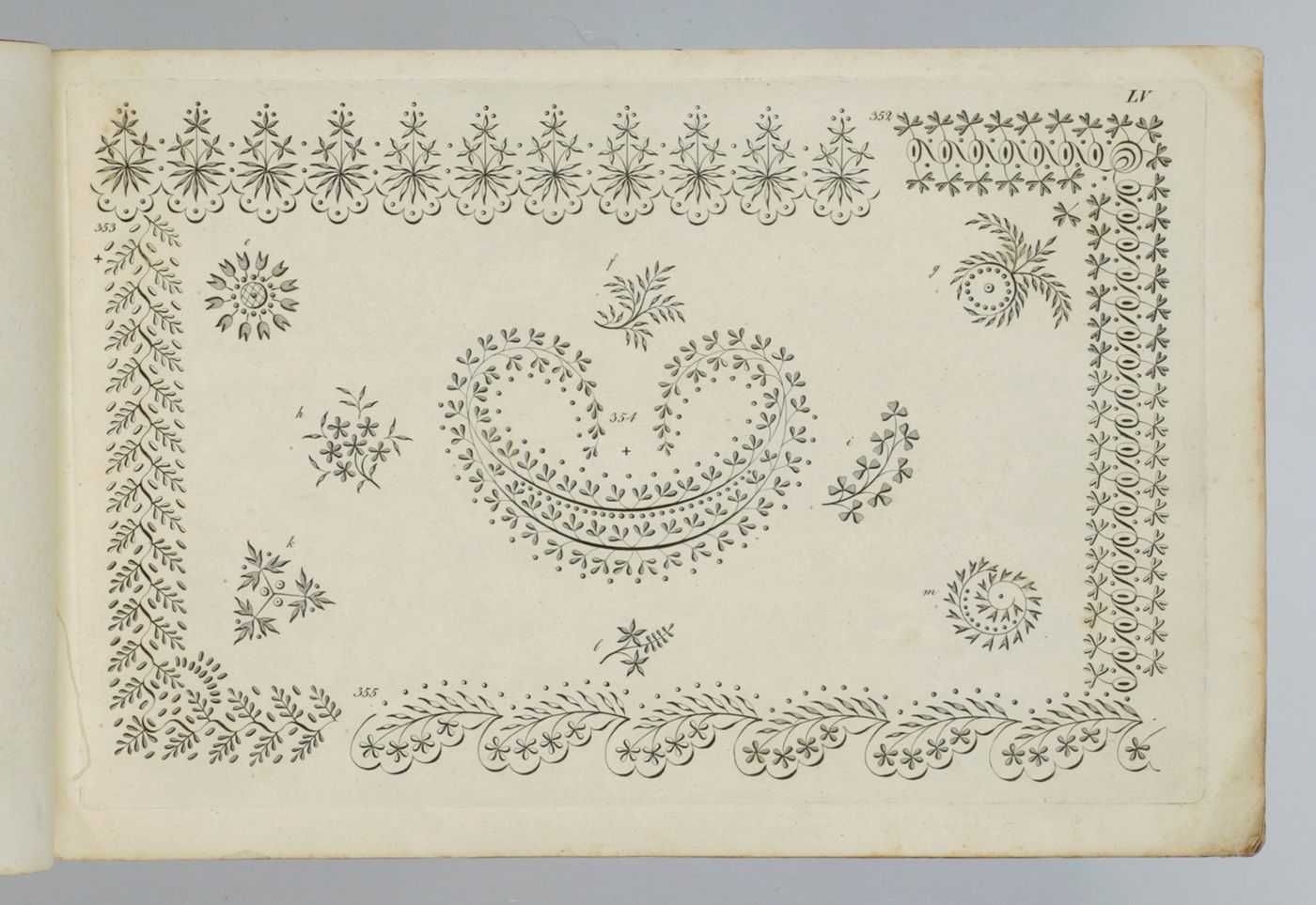 A part of the very rare first edition of a work titled "Patterns for embroidery in satin stitch and tambour". This work is known to be written and illustrated by Eleonore Sophie Elisabeth Hornbostel (d. 1859), but this first edition was published anonymously. In total, six parts were published. All are rare. The text leaf, dated October 1812, contains descriptions of all plates, except the first, which appears to be deliberately omitted. In 1818 a second edition was issued, with the numbering adjusted to LII-LXVIII. A third edition was published in 1828. Two folded leaves detached; wrappers somewhat worn and stained; wrapper edges a bit frayed, with a few, short tears. Otherwise very good and wonderful item with stunning plates.