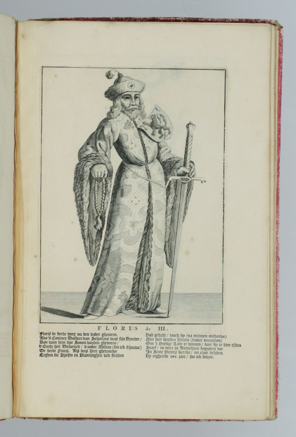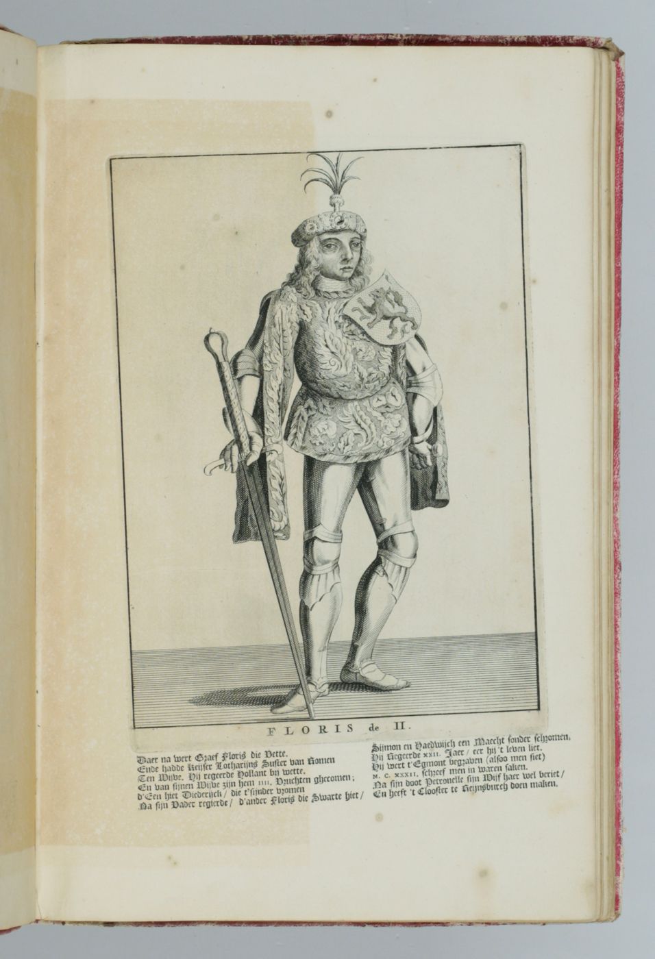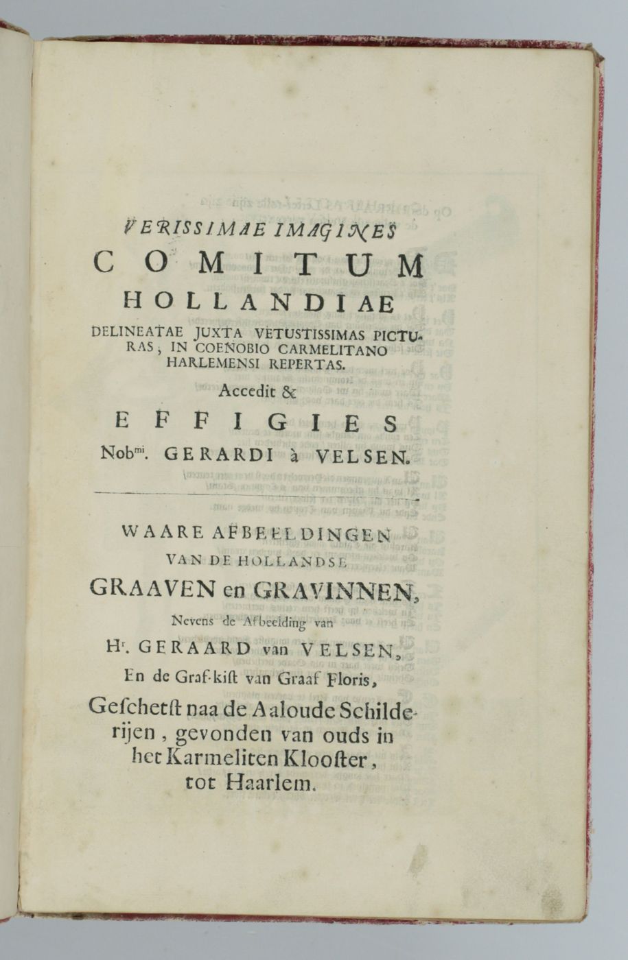 Verissimae Imagines Comitum Hollandiae delineatae juxta vetustissimas picturas, in coenobio Carmelitano Harlemensi repertas. Accedit & Effigies Nob[ili]mi. Gerardi à Velsen. Waare Afbeeldingen van de Hollandse Graaven en Gravinnen, nevens de Afbeelding van Hr. Geraard van Velsen, en de Graf-kist van Graaf Floris, geschetst naa de Aaloude Schilderijen, gevonden van ouds in het Karmeliten Klooster, tot Haarlem.