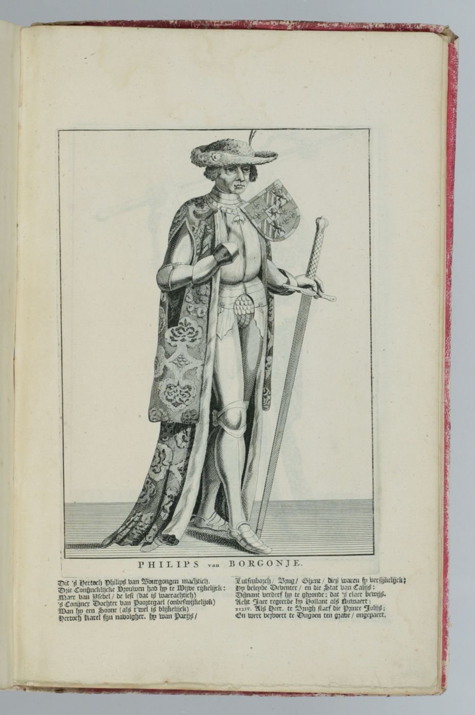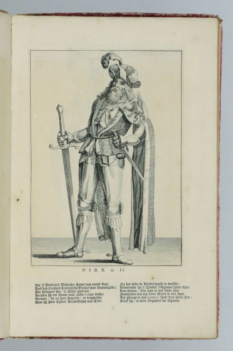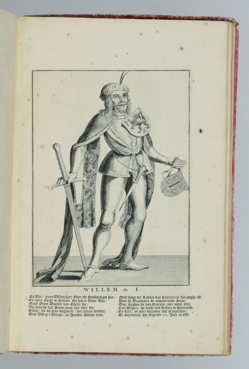A very rare, separately published plate edition (presumably a pirate edition, given the absence of a publisher's name on the title) of a book titled Hollandse Jaar-boeken of Rijm-Kronijk van Melis Stoke. Behelsende De Geschiedenissen des Lands, onder de Princen van het eerste Huis, tot den Jare 1305. Met de afbeeldingen van alle de Hollandse graven, geschetst naar de Aaloude Schilderyen der Karmeliten te Haarlem. Nevens verscheide egte bylagen, betreffende de ware toestand der geschillen, tussen Graaf Floris de V, en de Hollandse edelen. Mitsgaders de beeldenisse van Heer Gerard van Velsen; en andre oude frayigheden, noit te voren in't ligt gebragt. Alles met noodige uitleggingen opgehelderd door Cornelis van Alkemade. In that edition, the plate index is wrong in including several plates that were never published. The author, Cornelis van Alkemade (1654-1737) was a Dutch lawyer, historian, and writer. For the introduction he took a poem by the 13th century Dutch poet and clerk, Melis Stoke (ca. 1235-ca. 1305). Provenance: the Mayor of the Dutch town of Bennebroek, David Thomassen à Thuessink van der Hoop van Slochteren (1910-1991) (loosely inserted letter, dated 13 May 1957, with an answer to his request to the Haarlem municipality secretary Henri Emile "Hans" Phaff (1914-2002), regarding this work). Added: a large, folded lose sheet of paper with, in an old hand, a genealogy of Dutch counts between 922 and 1581, including near all persons depicted in this work. One plate (ingewands kiste) smaller, apparently as published. Exceedingly rare. One copy in the library of the Nederlands Carmilitaans Instituut in Boxmeer. Google Books shows a copy lacking the double-sized plate with double portrait of Maria van Borgonje and Maximiliaan van Oostenrijk, and the symbolic plate of De Doot (Death). Boards and spine rubbed, especially at edges; one plate with a chip in the lower outer margin, well outside the printed surface; a few plates and versos toned due to the insertion of lower grade lose paper sheets; some minimal spotting, otherwise very good, complete.