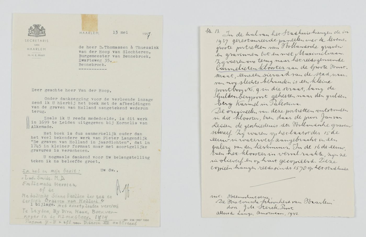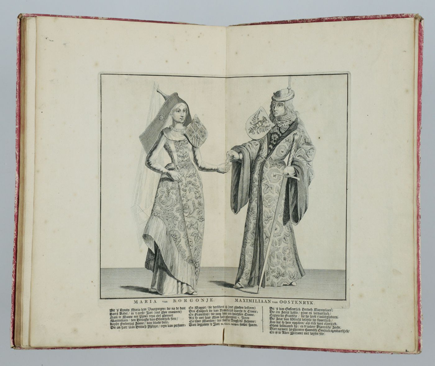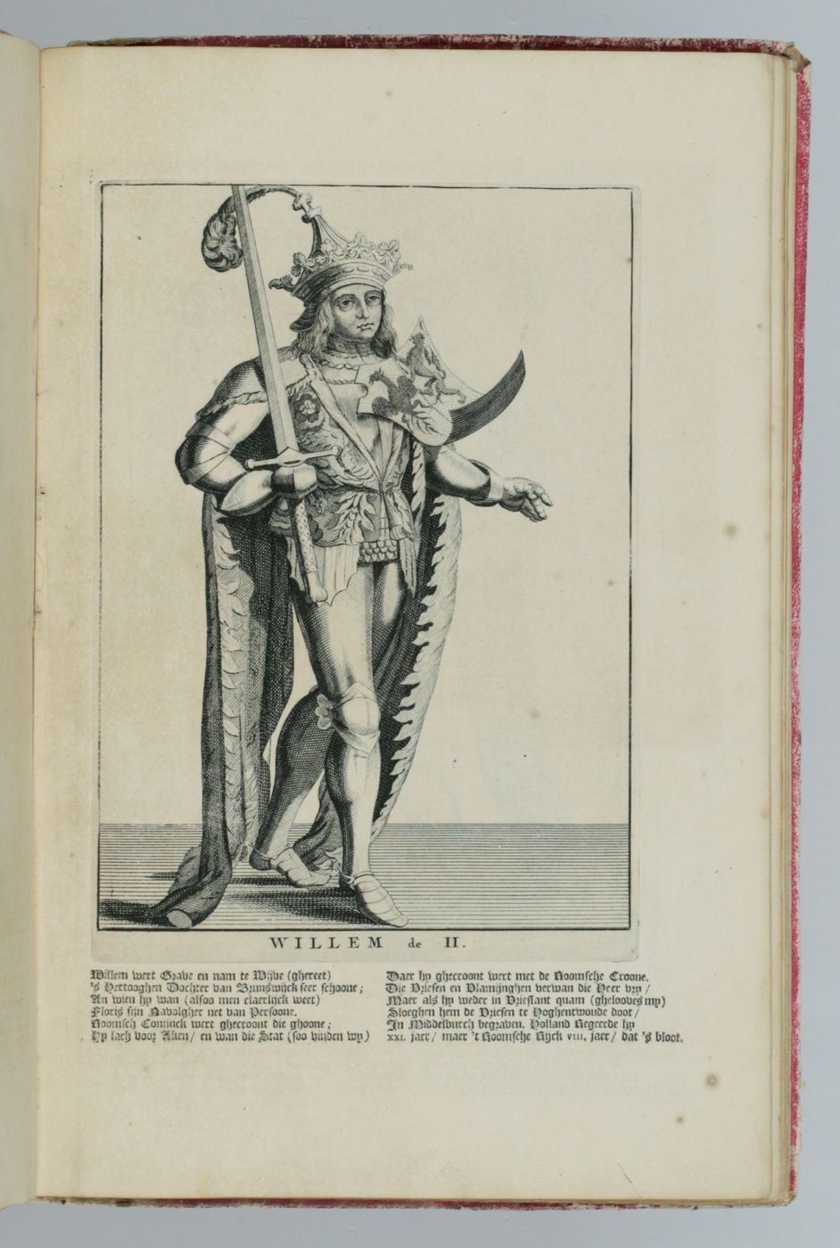 A very rare, separately published plate edition (presumably a pirate edition, given the absence of a publisher's name on the title) of a book titled Hollandse Jaar-boeken of Rijm-Kronijk van Melis Stoke. Behelsende De Geschiedenissen des Lands, onder de Princen van het eerste Huis, tot den Jare 1305. Met de afbeeldingen van alle de Hollandse graven, geschetst naar de Aaloude Schilderyen der Karmeliten te Haarlem. Nevens verscheide egte bylagen, betreffende de ware toestand der geschillen, tussen Graaf Floris de V, en de Hollandse edelen. Mitsgaders de beeldenisse van Heer Gerard van Velsen; en andre oude frayigheden, noit te voren in't ligt gebragt. Alles met noodige uitleggingen opgehelderd door Cornelis van Alkemade. In that edition, the plate index is wrong in including several plates that were never published. The author, Cornelis van Alkemade (1654-1737) was a Dutch lawyer, historian, and writer. For the introduction he took a poem by the 13th century Dutch poet and clerk, Melis Stoke (ca. 1235-ca. 1305). Provenance: the Mayor of the Dutch town of Bennebroek, David Thomassen à Thuessink van der Hoop van Slochteren (1910-1991) (loosely inserted letter, dated 13 May 1957, with an answer to his request to the Haarlem municipality secretary Henri Emile "Hans" Phaff (1914-2002), regarding this work). Added: a large, folded lose sheet of paper with, in an old hand, a genealogy of Dutch counts between 922 and 1581, including near all persons depicted in this work. One plate (ingewands kiste) smaller, apparently as published. Exceedingly rare. One copy in the library of the Nederlands Carmilitaans Instituut in Boxmeer. Google Books shows a copy lacking the double-sized plate with double portrait of Maria van Borgonje and Maximiliaan van Oostenrijk, and the symbolic plate of De Doot (Death). Boards and spine rubbed, especially at edges; one plate with a chip in the lower outer margin, well outside the printed surface; a few plates and versos toned due to the insertion of lower grade lose paper sheets; some minimal spotting, otherwise very good, complete.