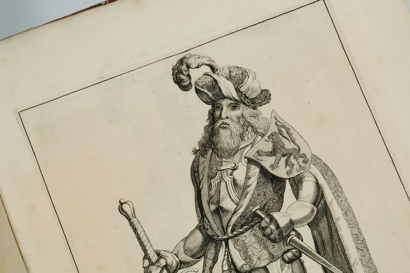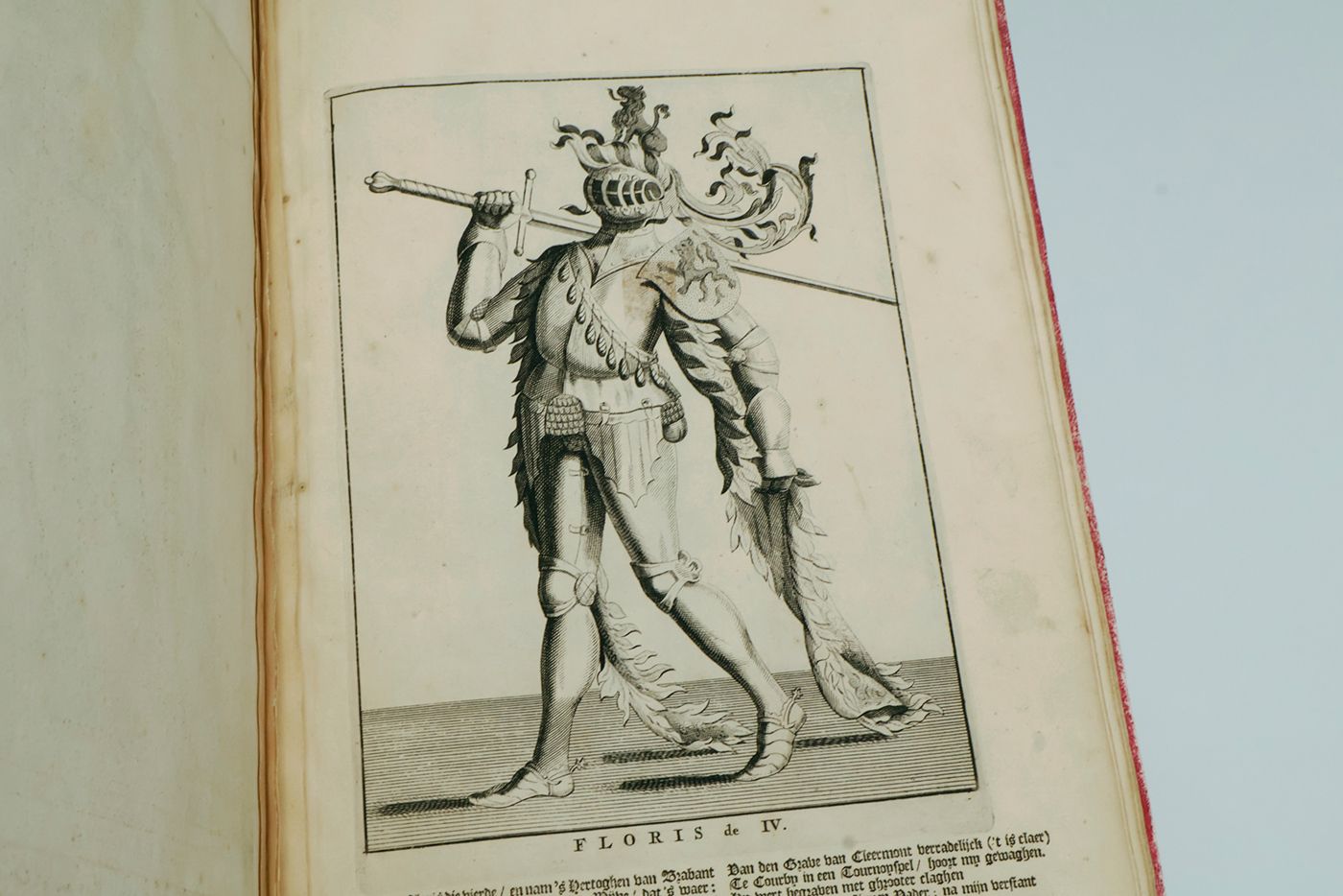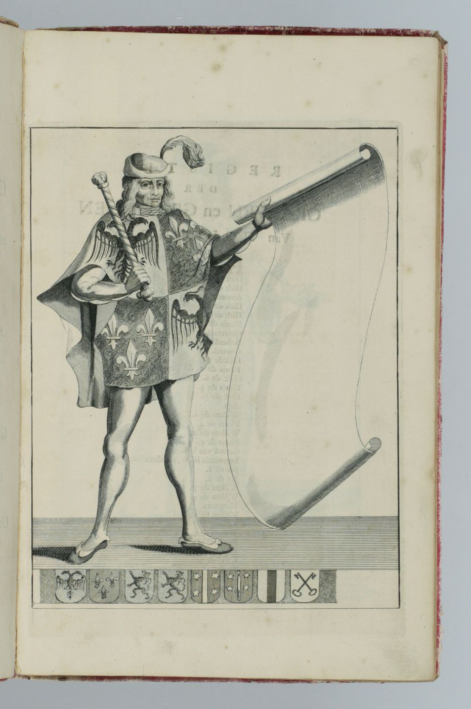 [Leiden, Johannes de Vivie and Izaak Severinus, 1699]. Folio (33.9 x 22.0 cm). Letterpress title, Herault's poem, frontispiece engraving of a herault with index on verso; thirty-four engraved plates (one double-sized). Contemporary limp red-died and blind-stamped vellum, with large floral vignettes on front and rear board.