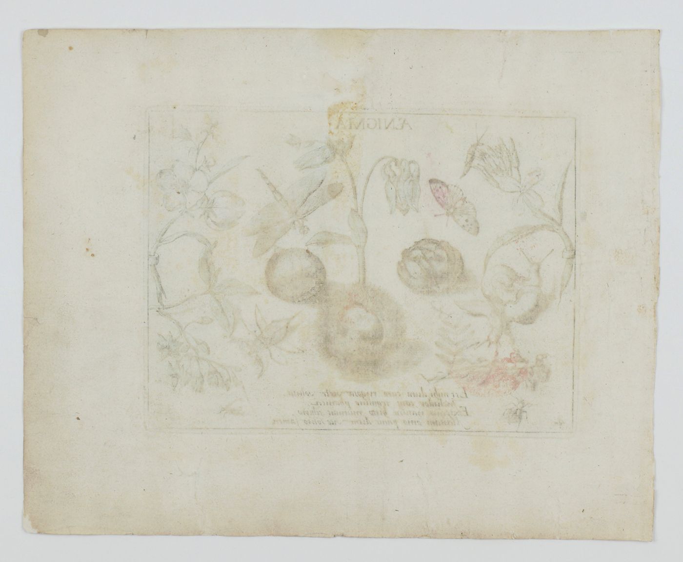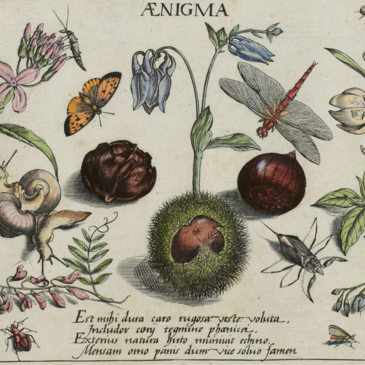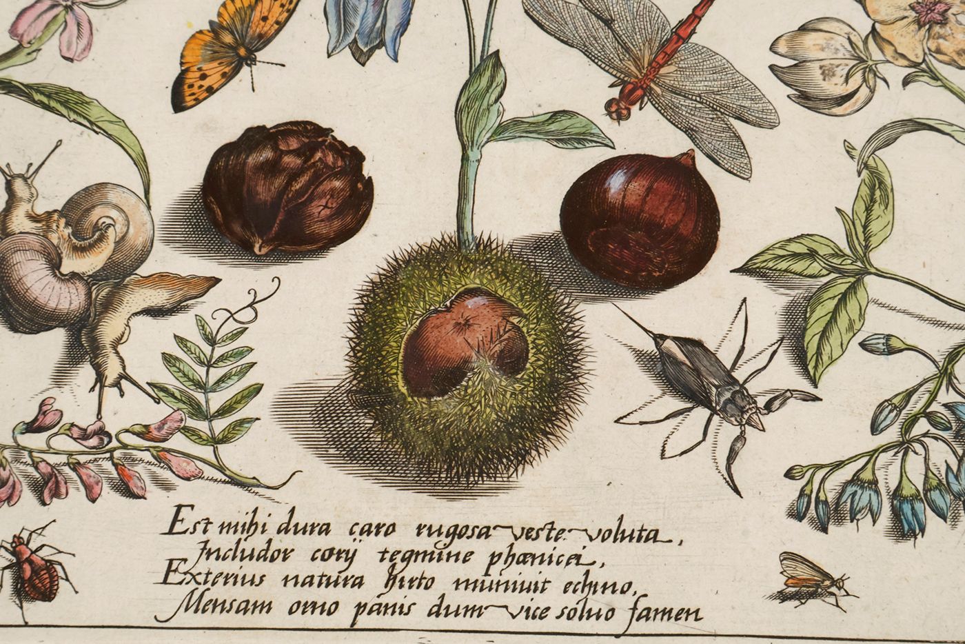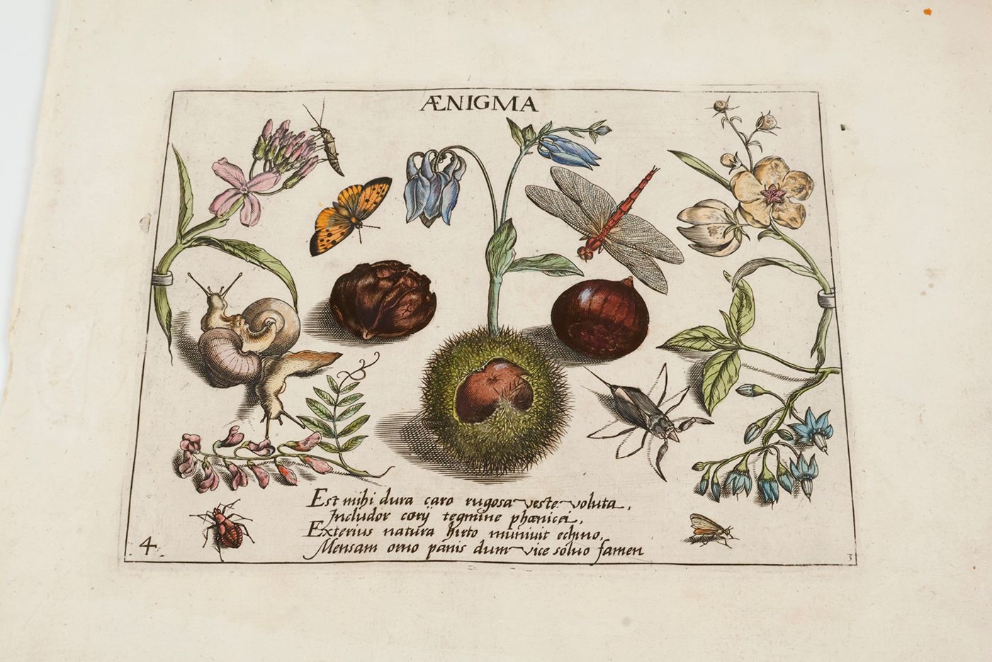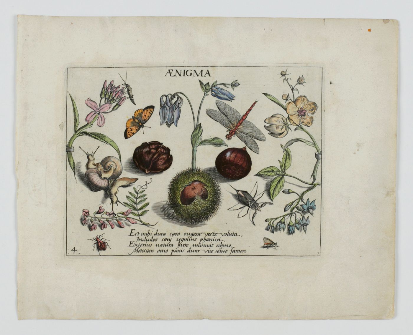 A fine plate of this very rare work which comprises four parts with 48 plates in all. All plates are very uncommon, if not rare. This plate illustrates chestnuts, a dragonfly, a butterfly, two snails, several bugs, and flowers including blue bells and roses. The plate is titled "Aenigma", and has a Latin poem below. This work is generally renowned for its finely executed entomological illustrations. Joris (Georgius) Hoefnagel (1542-1601) produced the Archetypa during his 'Frankfurt period' which was between 1591 and 1594. "The Archetypa were engraved as a reproduction of a collection of models and served in turn as a pattern book for other artists" (quote from Archetypa Studiaque Patris... Nature, Poetry and Science in Art around 1600, by Thea Vignau-Wilberg, Staatliche Graphische Sammlung München, 1994). This work was published uncoloured. The colouring is therefore always later and may vary in quality. A weak, vertical crease and some minor creasing; very professional old paper repairs to the upper en lower margin, hardly visible; otherwise a fine, strong, unmarked, accurately coloured print. Hollstein IX, 17-64; Horn-Schenkling, 10472; Nissen ZBI, 1954.
