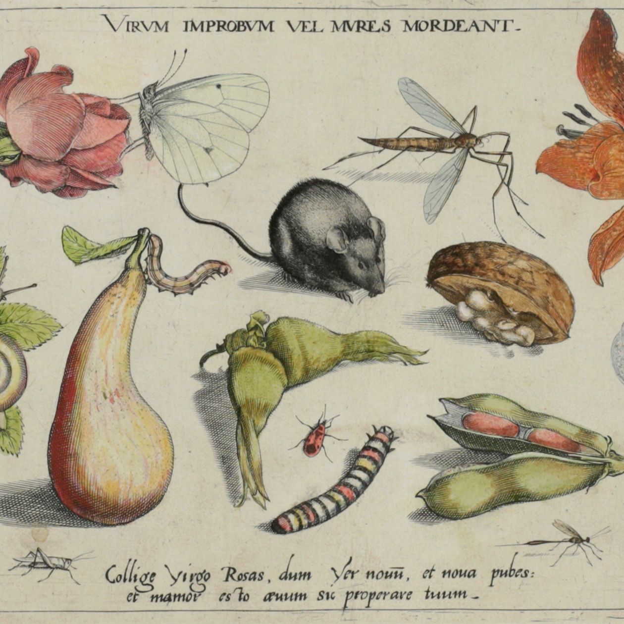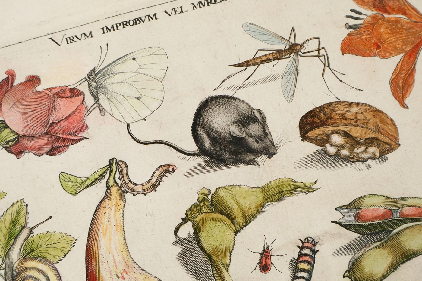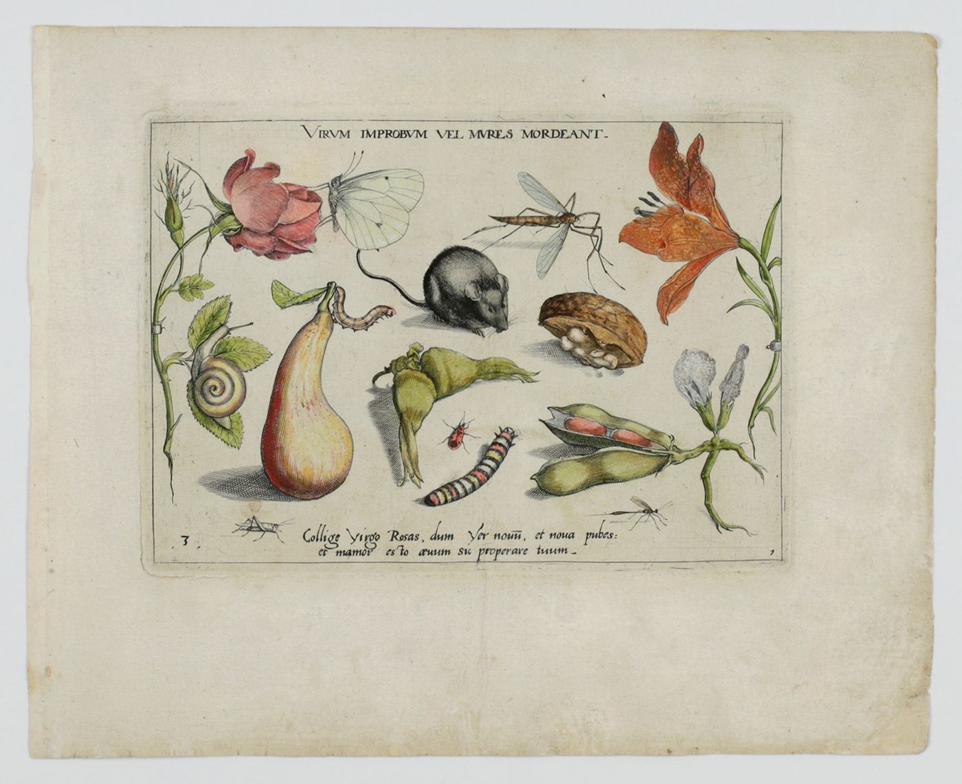 A fine plate of this very rare work which comprises four parts with 48 plates in all. All plates are very uncommon, if not rare. This plate illustrates a mouse, a white butterfly, a crane fly, a colourful caterpillar, a snail, a walnut, a pear, and several flowers, including a lily and a rose. The plate is titled in Latin, "even mice can bite a wicked man". This work is generally renowned for its finely executed entomological illustrations. Joris (Georgius) Hoefnagel (1542-1601) produced the Archetypa during his 'Frankfurt period' which was between 1591 and 1594. "The Archetypa were engraved as a reproduction of a collection of models and served in turn as a pattern book for other artists" (quote from Archetypa Studiaque Patris... Nature, Poetry and Science in Art around 1600, by Thea Vignau-Wilberg, Staatliche Graphische Sammlung München, 1994). This work was published uncoloured. The colouring is therefore always later and may vary in quality. A weak, vertical crease and some minor creasing; very professional old paper repairs to the lower margin, hardly visible, otherwise a fine, strong, unmarked, accurately coloured print. Hollstein IX, 17-64; Horn-Schenkling, 10472; Nissen ZBI, 1954.