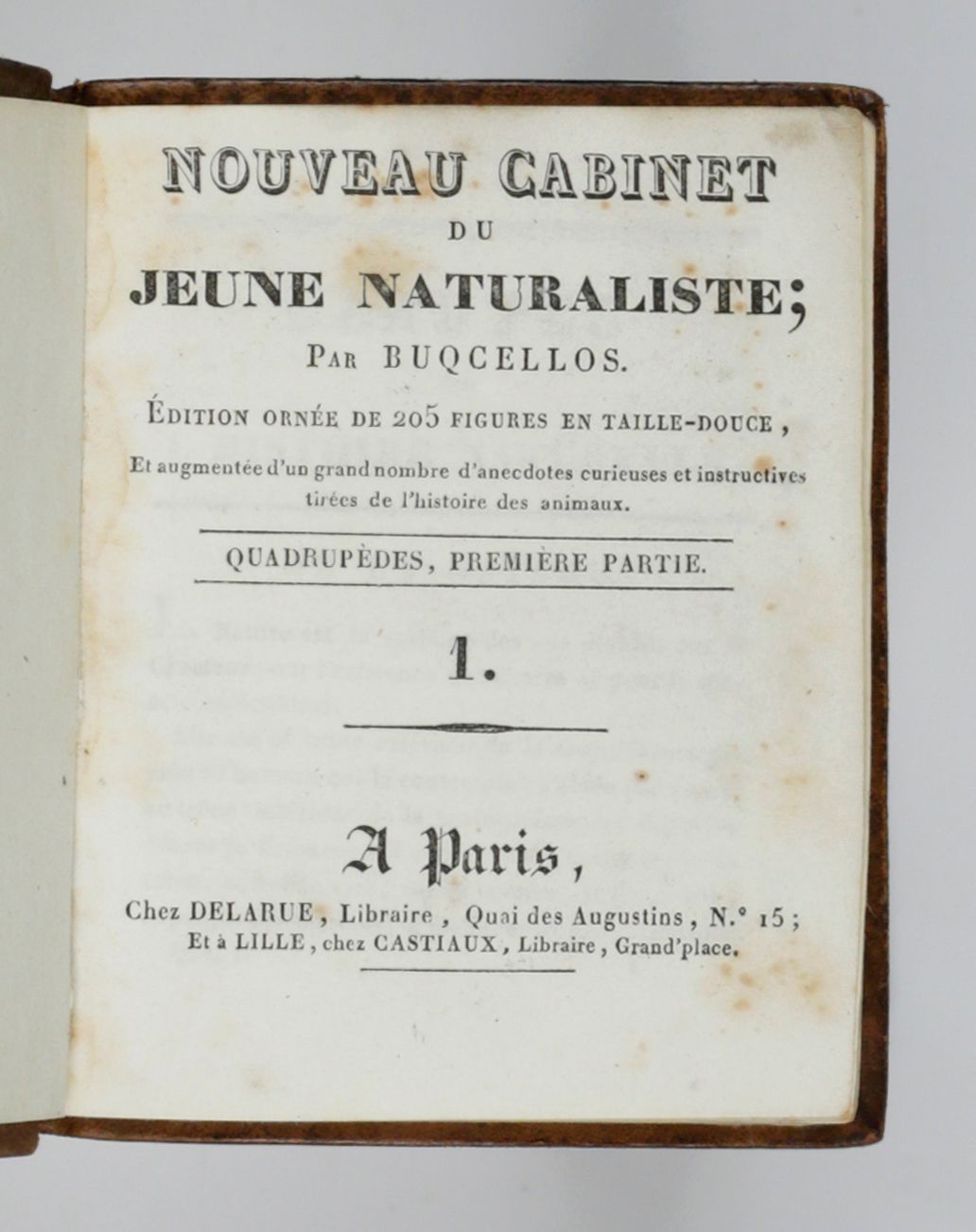 Nouveau cabinet du jeune naturaliste; par Buqcellos. Édition ornée de 205 figures en taille-douce, et augmentée d'un grand nombre d'anecdotes curieuses et instructives tirées de l'histoire des animaux. 1. Quadrupèdes, première partie. 2. Quadrupèdes, deuxième partie. 3. Oiseaux, première partie 4. Oiseaux, deuxième partie. 5. Poissons, cétacés et crustacées. 6. Reptiles, insects, vers, etc. [Complete].