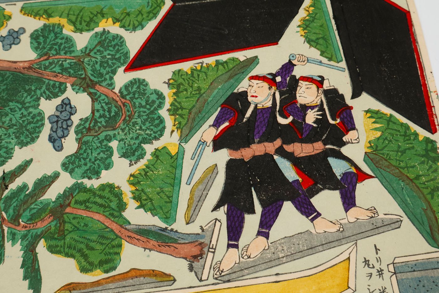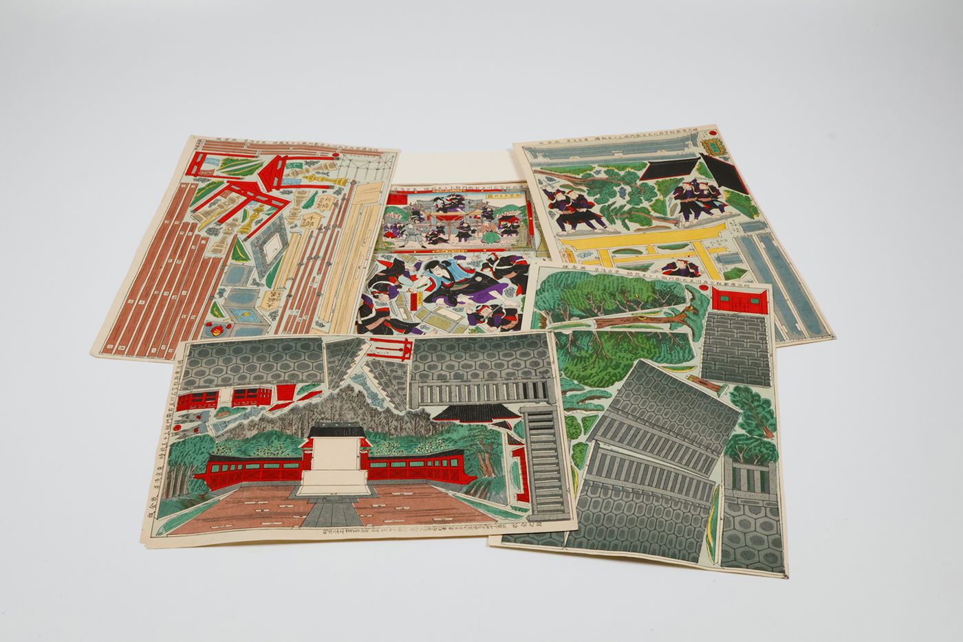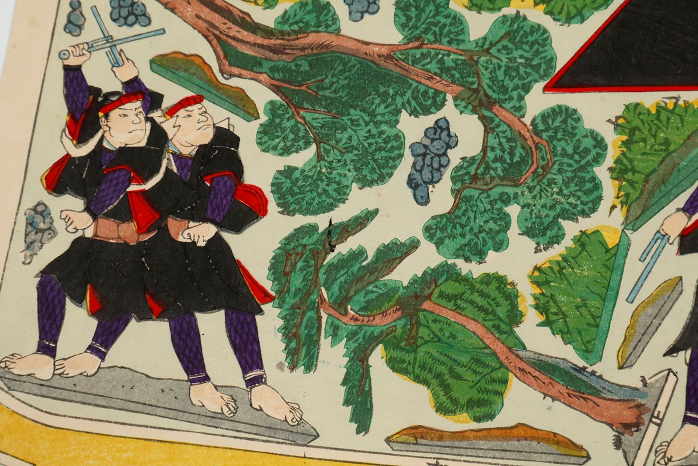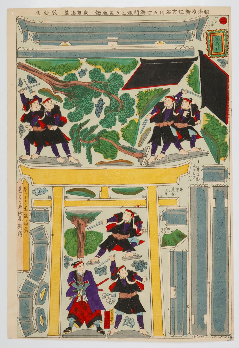 Includes cut-out figures illustrating the capture of Ishikawa Goemon at the Fuji no Moro shrine. Rare intact sheets. The first presenting an image of the assembled piece. Goemon (1558-1594) was the leader of a group of bandits during the Azuchi-Momoyama period in Japan. Over time, and especially during the Edo period (1603-1867), his life and deeds became a centre of attention, and he became known as a legendary Japanese "Robin Hood" who stole gold and other valuables to give to the poor. He and his son were boiled alive in public after their failed assassination attempt on the Sengoku period warlord Toyotomi Hideyoshi. His legend lives on in contemporary Japanese popular culture, often giving him greatly exaggerated ninja skills. He is the subject of many classic kabuki plays, and a subject of several pre-WWII Japanese films. There are generally two ways in which Goemon has been most often portrayed in the modern popular culture: either a young, slender ninja, or a powerfully-built, hulking Japanese bandit (see Wikipedia). Small hole in top left margins (in one leaf a small chip), minimal creasing to a few corners, otherwise fine.