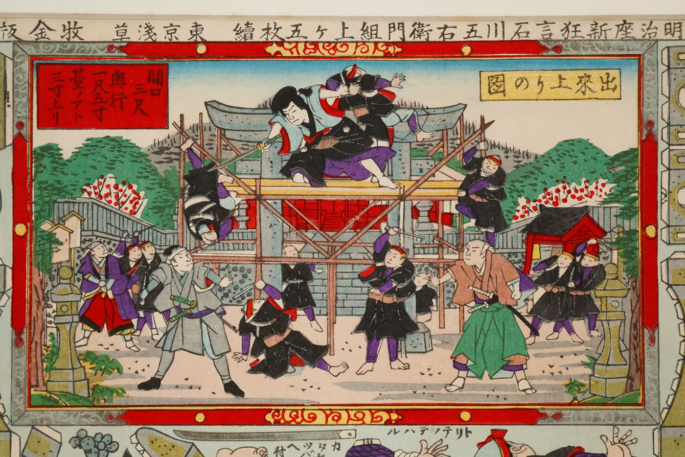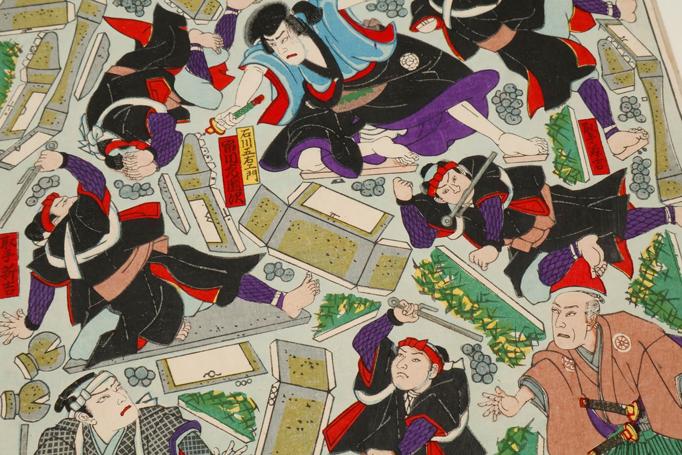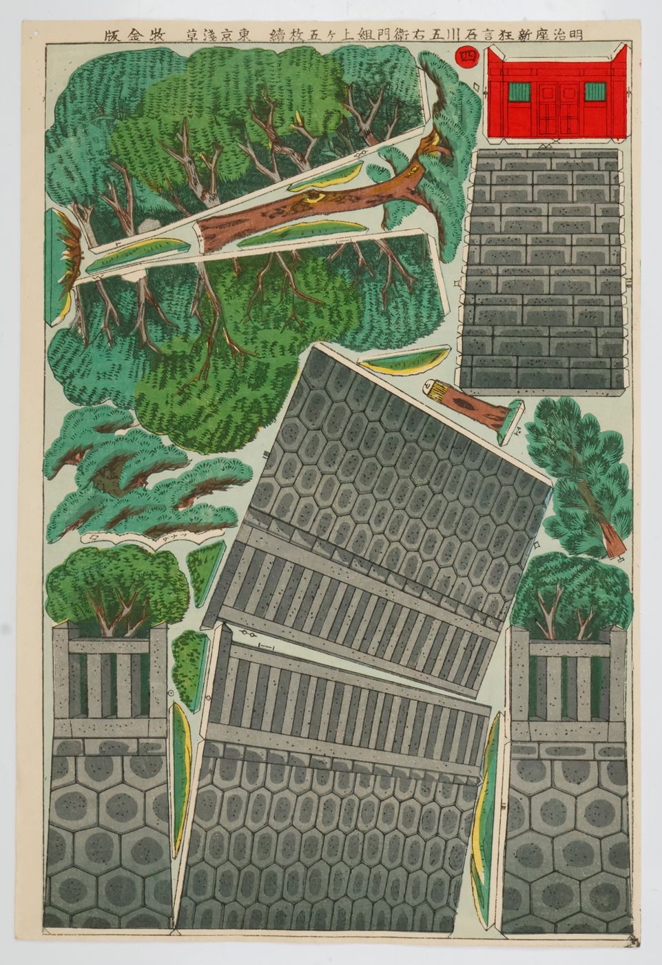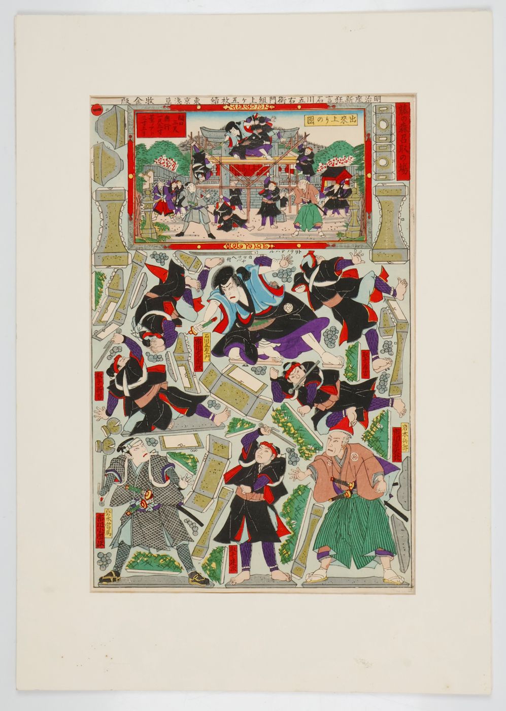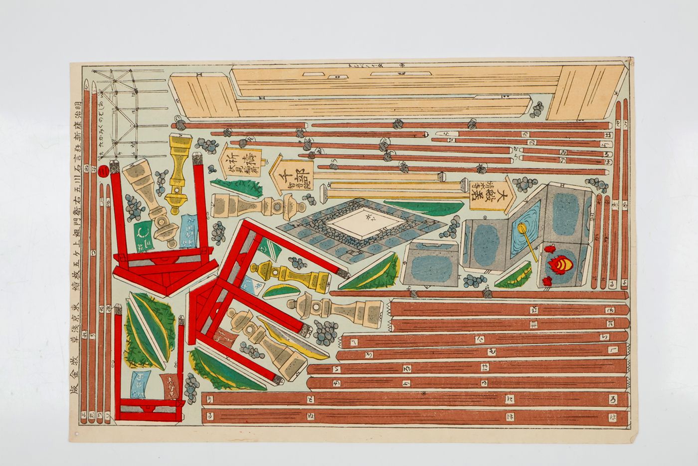 Includes cut-out figures illustrating the capture of Ishikawa Goemon at the Fuji no Moro shrine. Rare intact sheets. The first presenting an image of the assembled piece. Goemon (1558-1594) was the leader of a group of bandits during the Azuchi-Momoyama period in Japan. Over time, and especially during the Edo period (1603-1867), his life and deeds became a centre of attention, and he became known as a legendary Japanese "Robin Hood" who stole gold and other valuables to give to the poor. He and his son were boiled alive in public after their failed assassination attempt on the Sengoku period warlord Toyotomi Hideyoshi. His legend lives on in contemporary Japanese popular culture, often giving him greatly exaggerated ninja skills. He is the subject of many classic kabuki plays, and a subject of several pre-WWII Japanese films. There are generally two ways in which Goemon has been most often portrayed in the modern popular culture: either a young, slender ninja, or a powerfully-built, hulking Japanese bandit (see Wikipedia). Small hole in top left margins (in one leaf a small chip), minimal creasing to a few corners, otherwise fine.