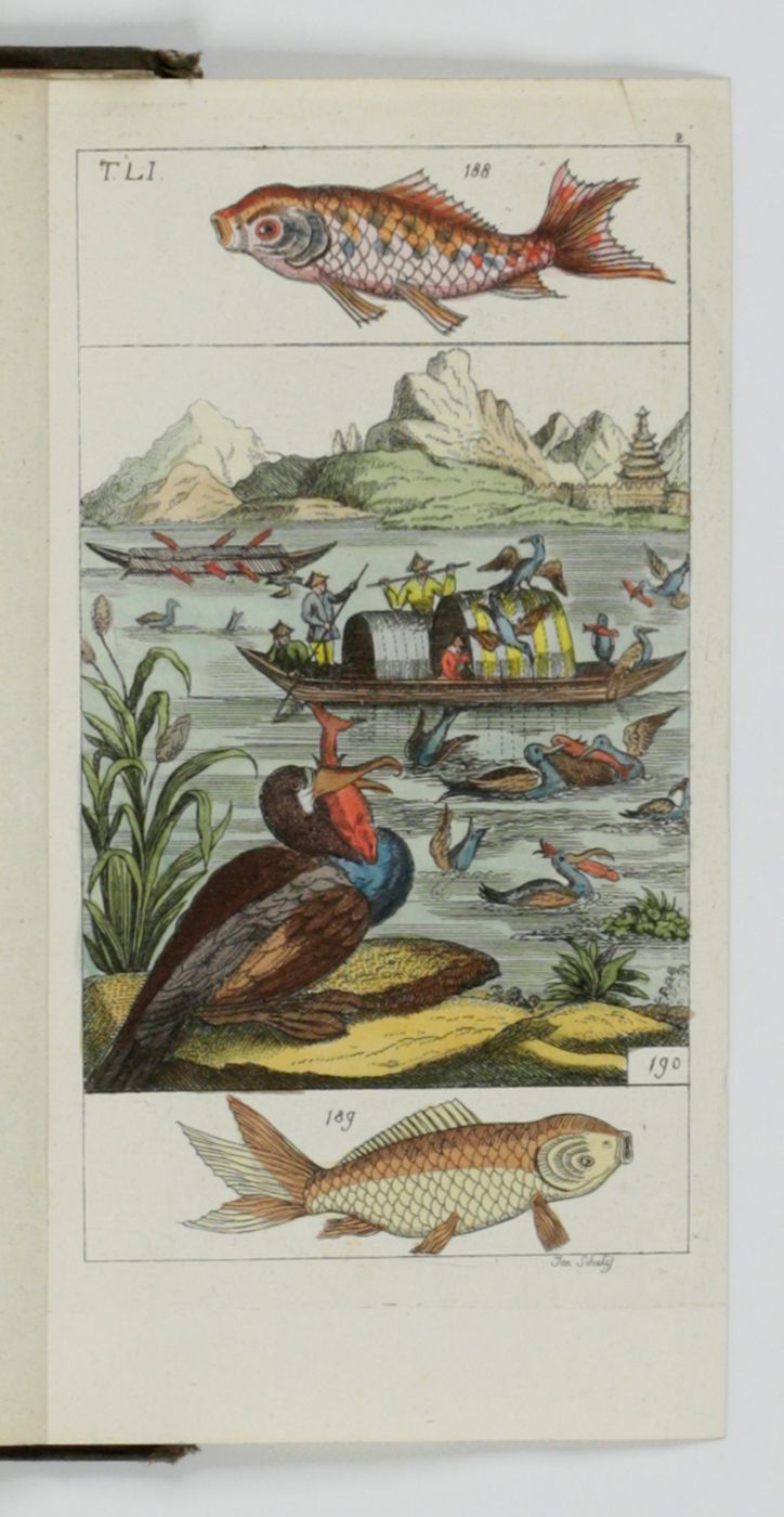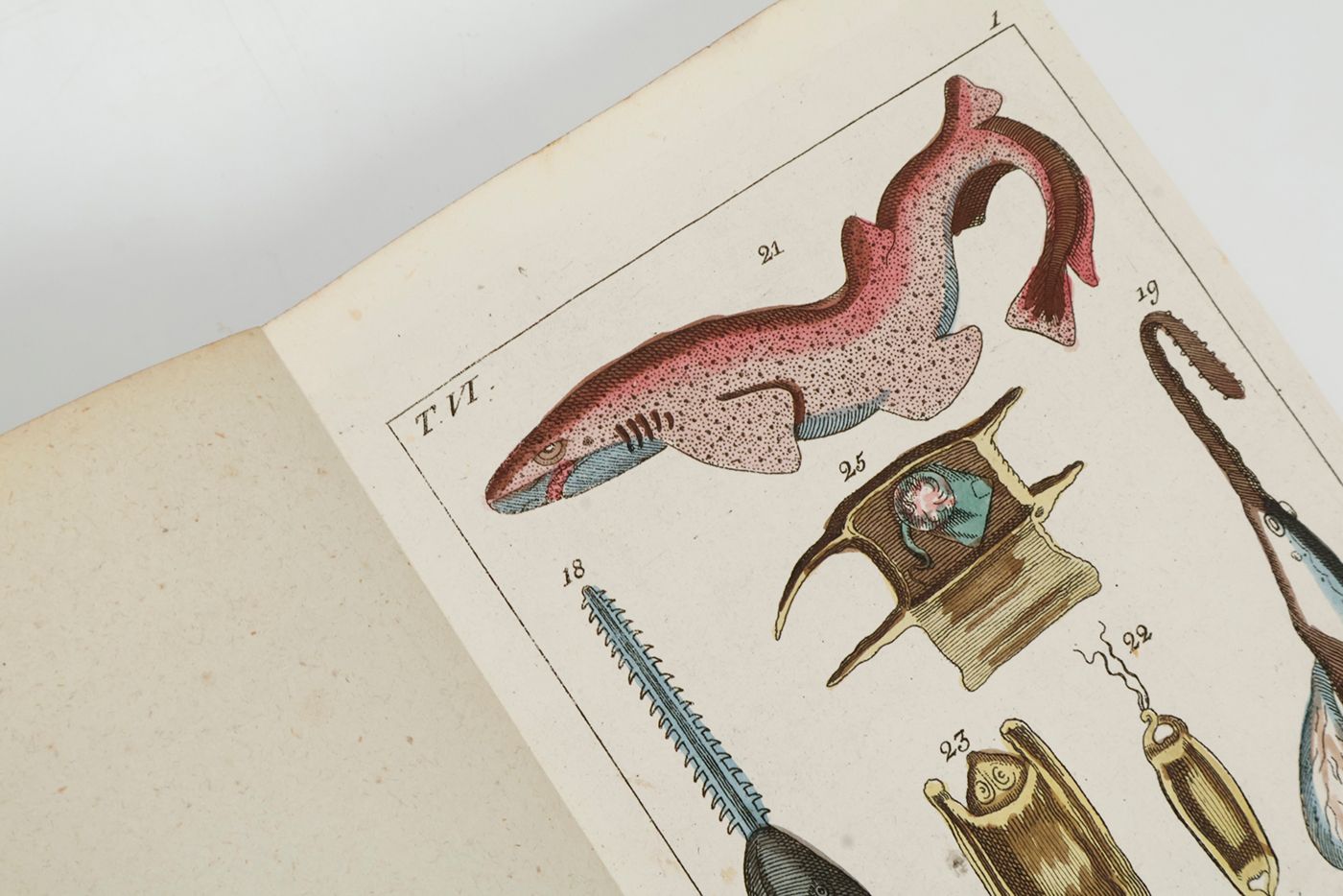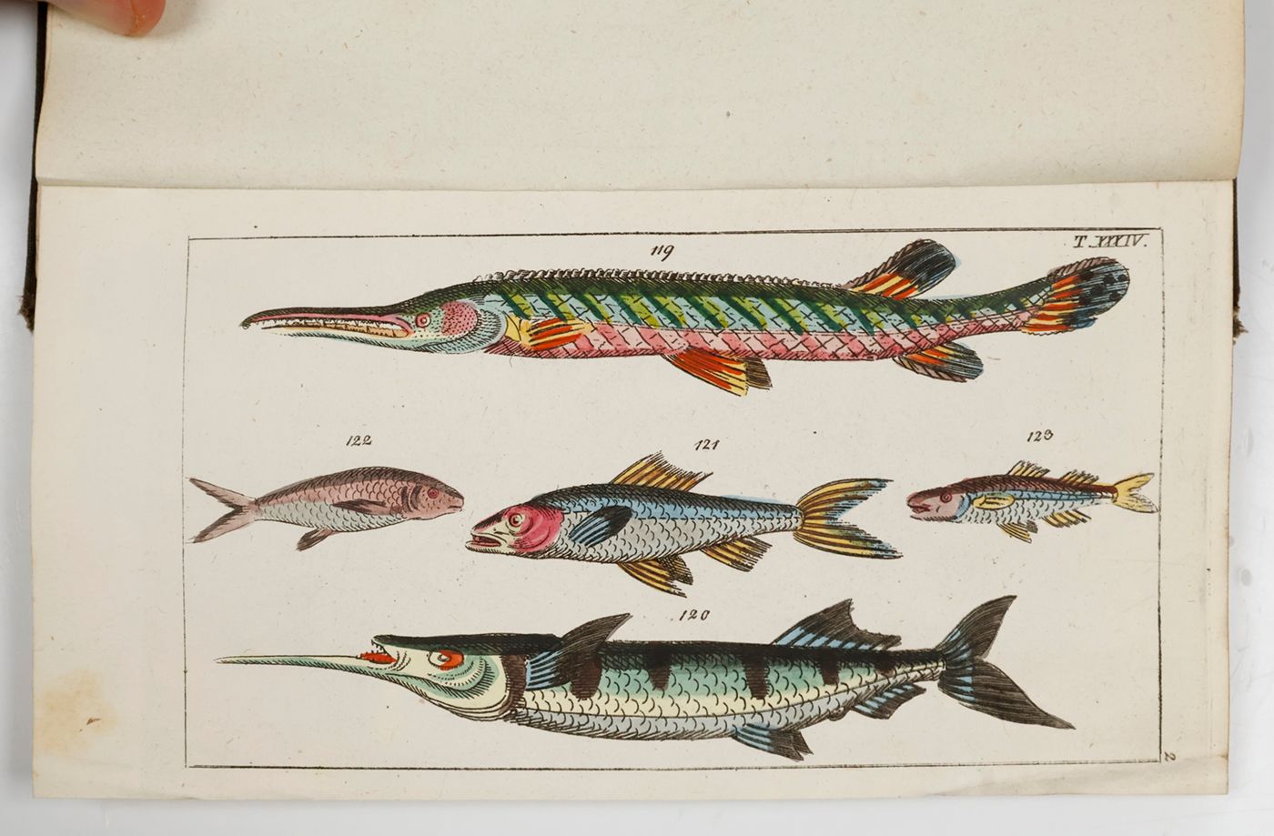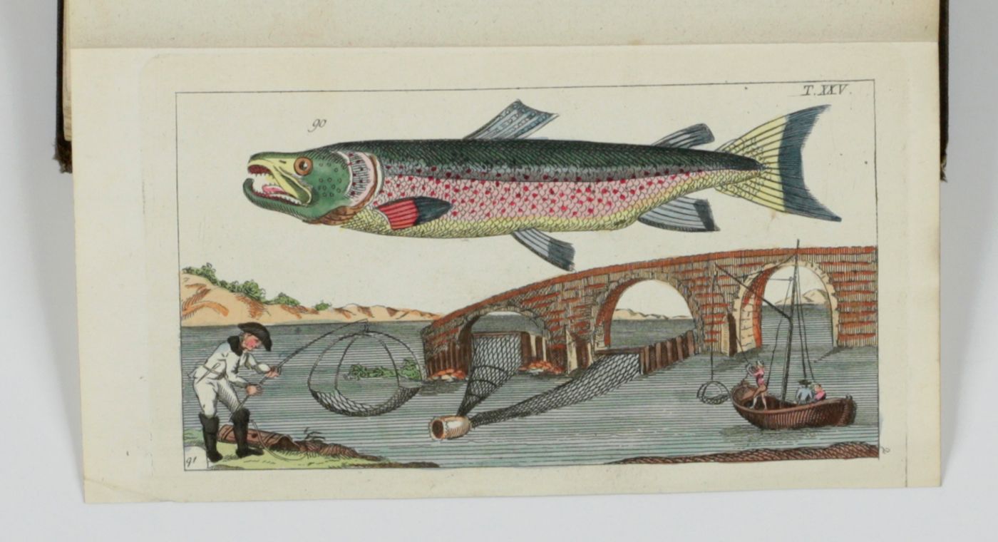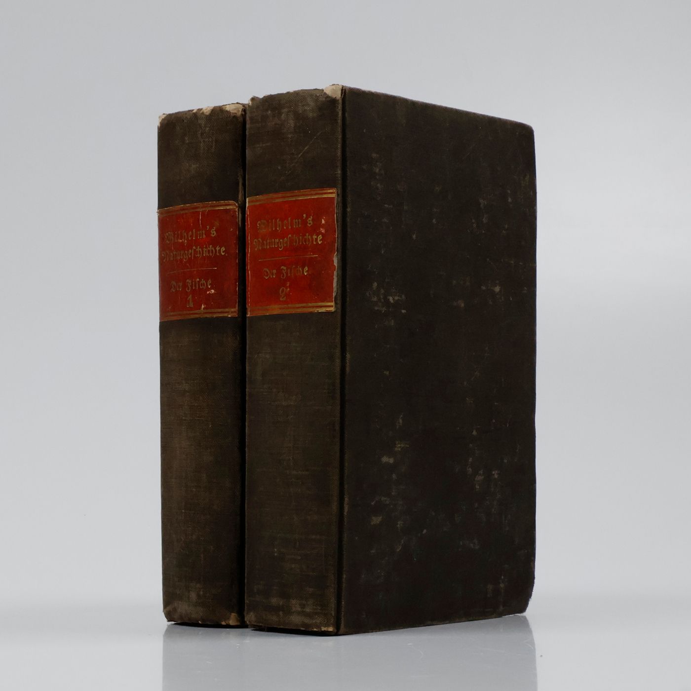 The complete ichthyology, and fishing, of a series of natural history works titled "Natural History stories", renowned for its plates, as much as for its texts, if not more so. Written by the German naturalist Gottlieb Tobias Wilhelm (1758-1811). This is the complete, second, unaltered edition, printed in Vienna. Many plates do not only show fish species, but also fishermen in action, showing different fishing techniques, e.g., trawling. A French edition was published too. Provenance: pictorial bookplate of the Swiss zoologist Christian Sigrist mounted on the front pastedowns. Boards with some light age-wear. Minimal spotting, here and there; the plates clean. The colouring is strong and very bright. Dean II, p. 630; Nissen ZBI 4408.